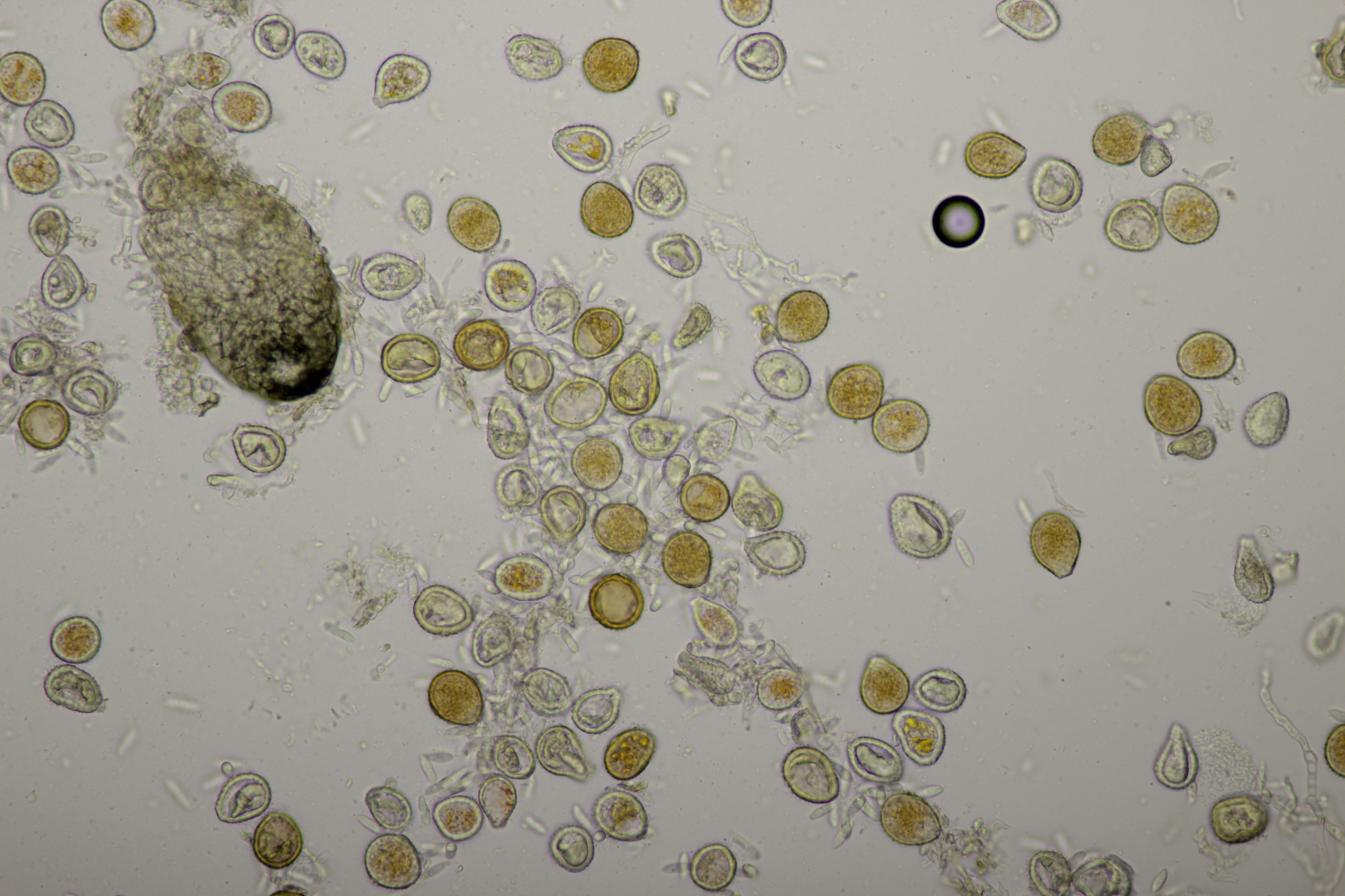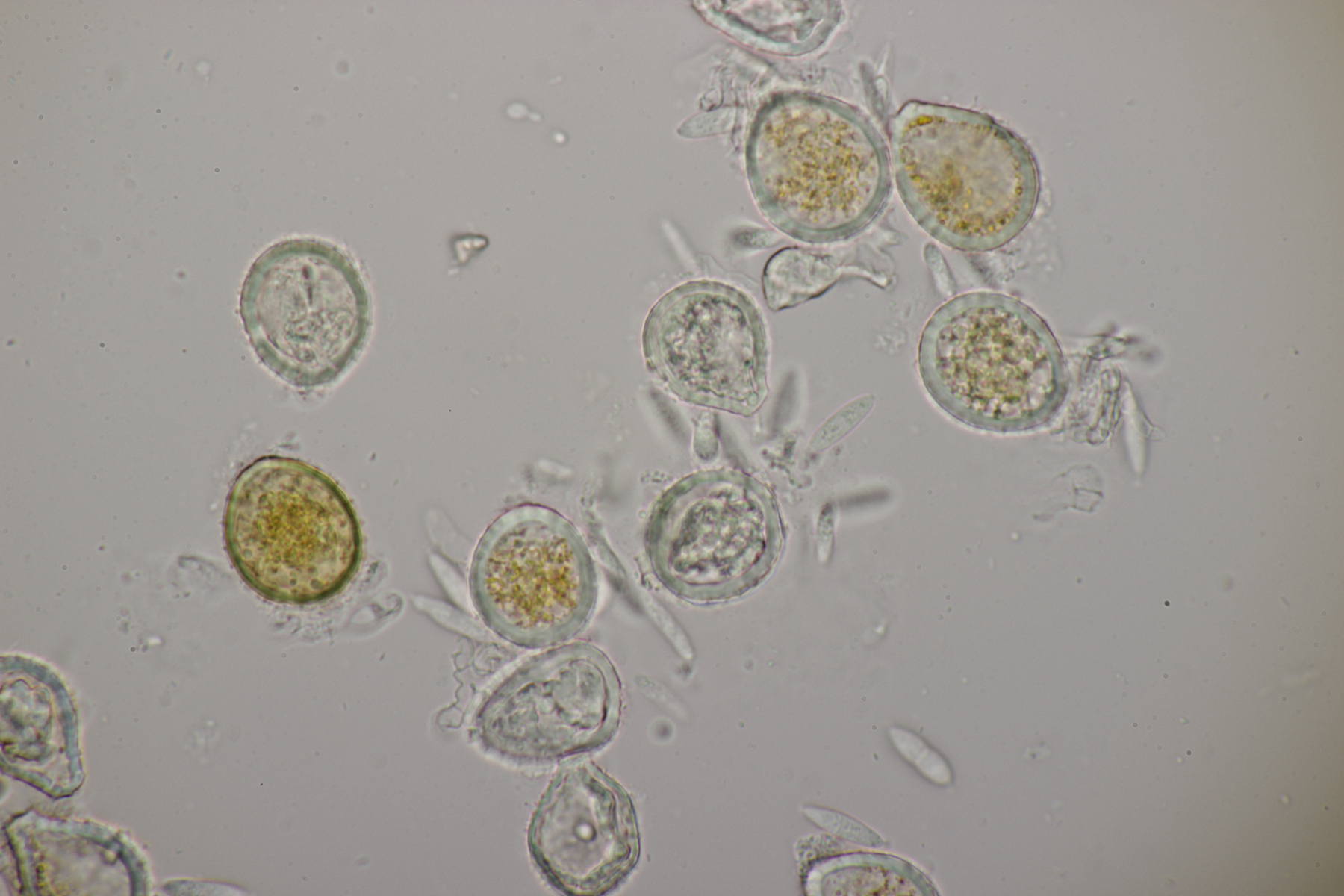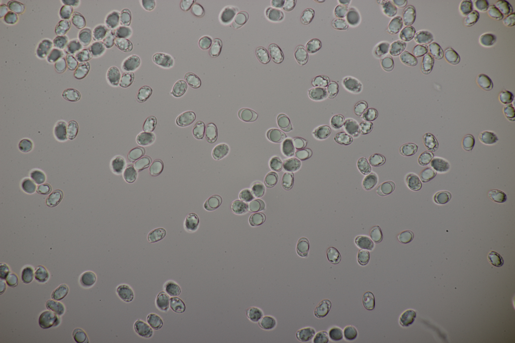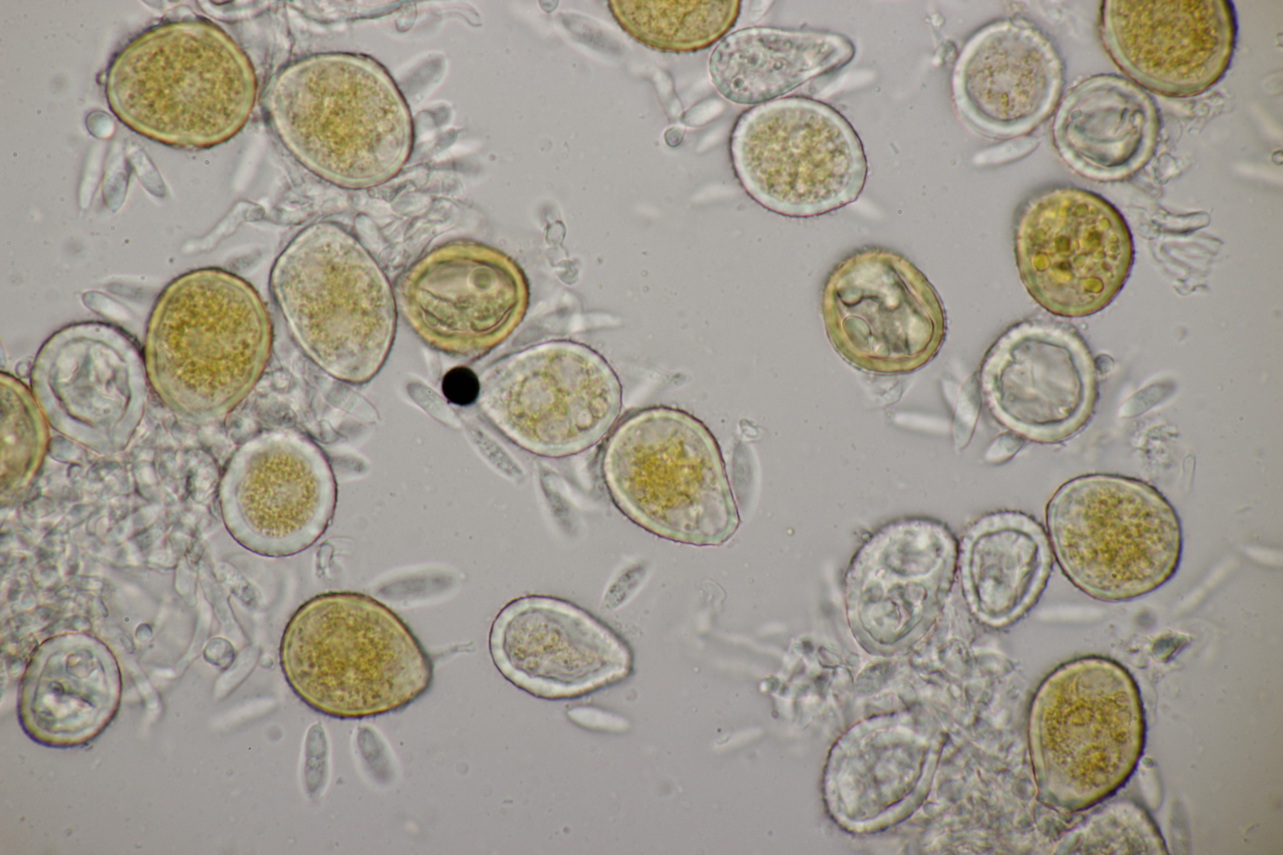 8. Nach jeder Menge Frühsport dann endlich die heißersehnten Flecken auf Bellis! Im Mikroskop fanden sich auch Sporen, die aber alle um die 10 µm groß sind. Also nicht der gesuchte Protomycopsis sondern Entyloma bellidis ex Bellis perennis. Aber auch das ein Erstfund für mich.