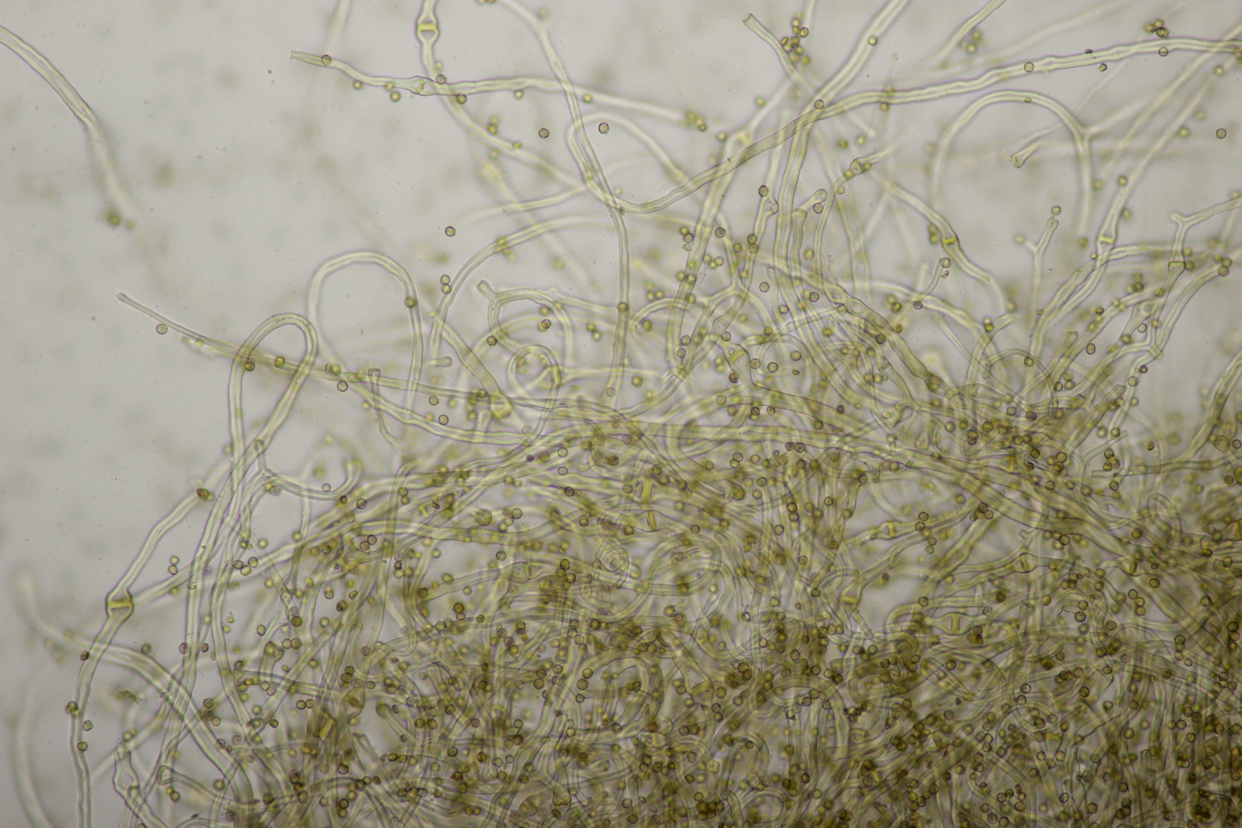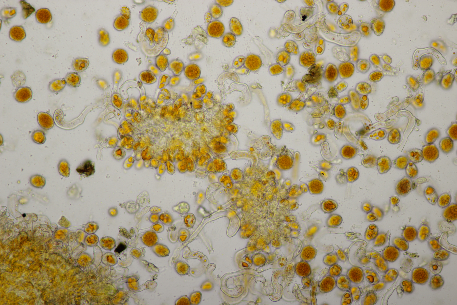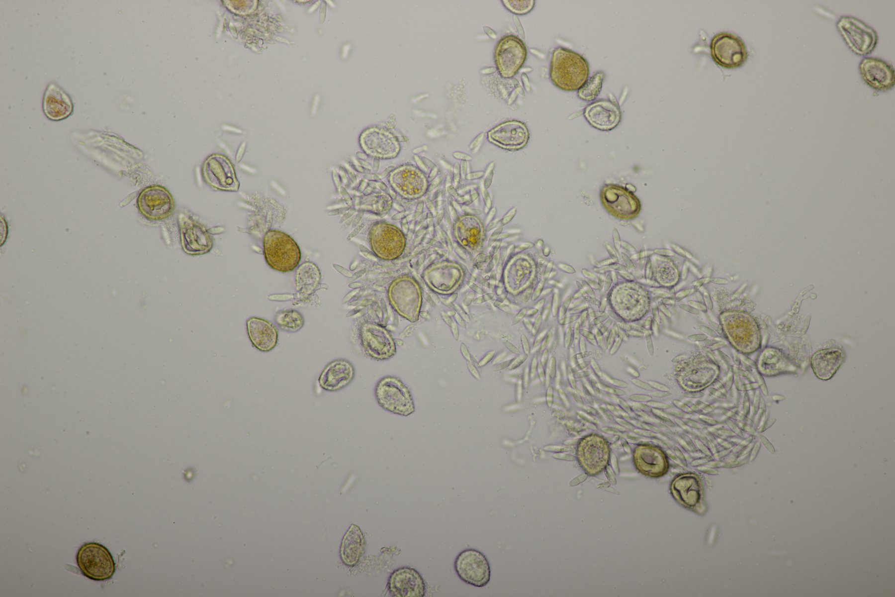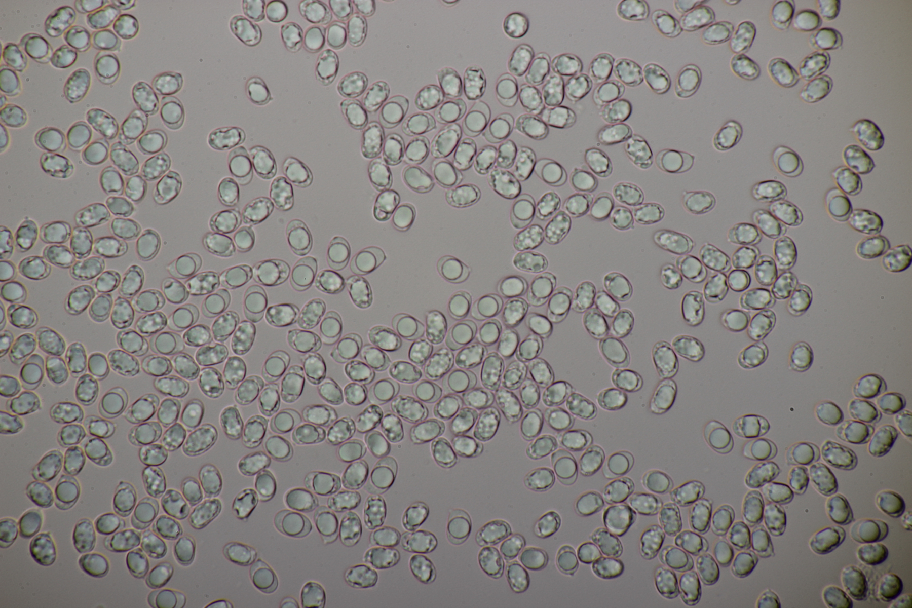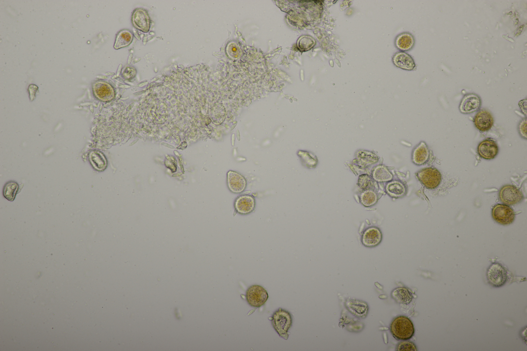 8. Nach jeder Menge Frühsport dann endlich die heißersehnten Flecken auf Bellis! Im Mikroskop fanden sich auch Sporen, die aber alle um die 10 µm groß sind. Also nicht der gesuchte Protomycopsis sondern Entyloma bellidis ex Bellis perennis. Aber auch das ein Erstfund für mich.