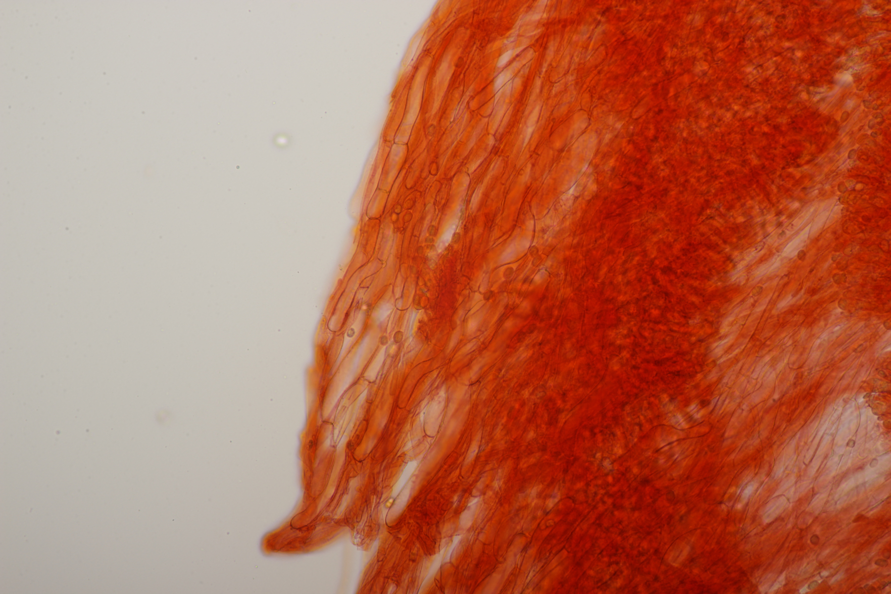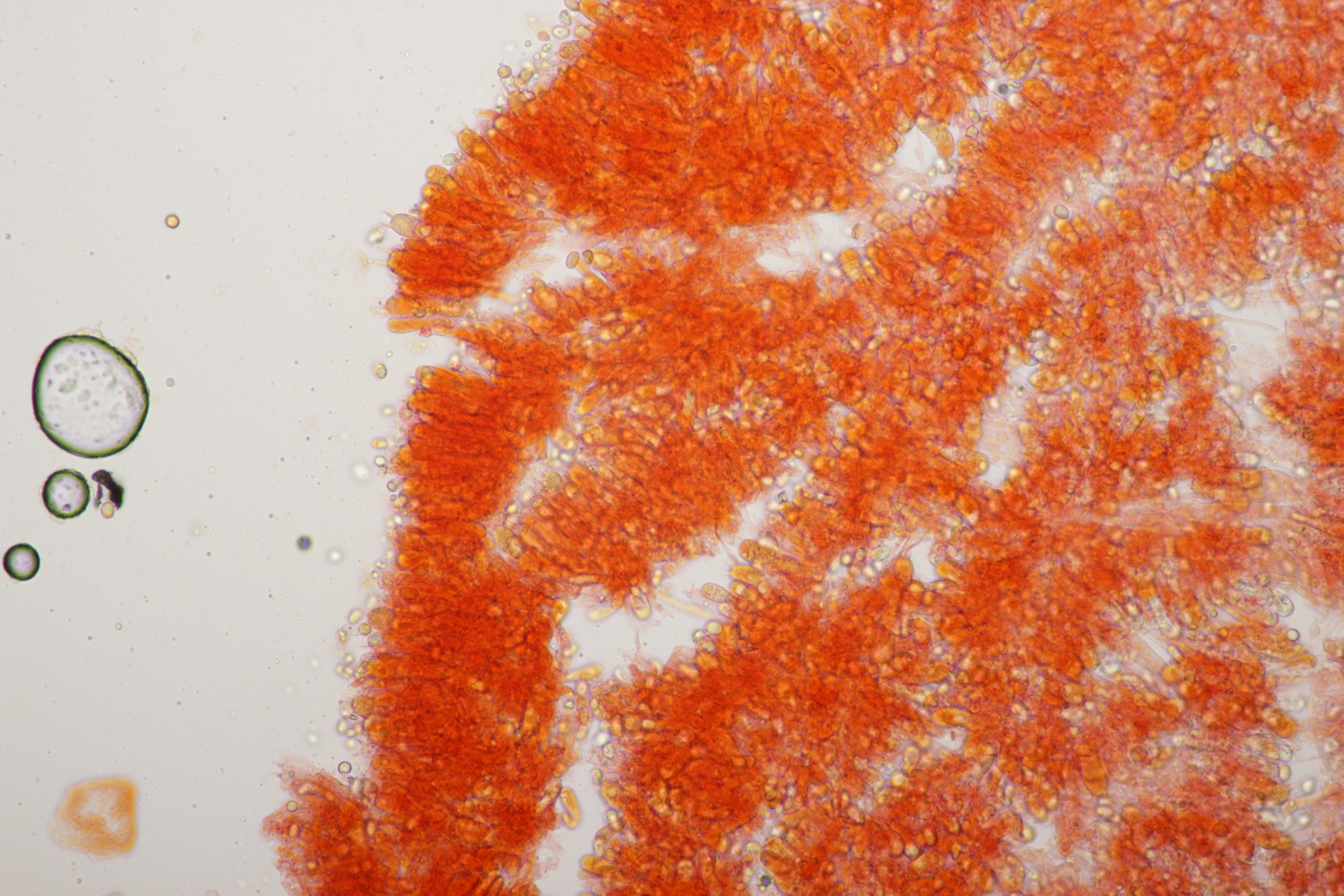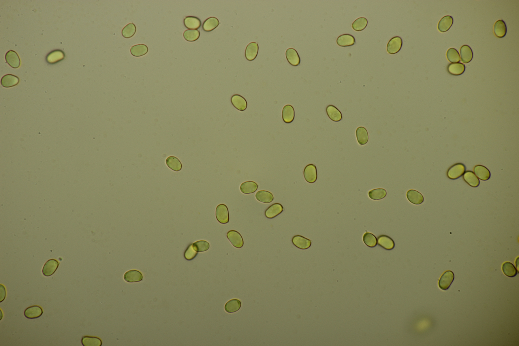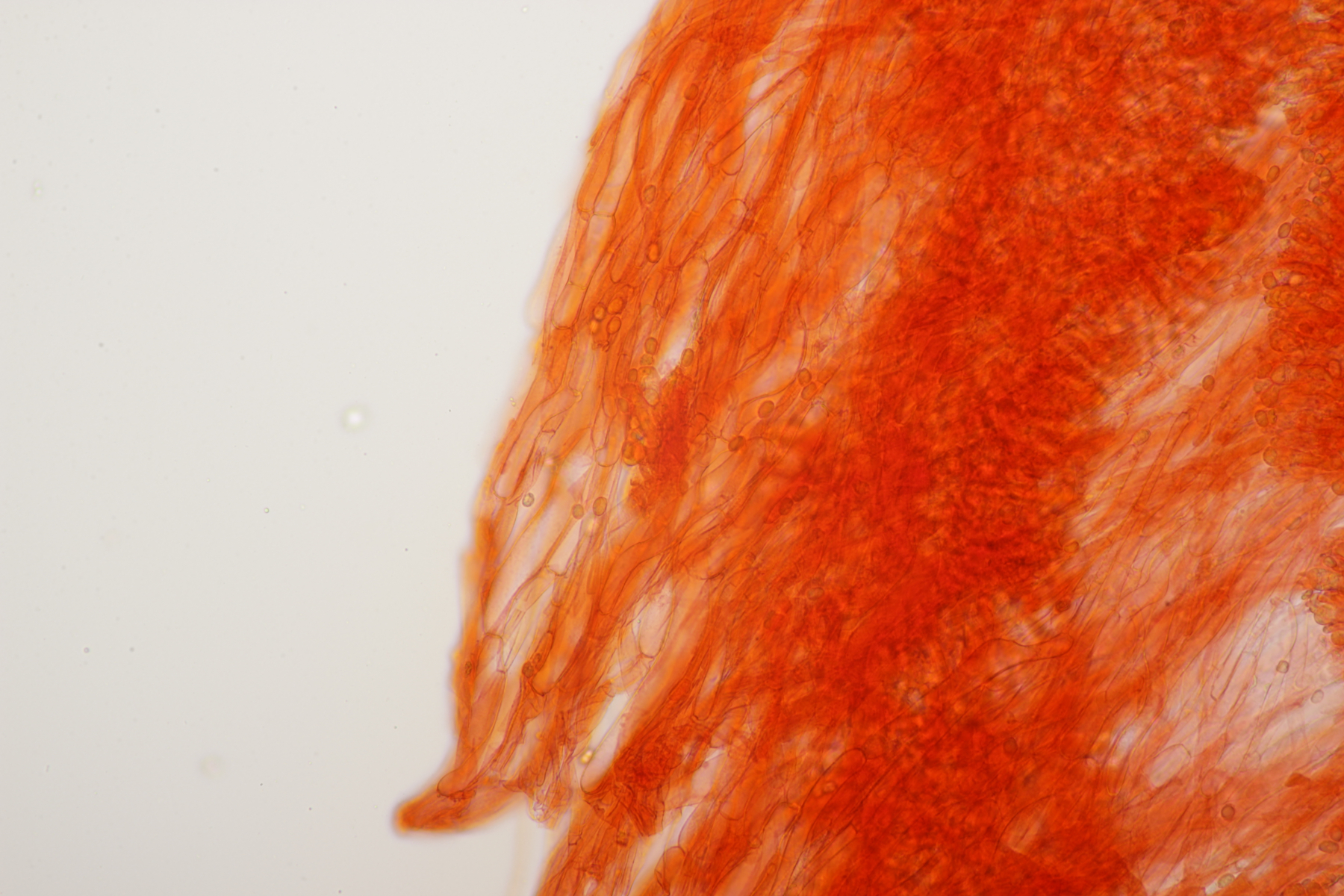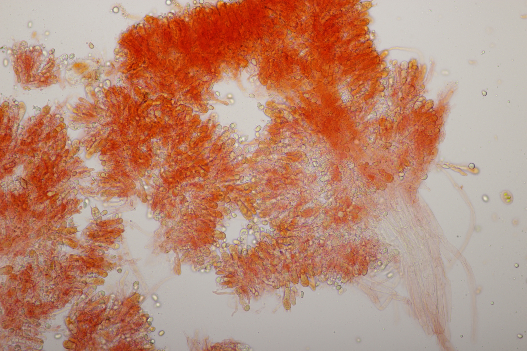 5. Hier stehe ich auf dem Schlauch. Eine Omphalina? Schnallen vorhanden, Zystiden gibt es keine, wobei sich teilweise längliche, sehr dünne Zellen an der Lamellenschneide fanden. Sporengröße (8.4+-0.4) µm x (5.4+-0.3) µm