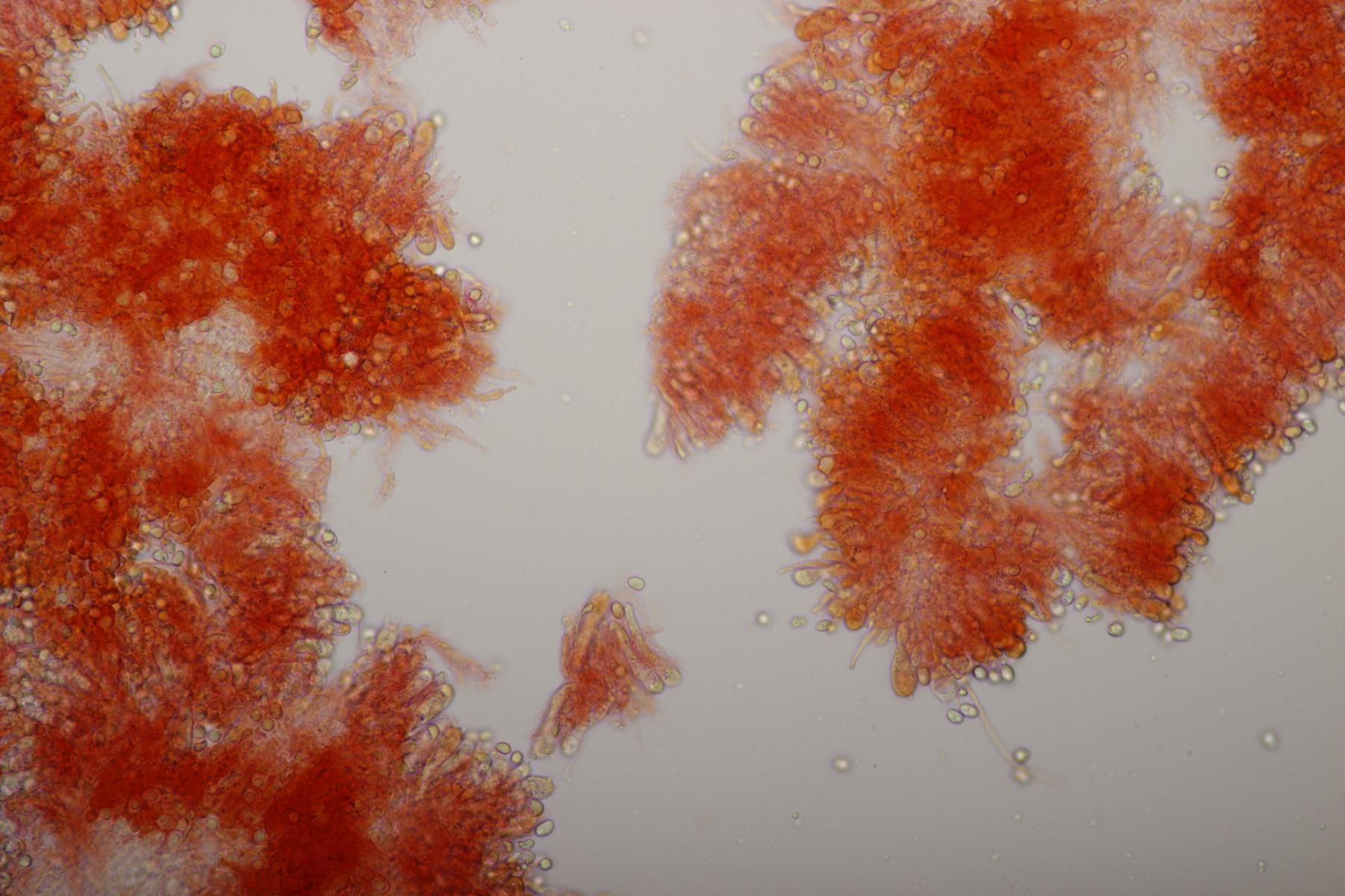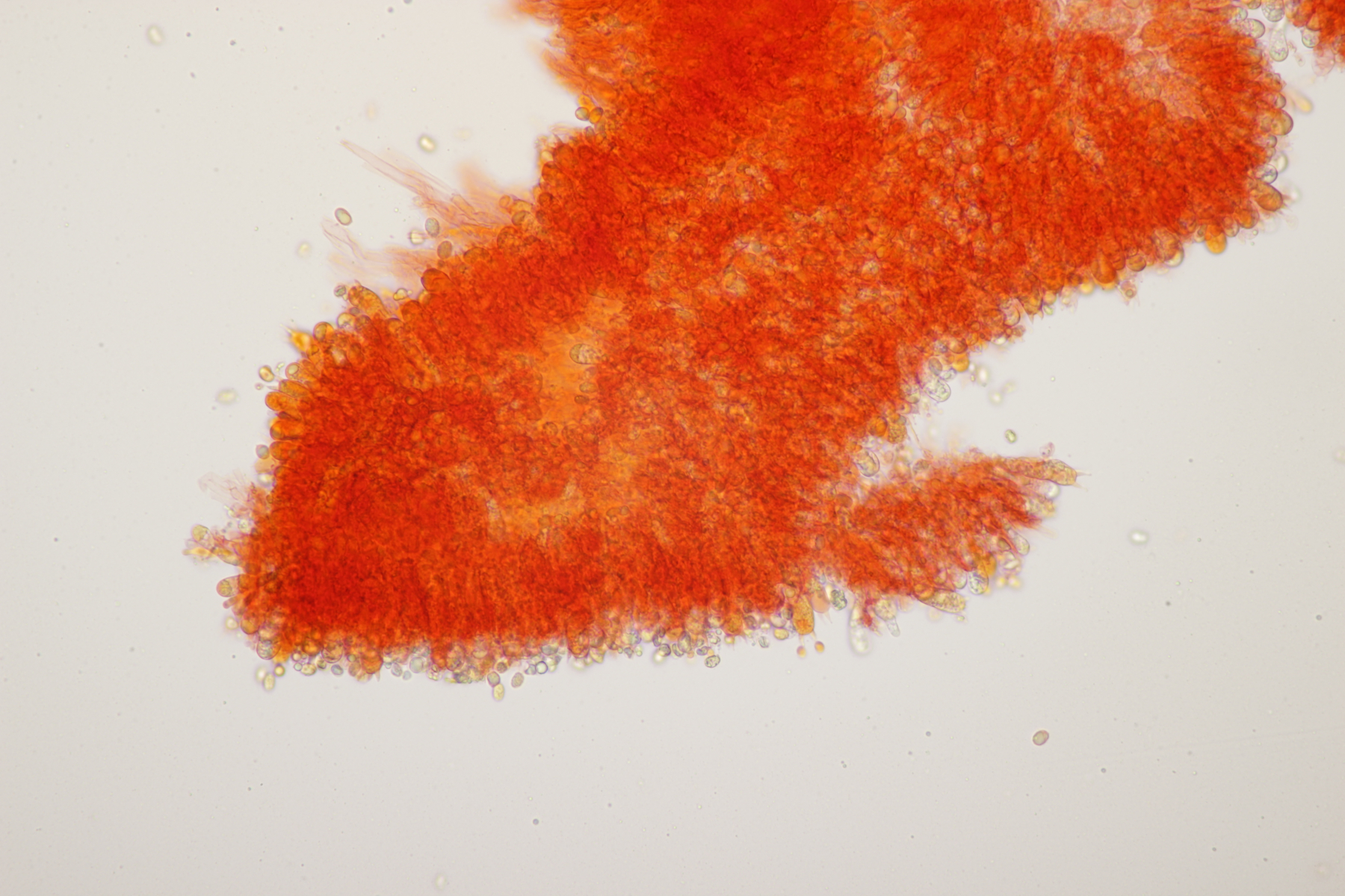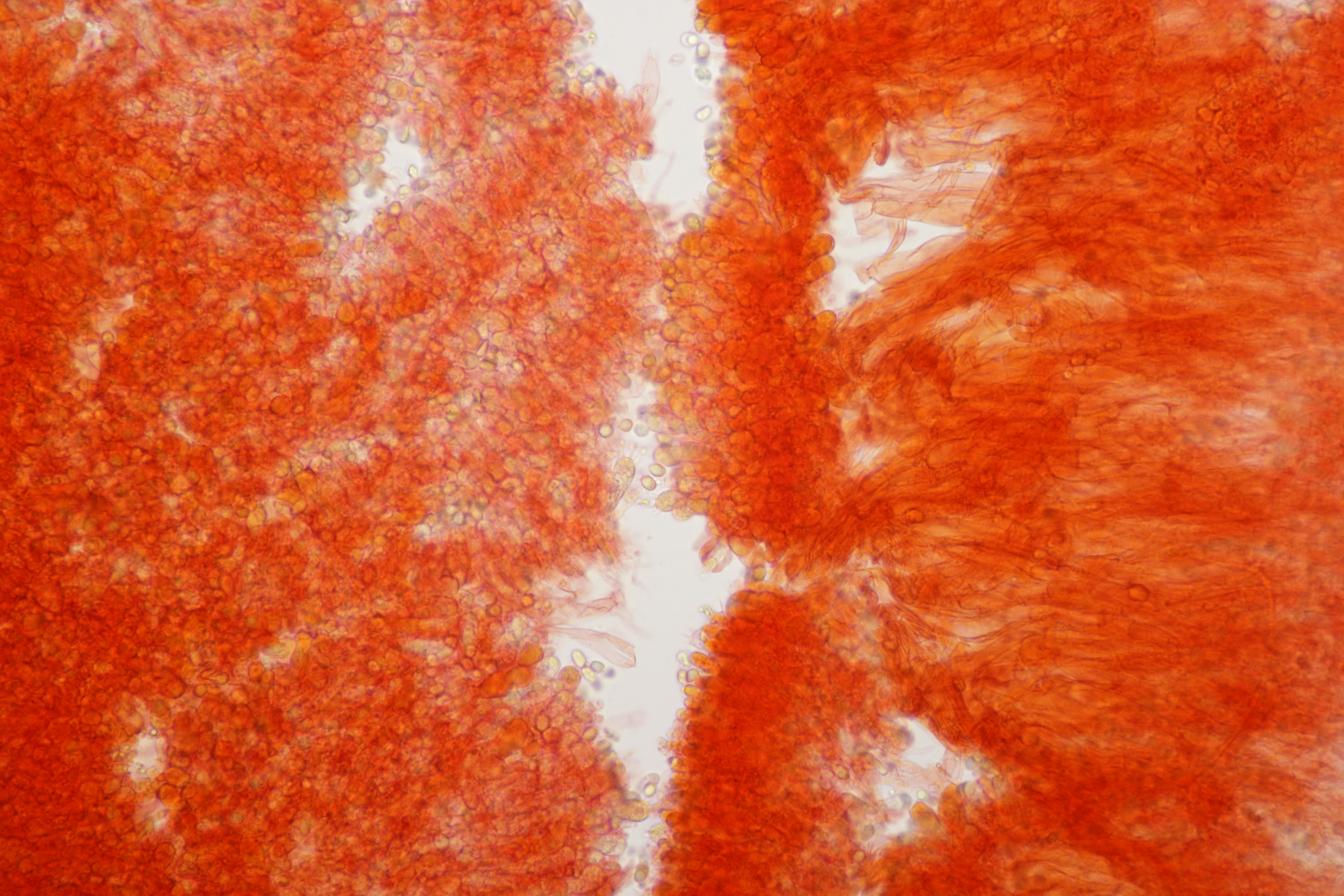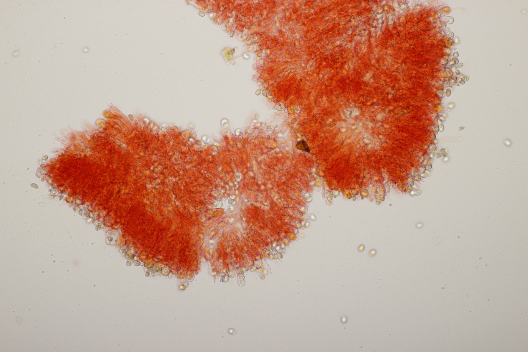 5. Hier stehe ich auf dem Schlauch. Eine Omphalina? Schnallen vorhanden, Zystiden gibt es keine, wobei sich teilweise längliche, sehr dünne Zellen an der Lamellenschneide fanden. Sporengröße (8.4+-0.4) µm x (5.4+-0.3) µm