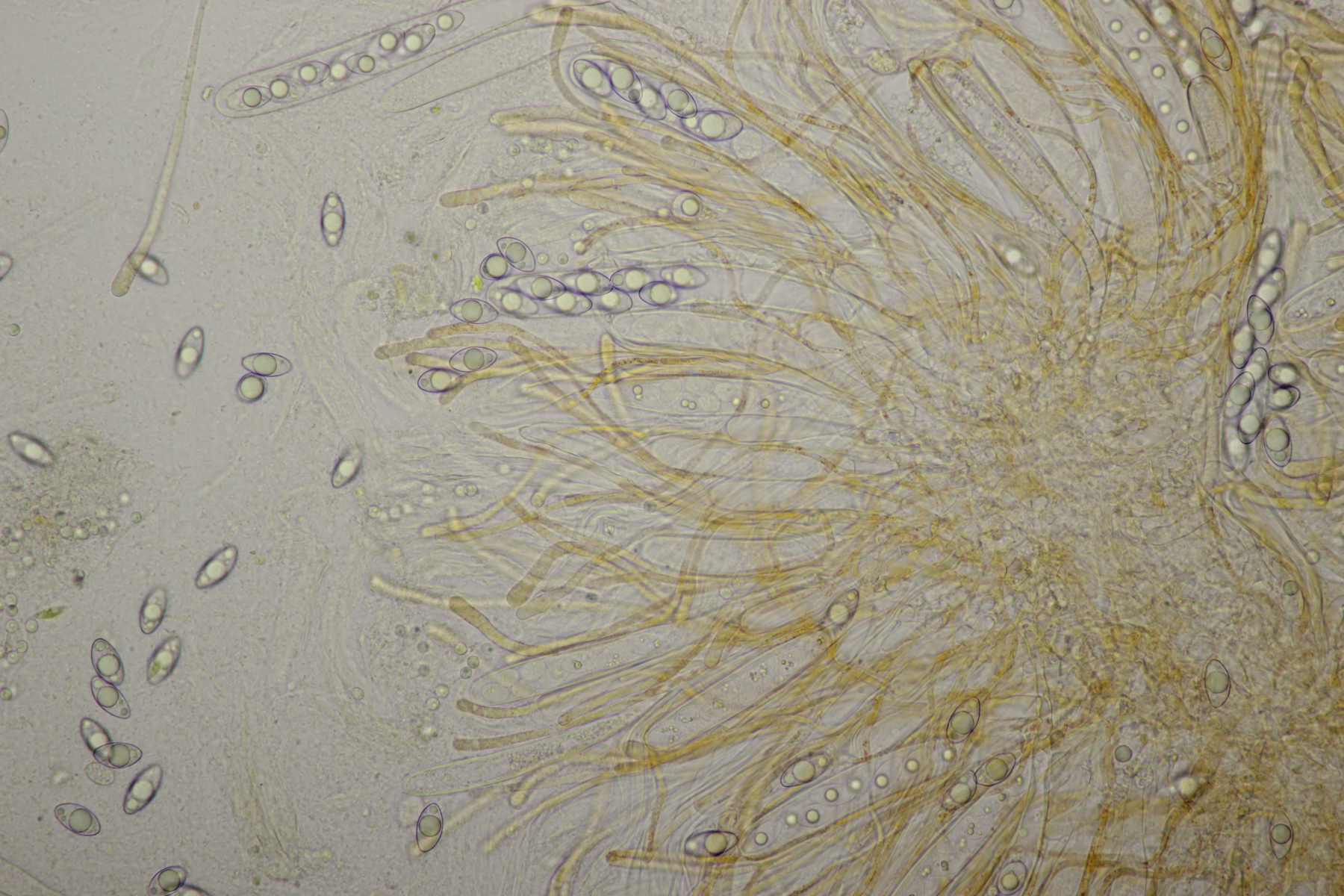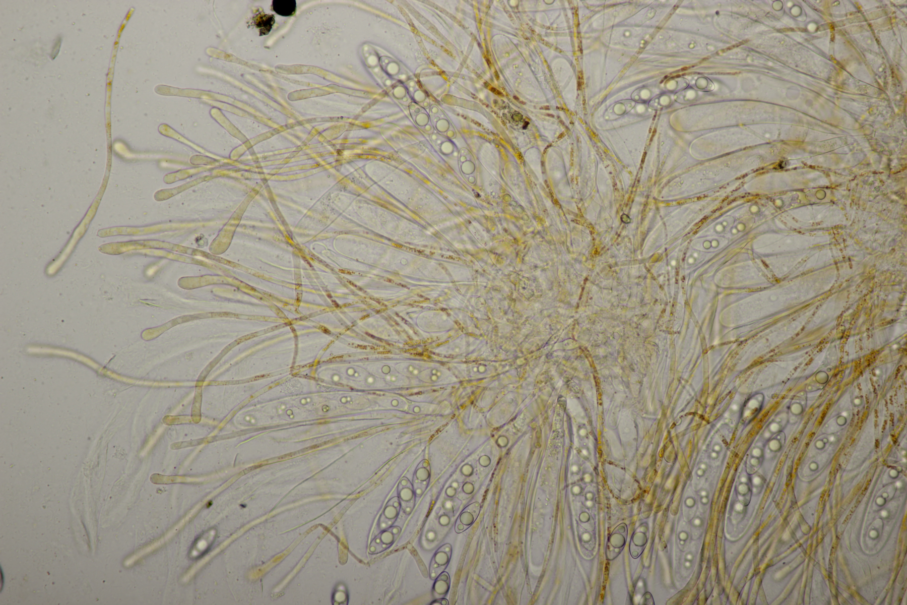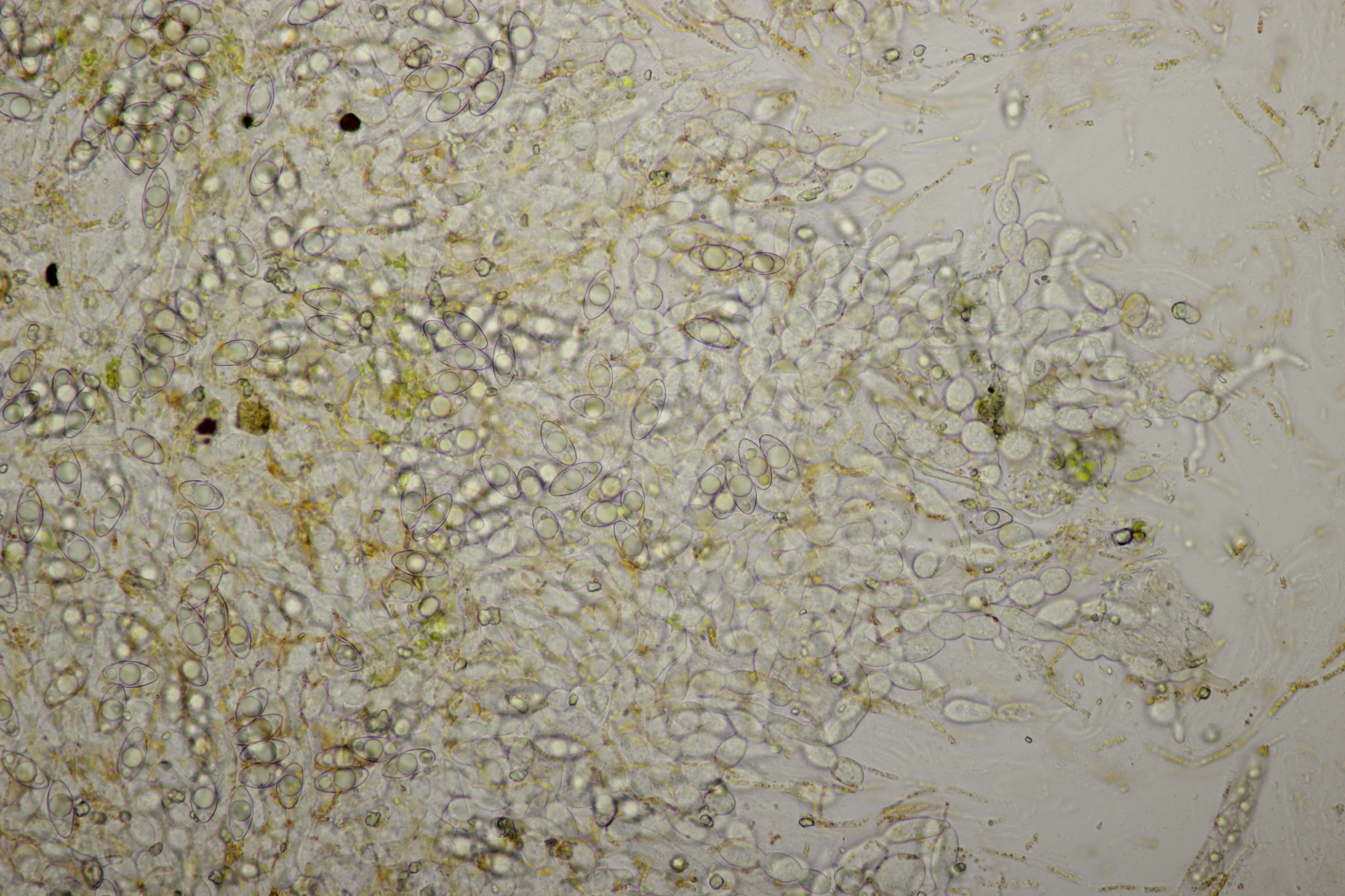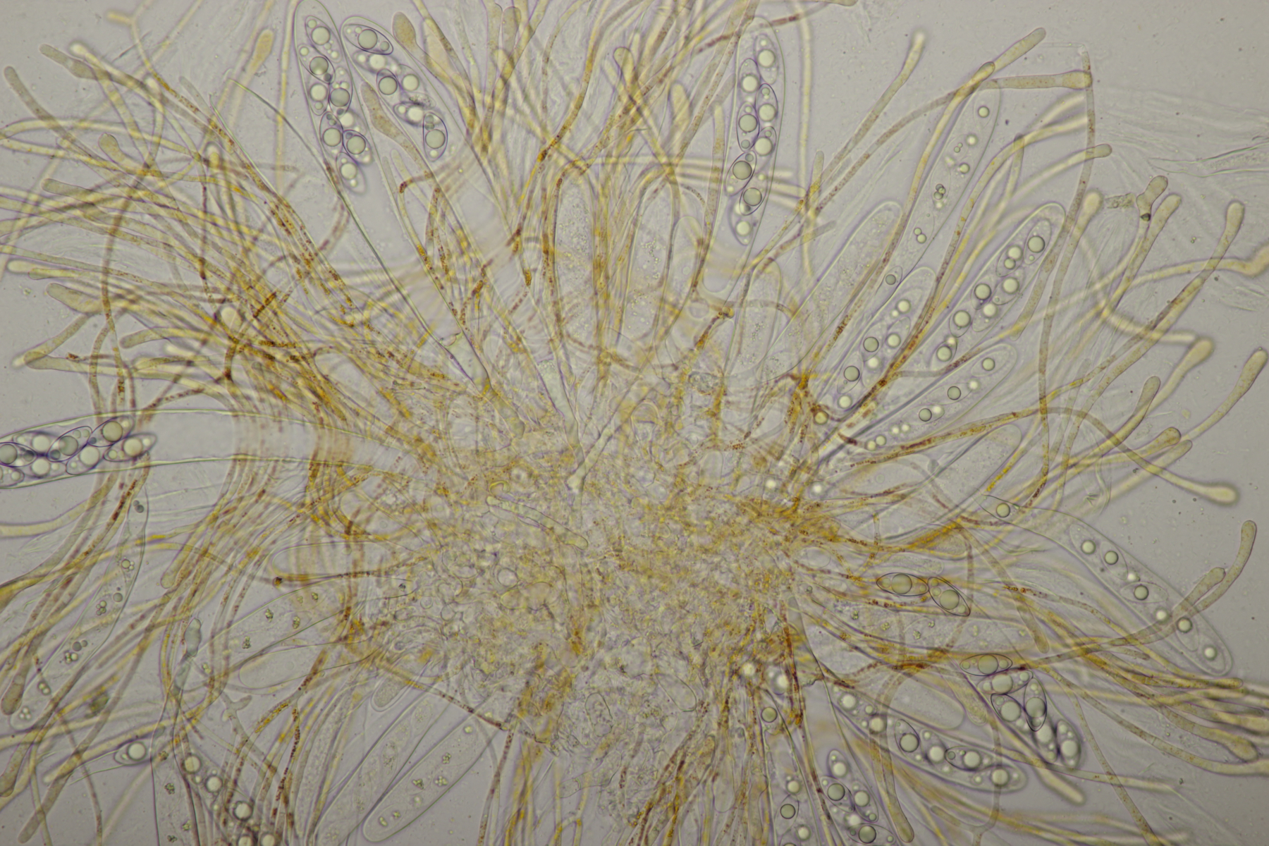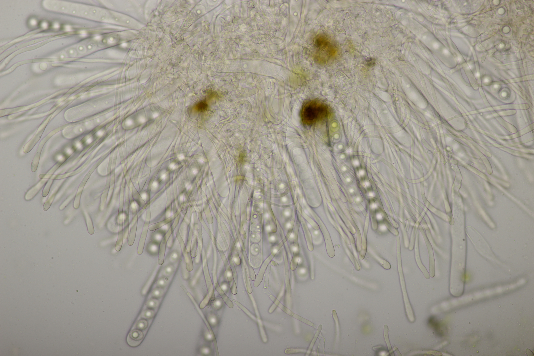 1. Dieser Moosbecherling hat seine besten Tage wohl schon hinter sich gehabt. Asci waren keine mehr zu erkennen und Paraphysen eigentlich auch nicht, dafür aber jede Menge reife Sporen, die teilweise schon wild auskeimten. Sporengröße um 22 µm x 10 µm, was dann für Octospora gemmicola spricht.