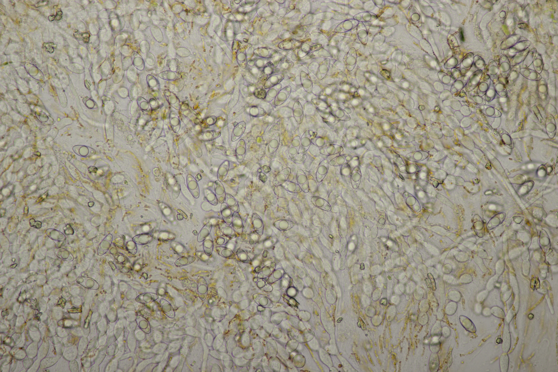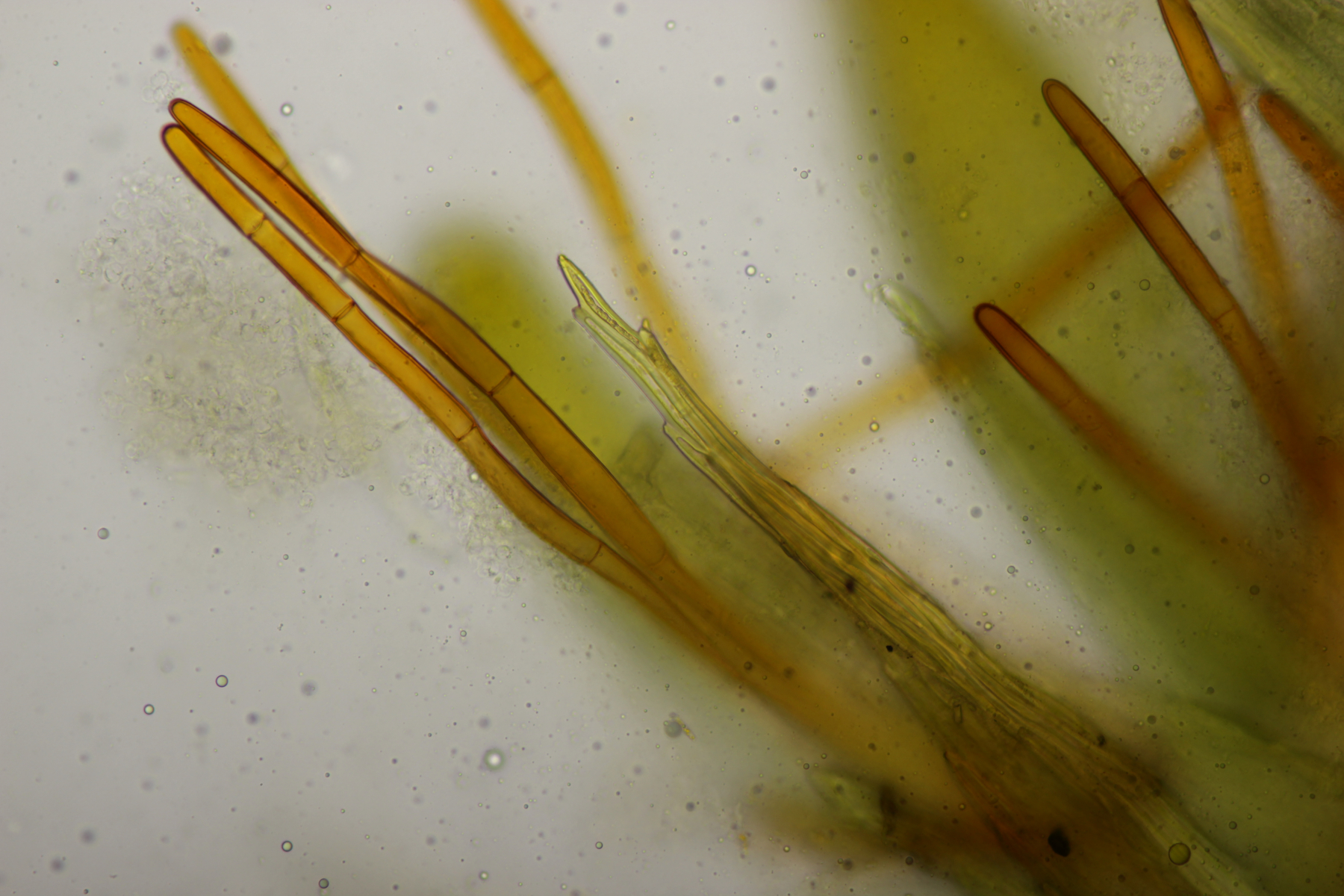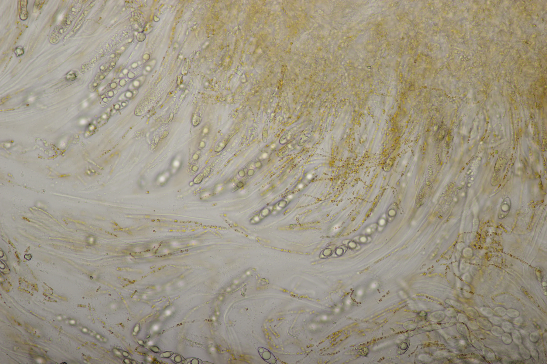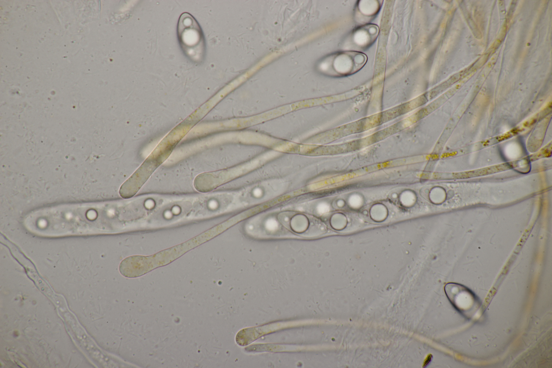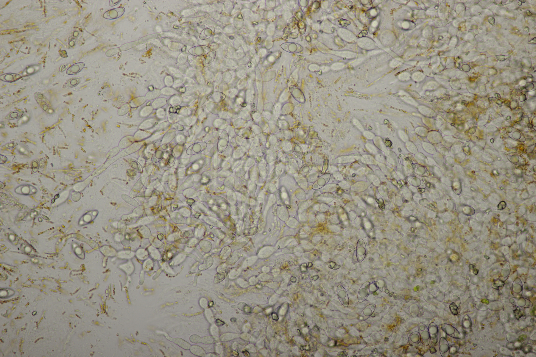 1. Dieser Moosbecherling hat seine besten Tage wohl schon hinter sich gehabt. Asci waren keine mehr zu erkennen und Paraphysen eigentlich auch nicht, dafür aber jede Menge reife Sporen, die teilweise schon wild auskeimten. Sporengröße um 22 µm x 10 µm, was dann für Octospora gemmicola spricht.