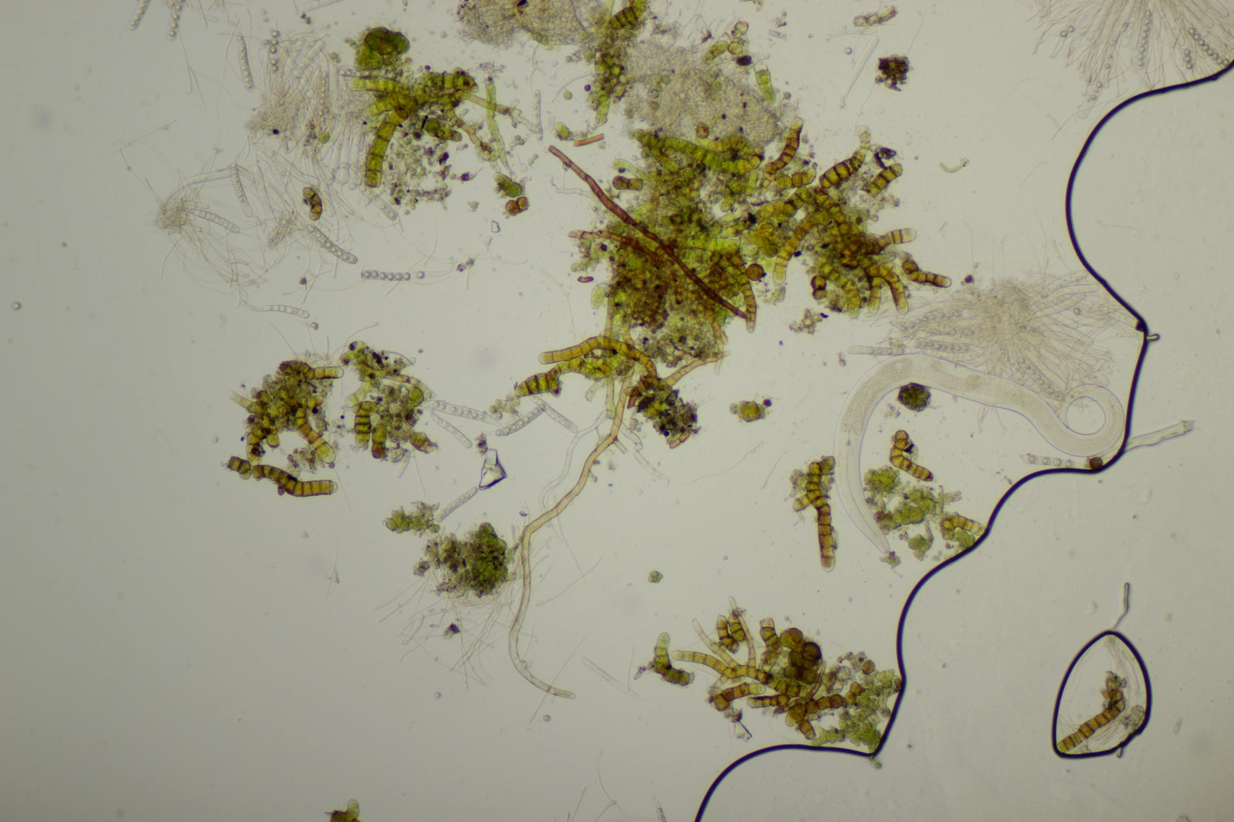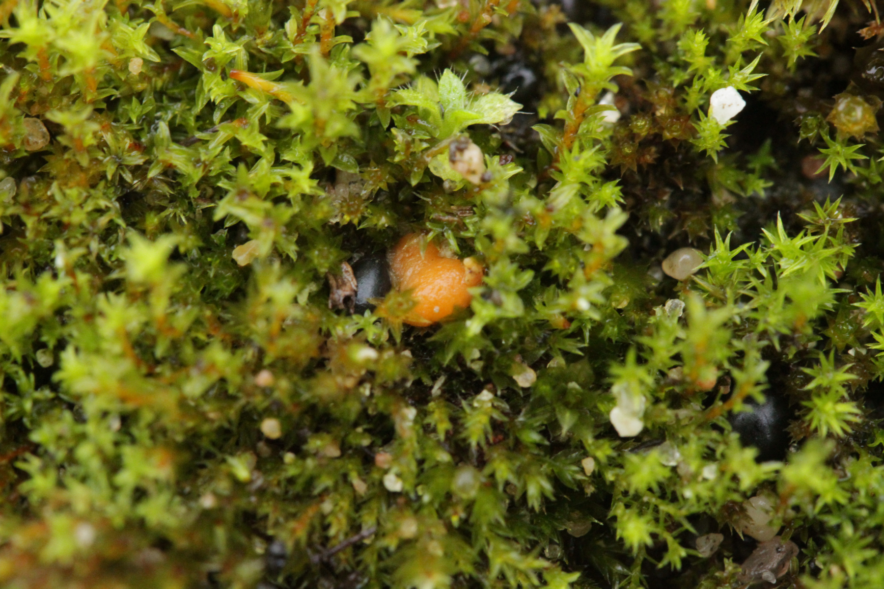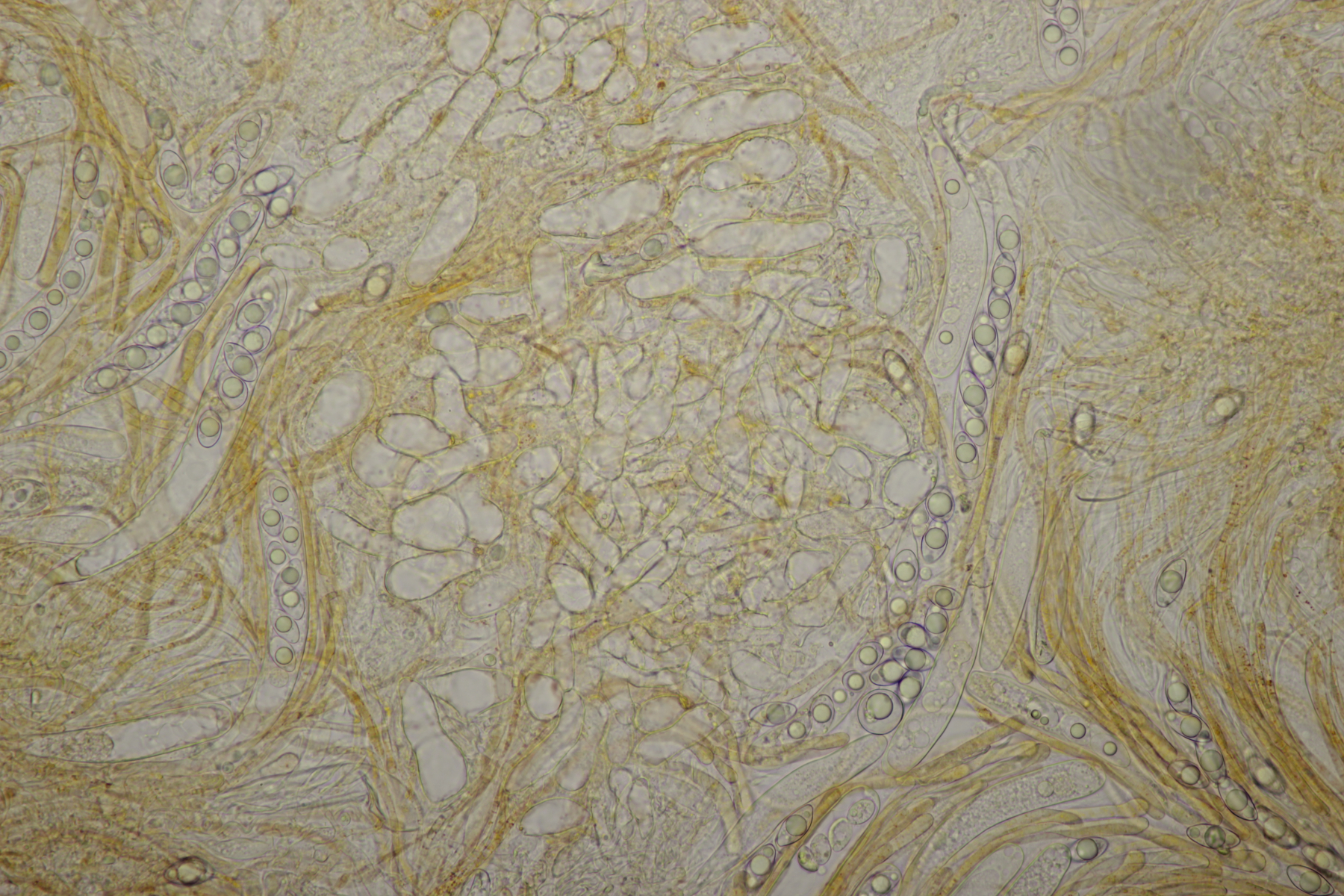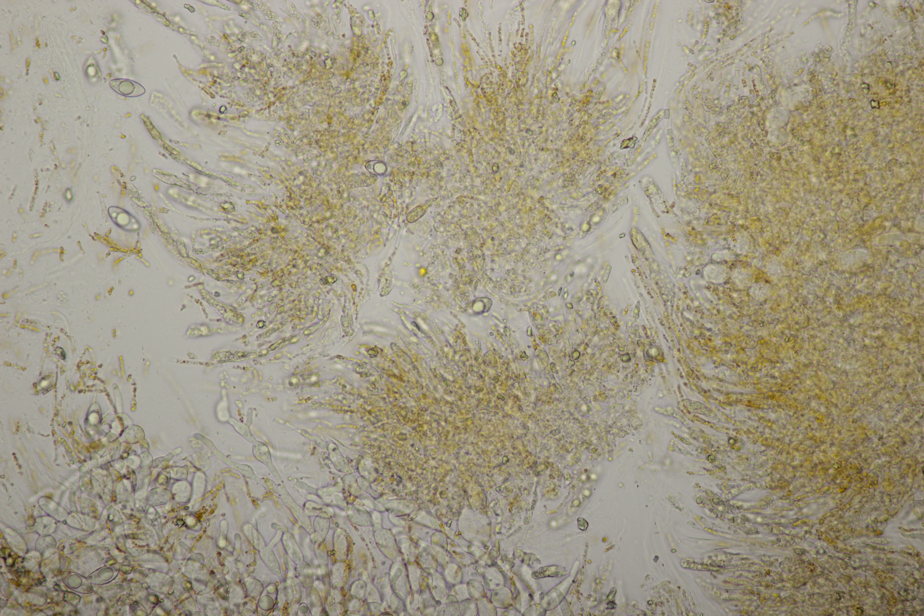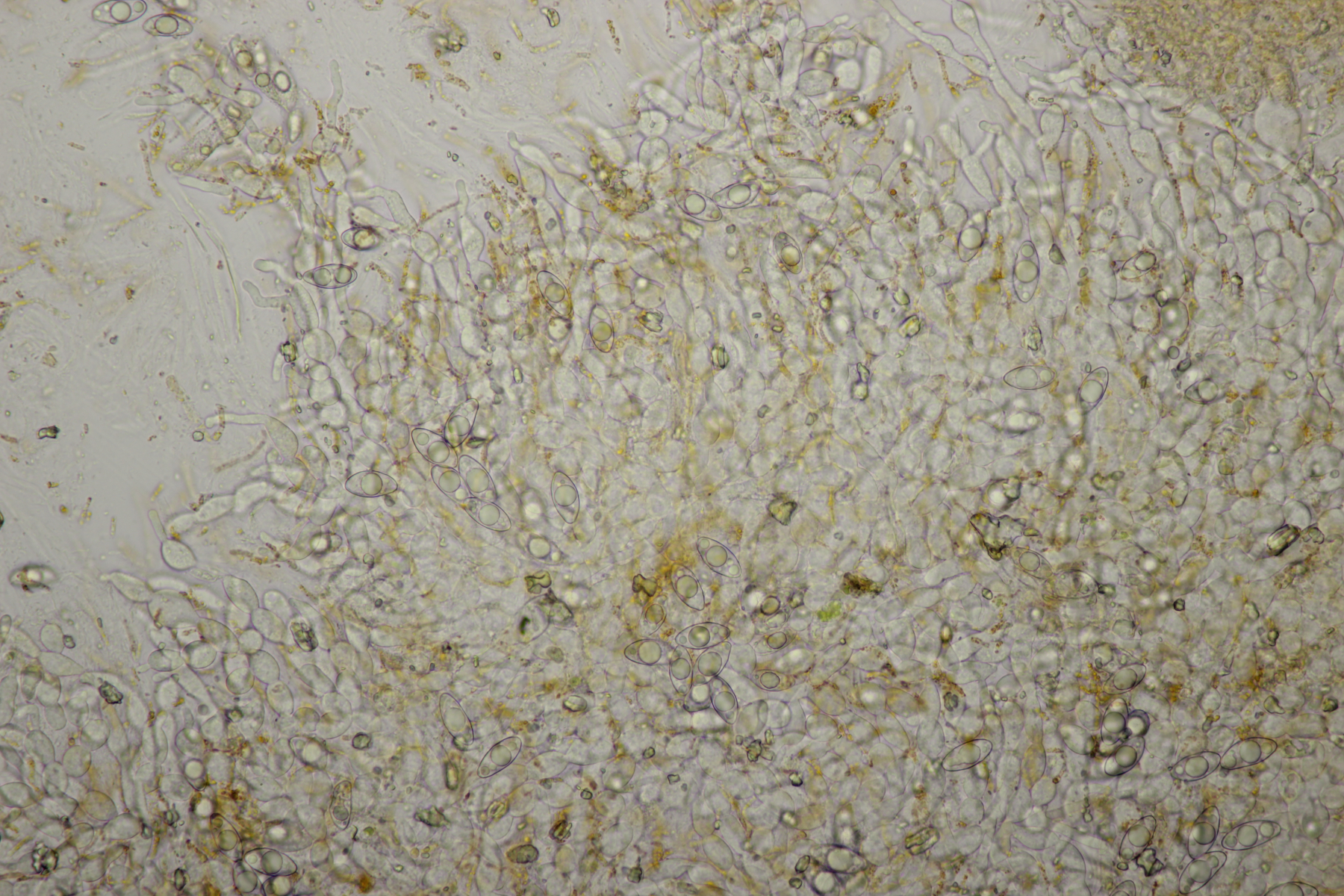 1. Dieser Moosbecherling hat seine besten Tage wohl schon hinter sich gehabt. Asci waren keine mehr zu erkennen und Paraphysen eigentlich auch nicht, dafür aber jede Menge reife Sporen, die teilweise schon wild auskeimten. Sporengröße um 22 µm x 10 µm, was dann für Octospora gemmicola spricht.