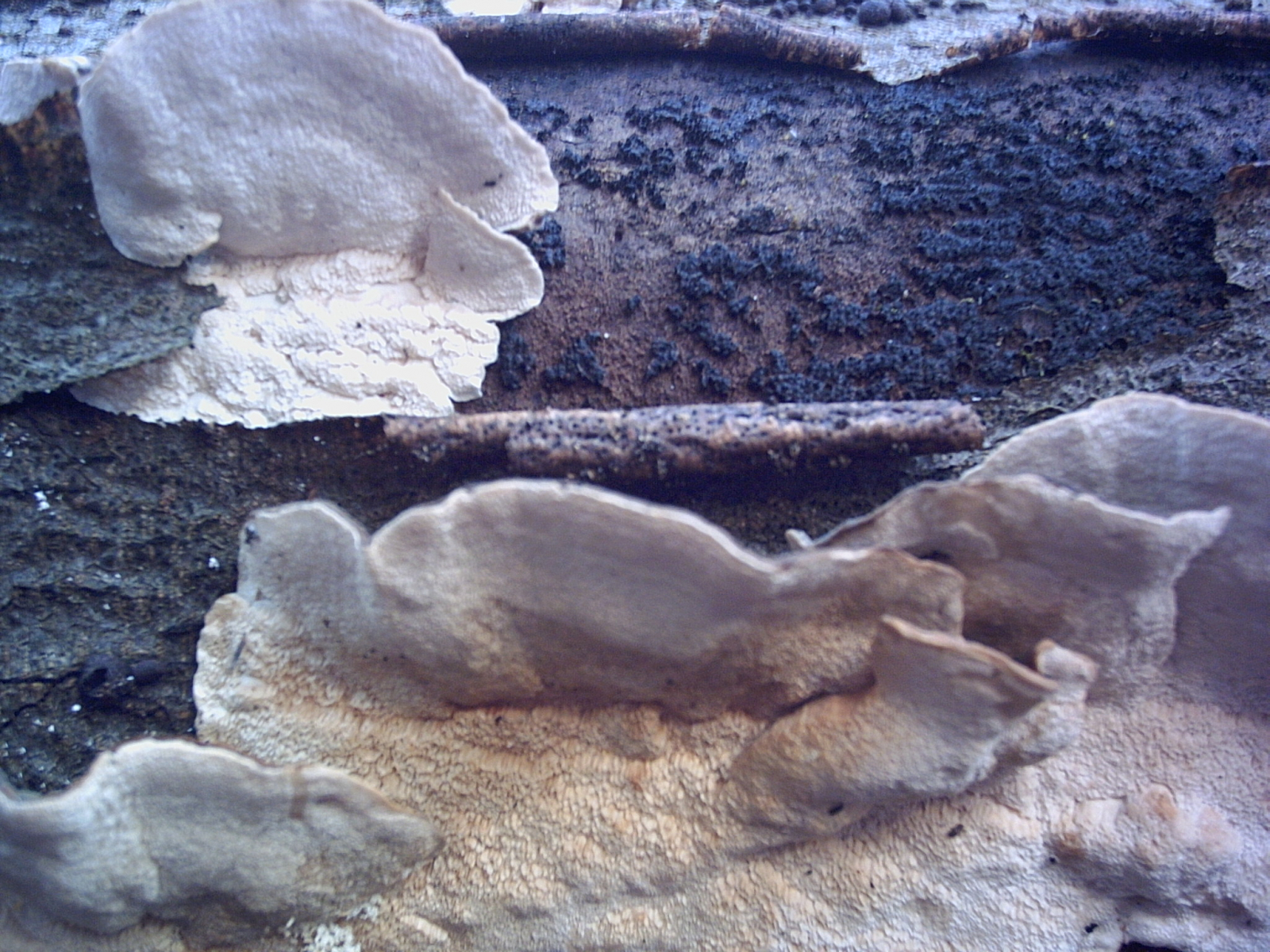 Ich vermute auf Schmetterlingstramete (Trametes versicolor) und Ockerfarbene Tramete (Trametes ochracea).