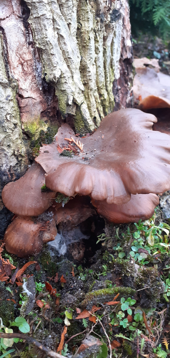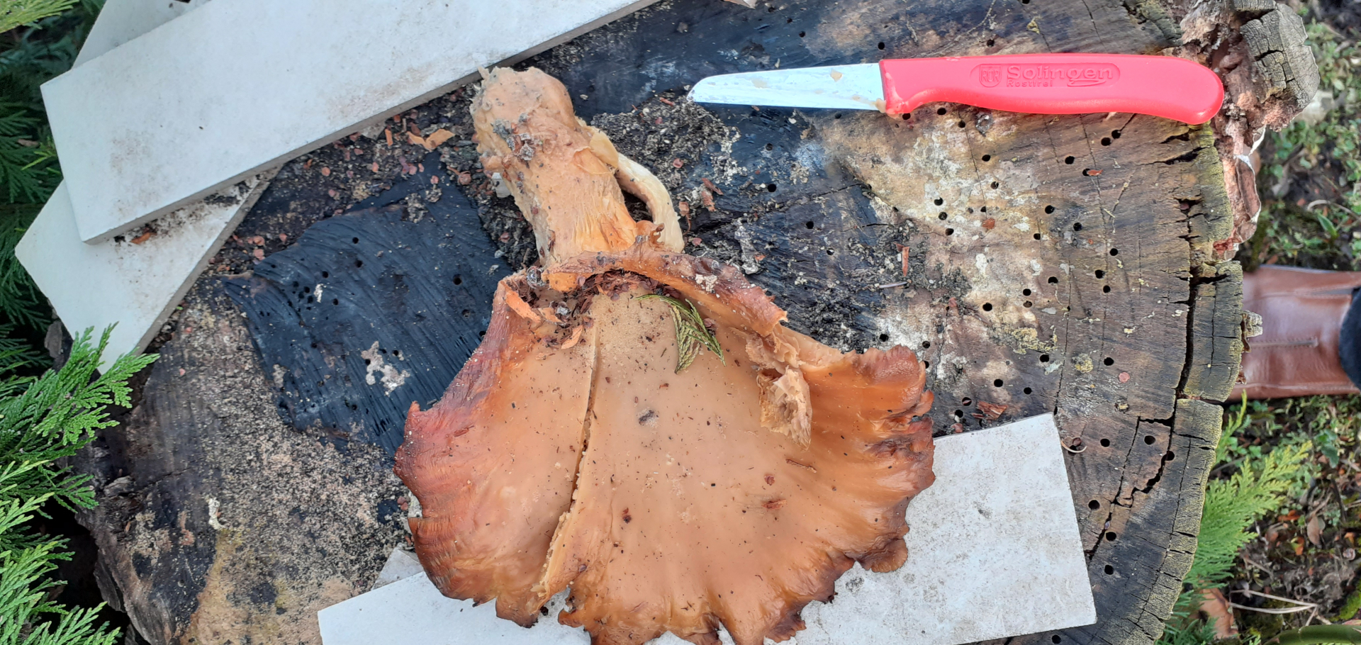 "Vor etwa 8 Jahren fällte ich auf unserem Grundstück einen Walnussbaum, an dessen Reststamm seit Jahren Pilze im Herbst, Winter und Frühjahr wachsen.