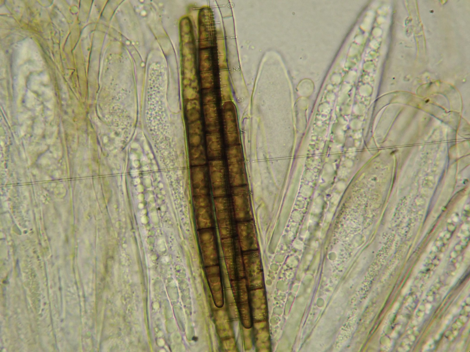 ich habe das Ringlicht drauf, Licht allerdings aus. So nahe wie möglich ranhalten, manuell fokussieren und ganz reinzoomen. Ein Mikrometerokular hilft da ganz gut, dann noch ein bisschen weiter, dann ist die Bildebene scharf. Das geht ganz okay, natürlich geht durch den Zoom Schärfe verloren. Für schnelle Schnappschüsse ganz ok geeignet, in Öl wirds schon sehr matschig. Das sollte hier 400x sein. Fotografieren durch die Okulare der Stereolupe funktioniert schlecht bis gar nicht, die Fotos werden zu dunkel und unscharf.