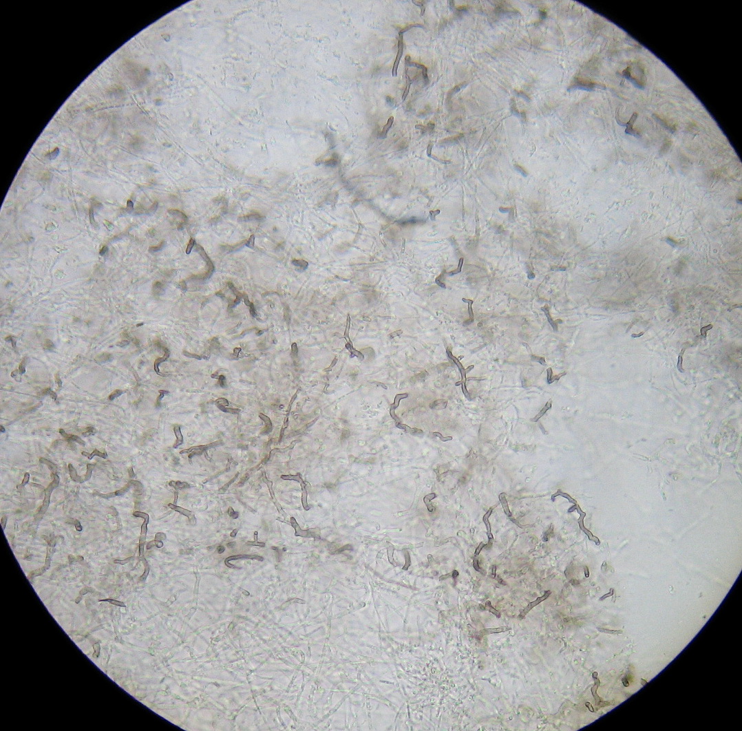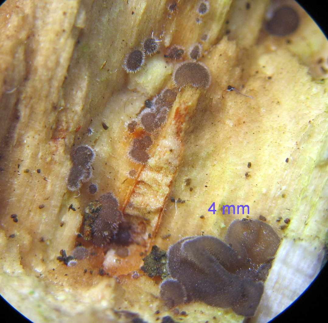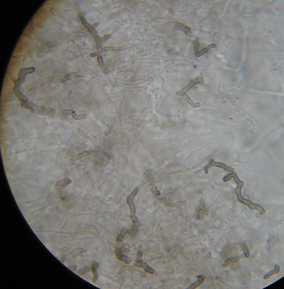 Erinnert irgendwie an ein Primordium vom Judasohr, wobei mir die abgebrochenen, braunen,dickwandigen, septiert und verzweigte Haare zu denken geben.