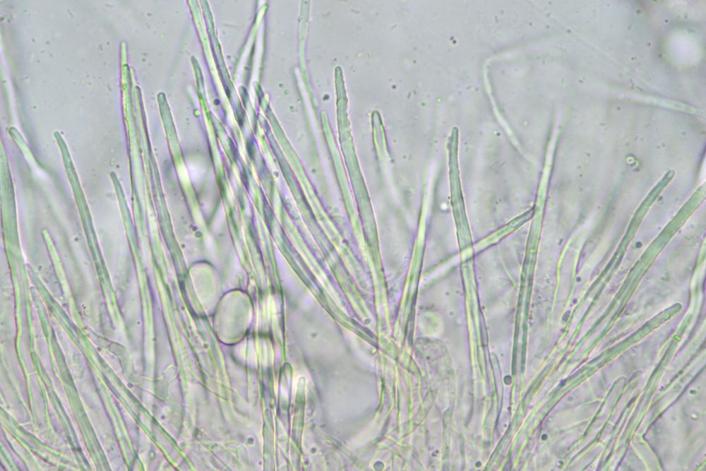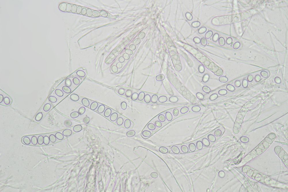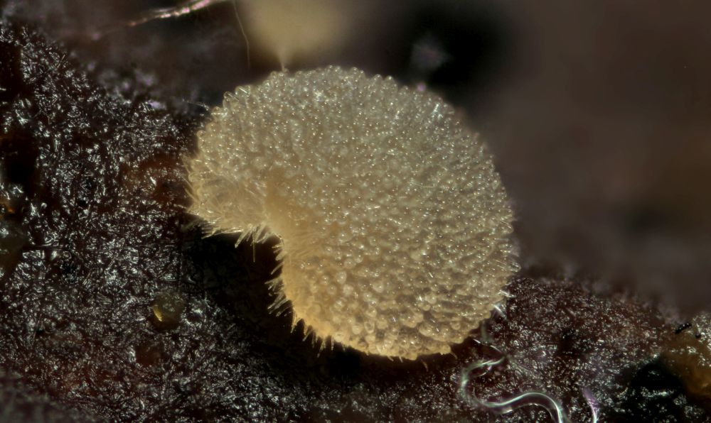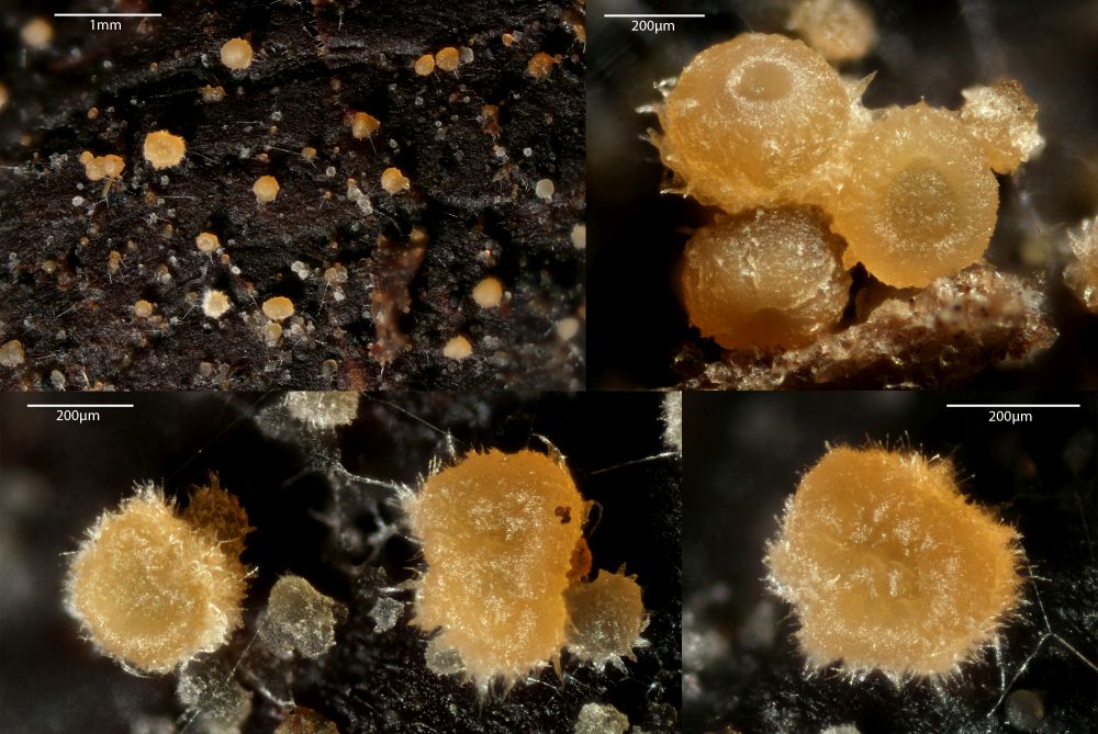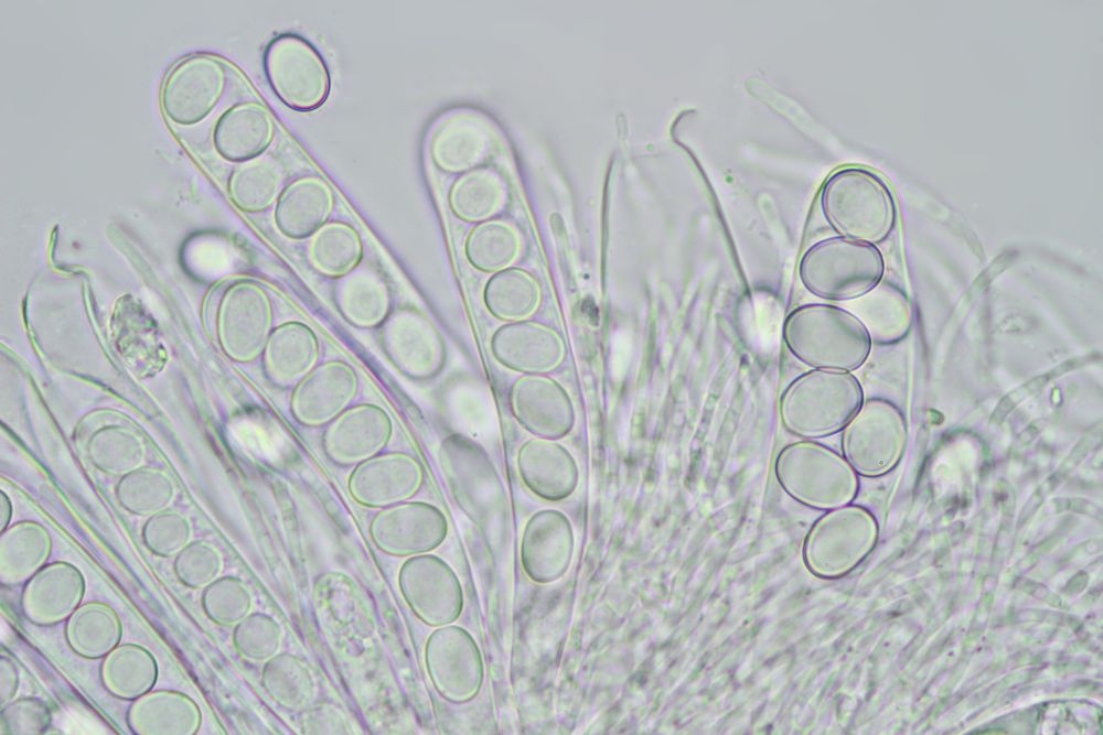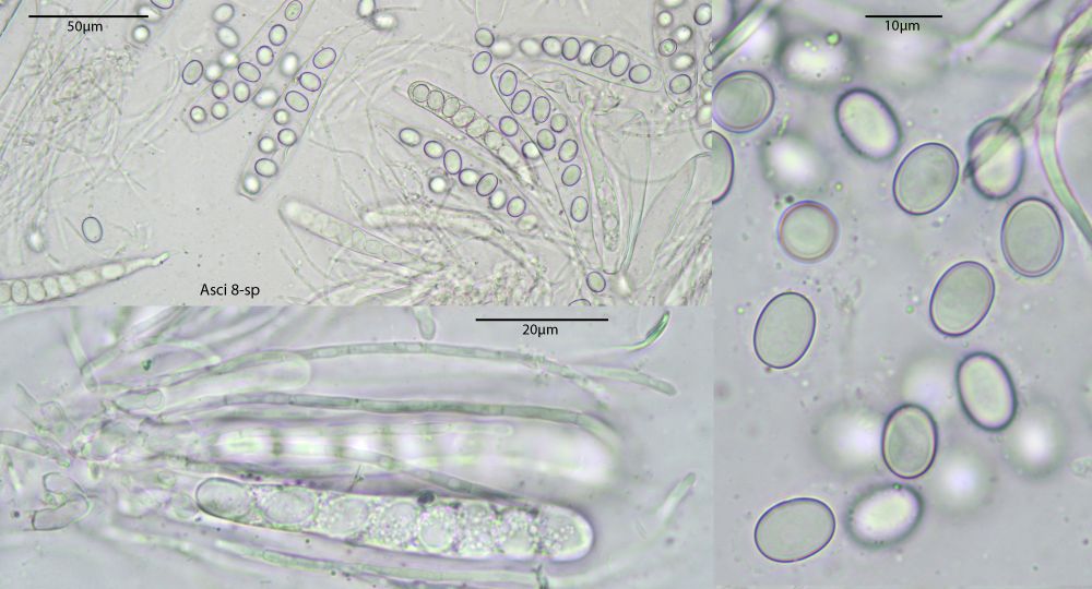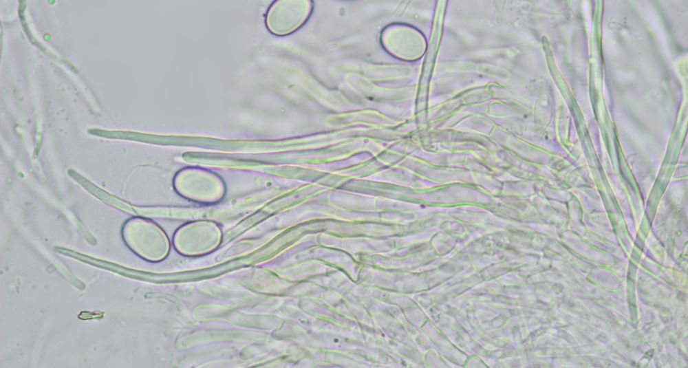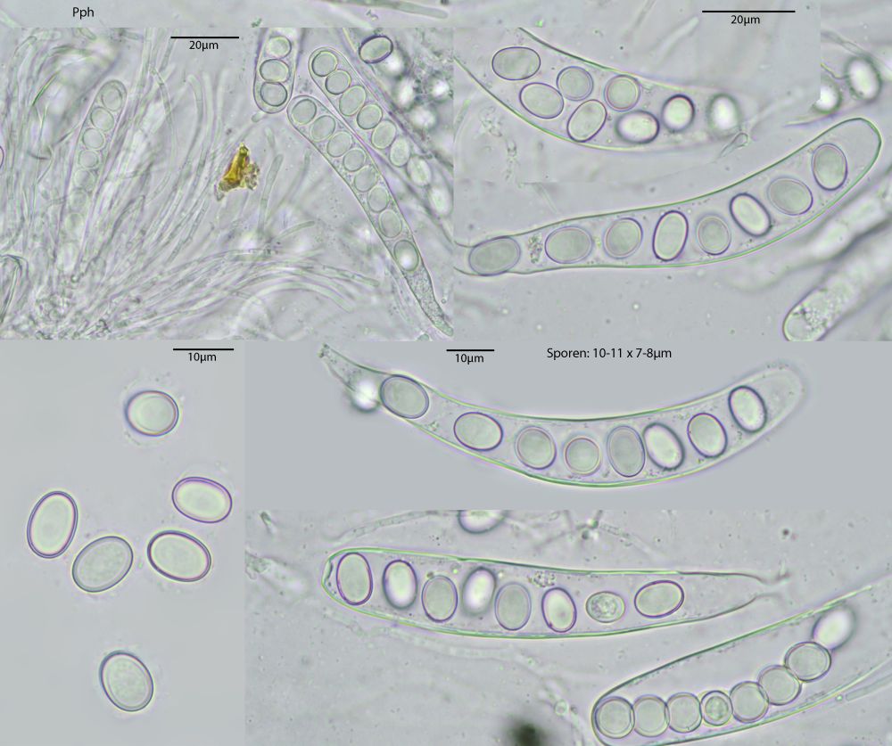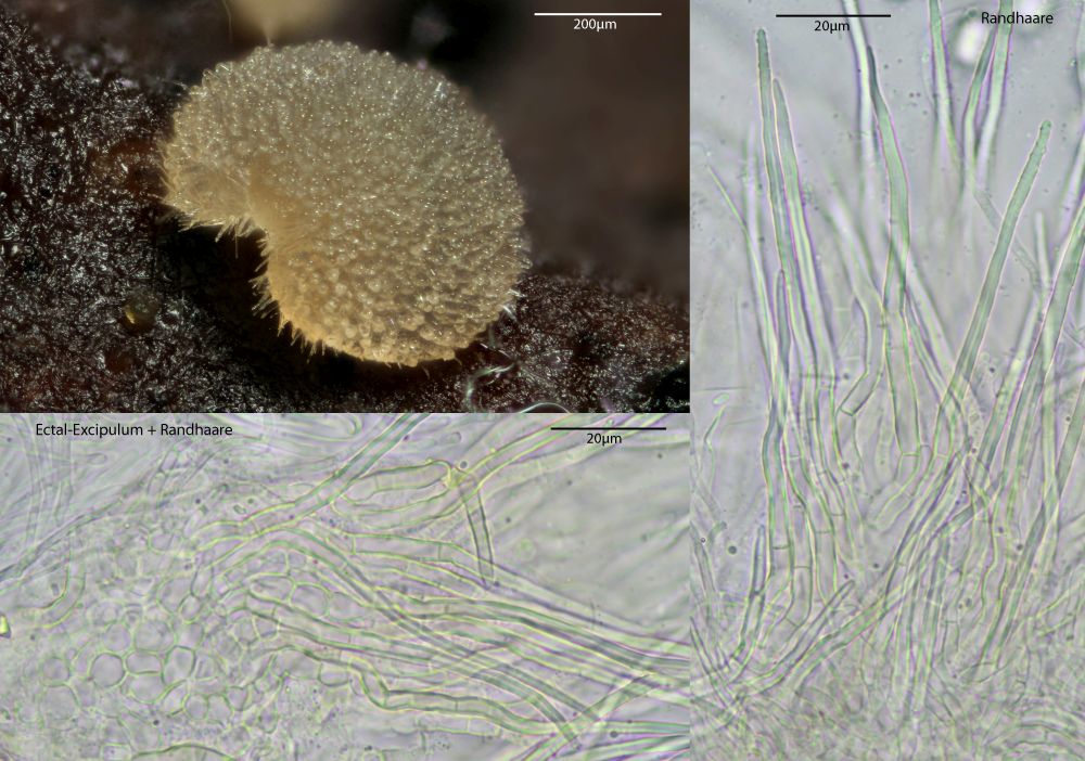 Nun ist bei mir wenigstens ein Exemplar mal vollreif aufgetaucht. Was die Sache aber nicht einfacher macht, v.a. die bis über 100µm langen, spitzen, dickwandigen Randhaare geben mir Rätsel auf. DIe sahen bei kleineren unreifen Exemplaren noch nicht so prominent aus. Dachte da schon an Lasiobolus, aber so recht passen will das auch nicht. Coprotus marginatus soll noch so lange Randzellen haben, aber die Sporen passen da bereits nicht.