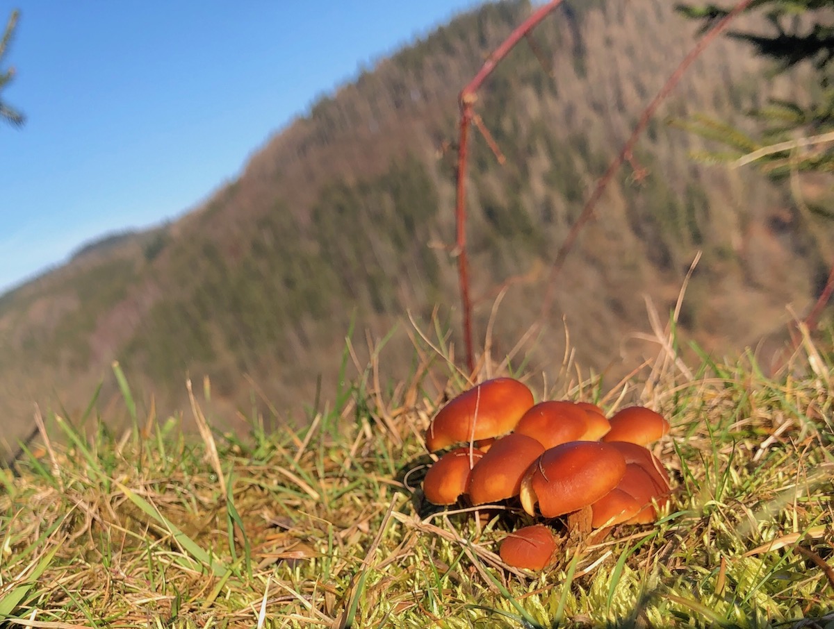 Aber jetzt mal raus aus dem finsteren Tal in die Sonne. Mitten auf dem Weg gab es gleich ein sonniges Samtfußrüblingsgrüppchen mit Aussicht.