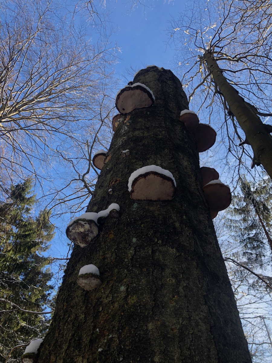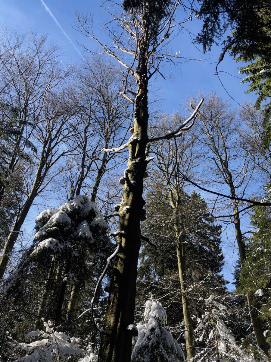 Auch wenn ich Zunderschwämme sehr mag, sollten besser nicht so viele Bäume von dem Pilz befallen sein.