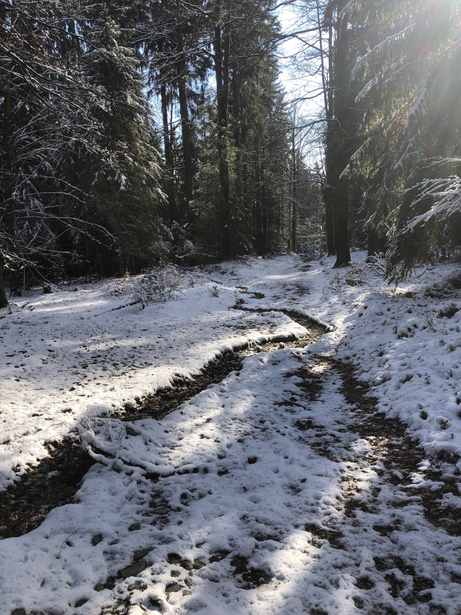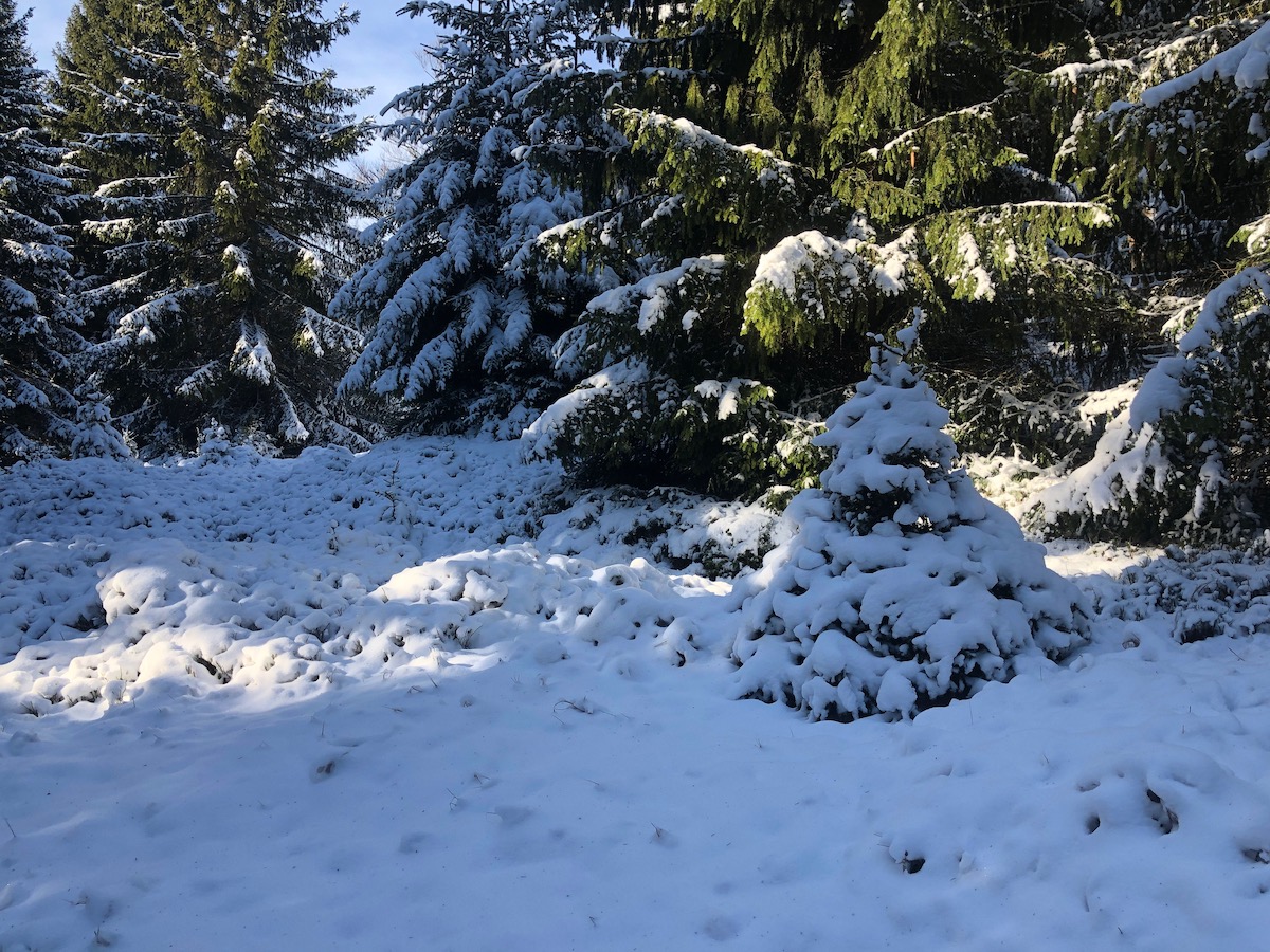 Unter dem Schnee und liegengebliebenen Zweigen waren die alten Waldwege nicht mehr zu finden. So mussten wir uns querfeldein durchschlagen.