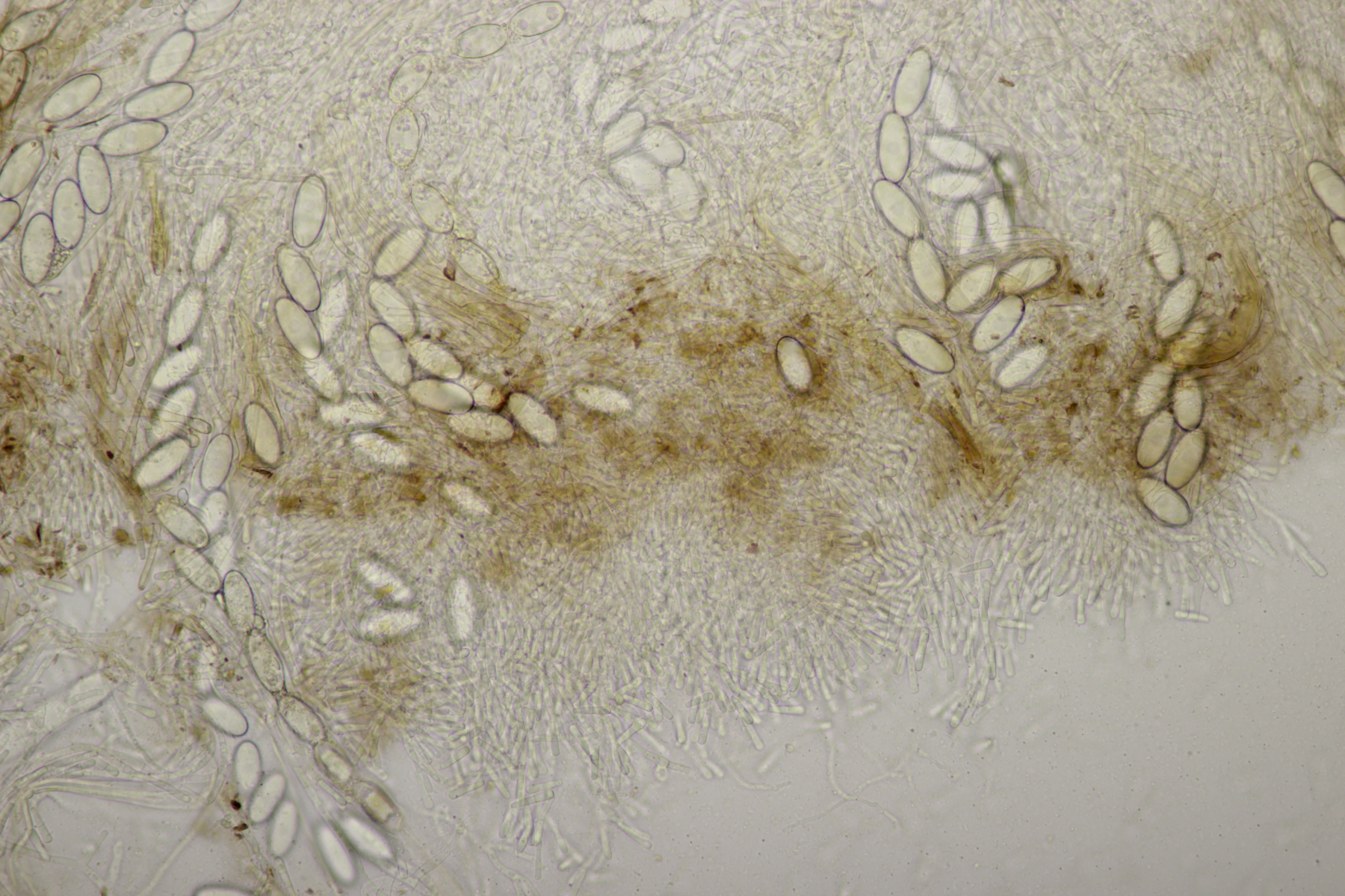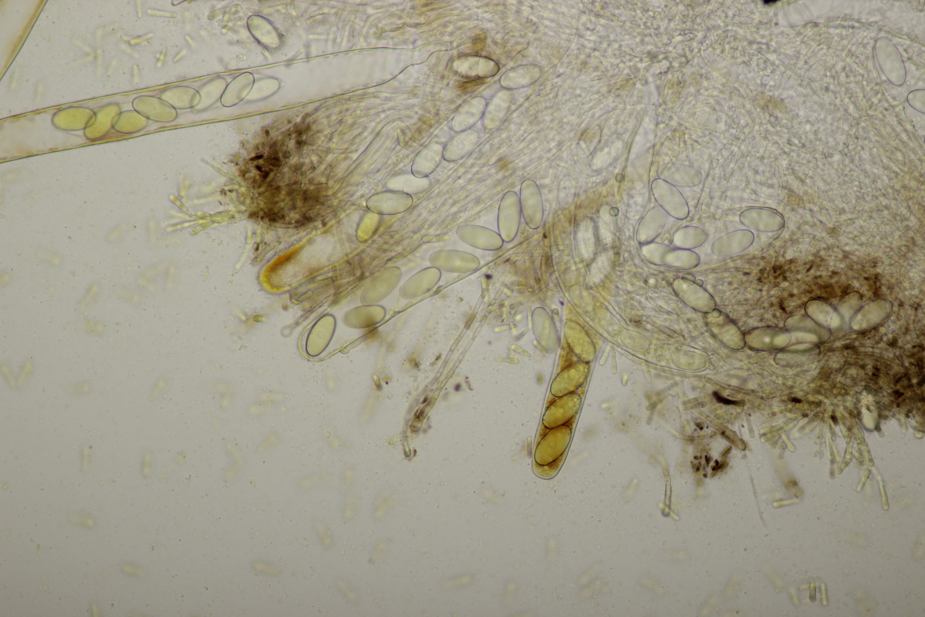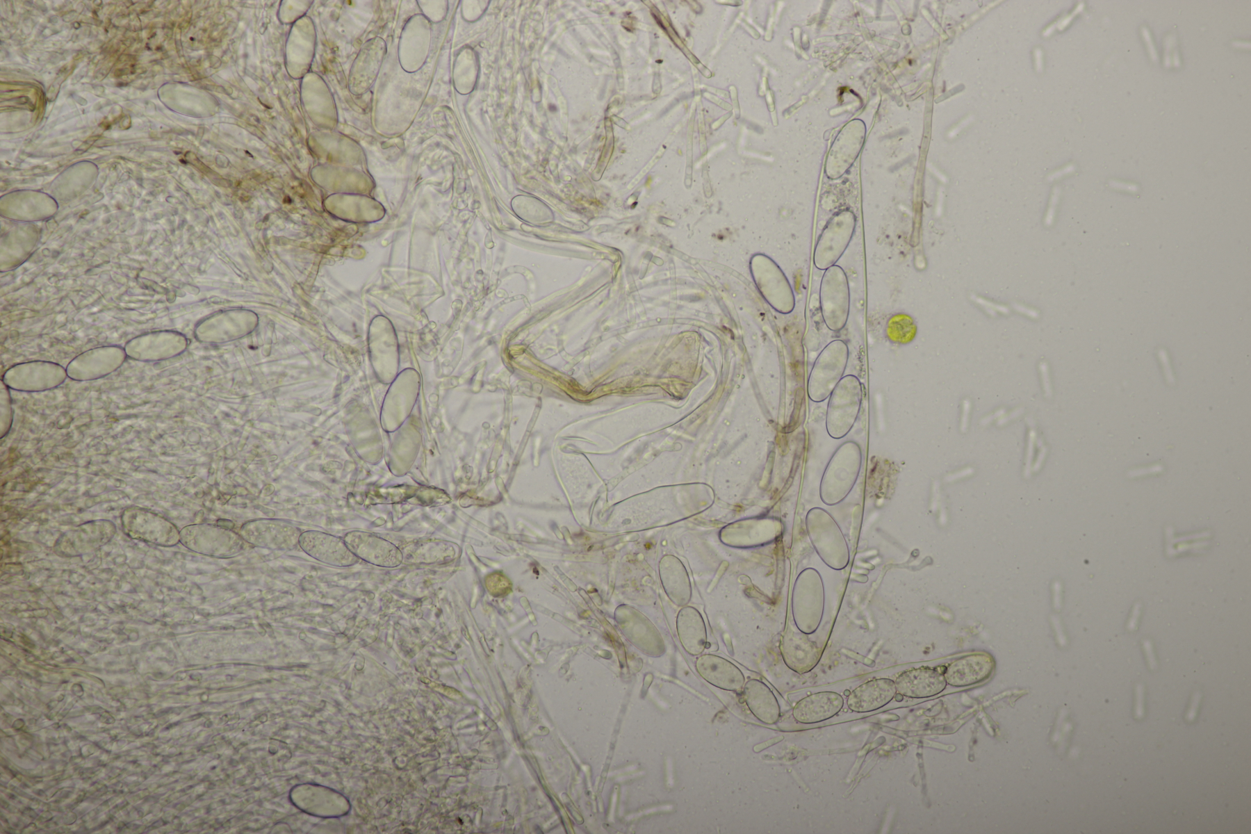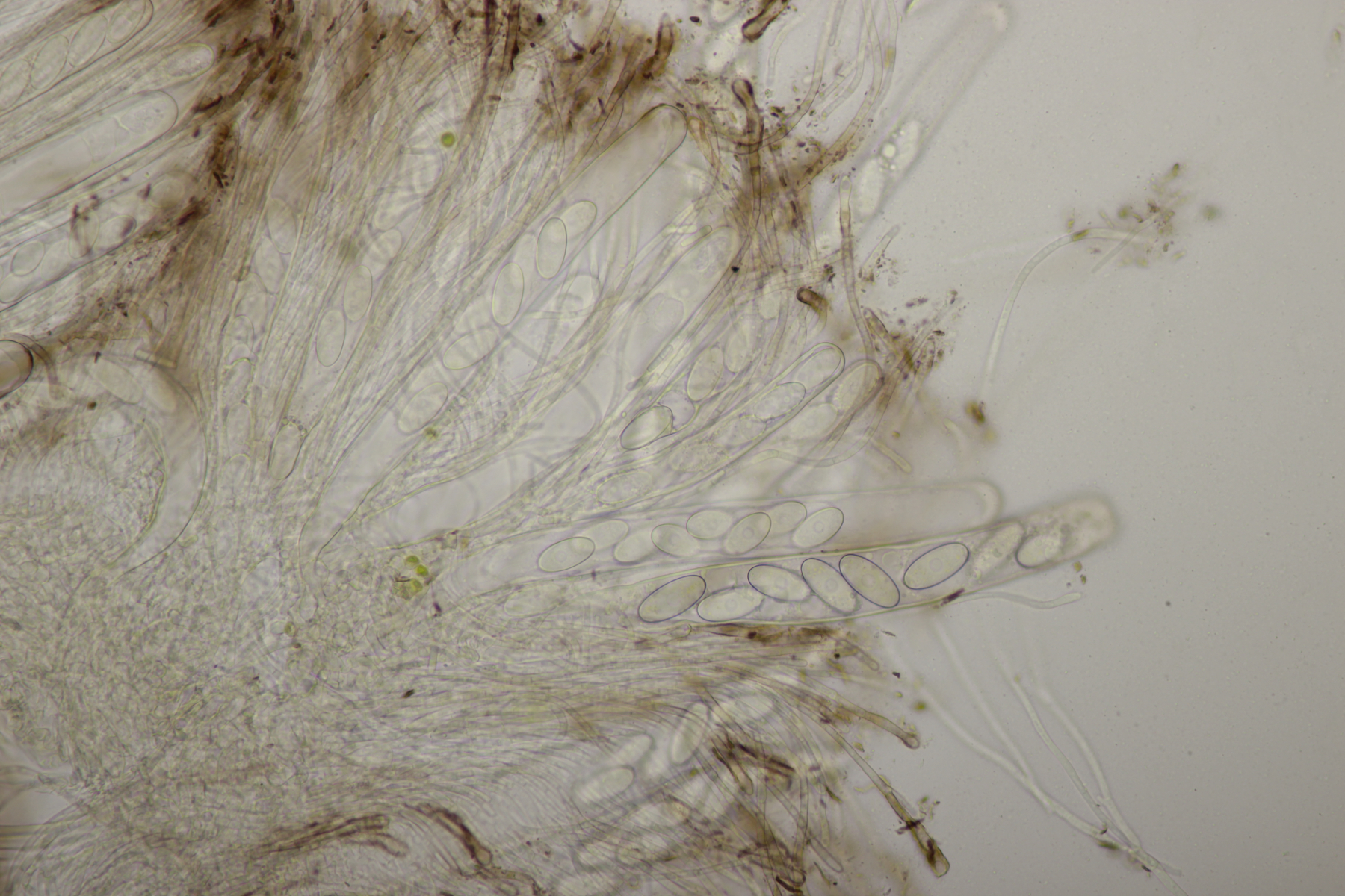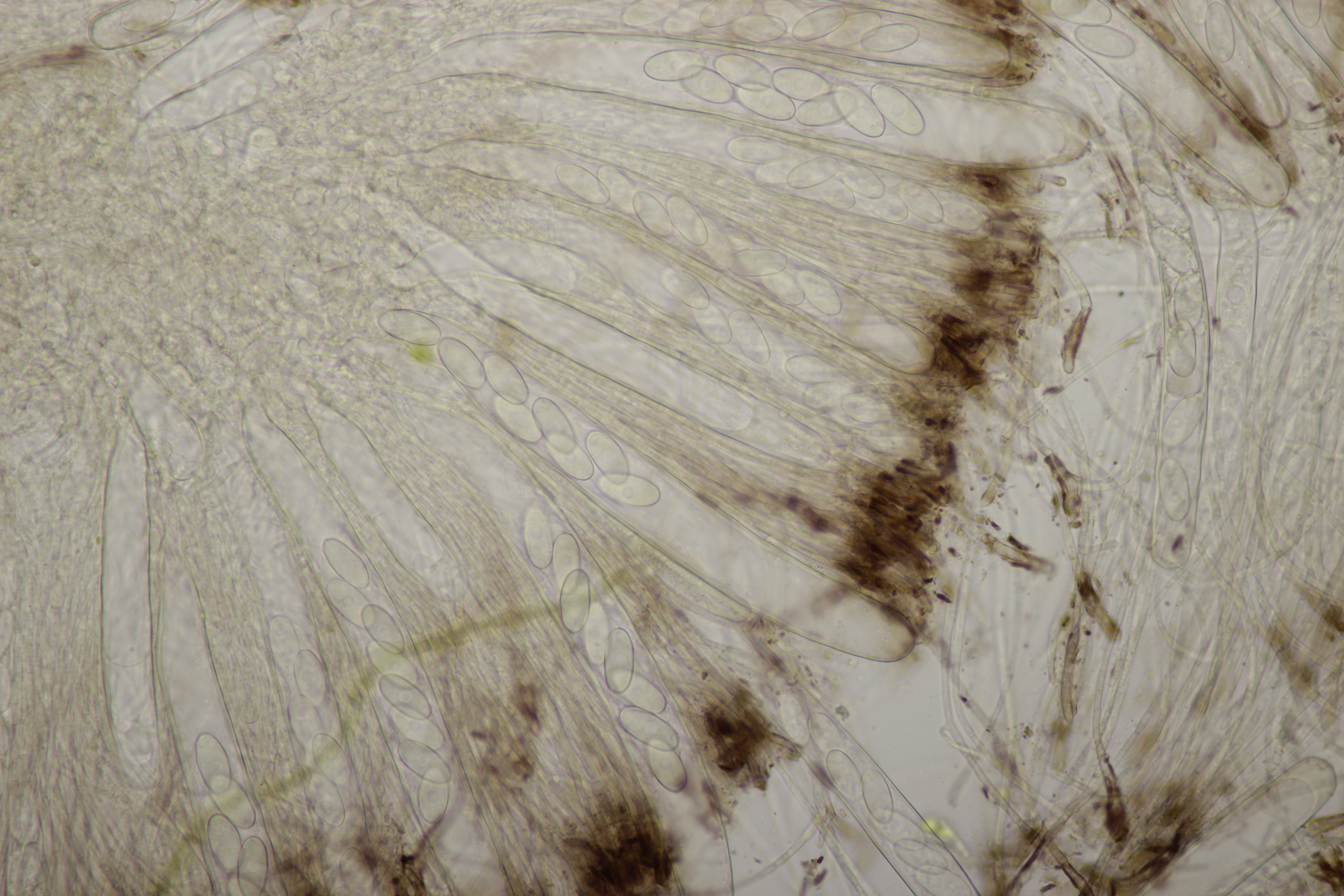 heute Vormittag war ich vor dem Sturm mit dem APR auf Exkursion im Landschaftspark Duisburg. Dort findet man auch immer jede Menge Kaninchenköttel und mit etwas Glück sind dann auch Pilze drauf. Das Glück war heute mit von der Partie und es fand sich folgender Becher, den ich für Pseudombrophila hepatica halten würde. Sporengröße (28.9+-0.6) µm x (13.0+-0.6) µm.