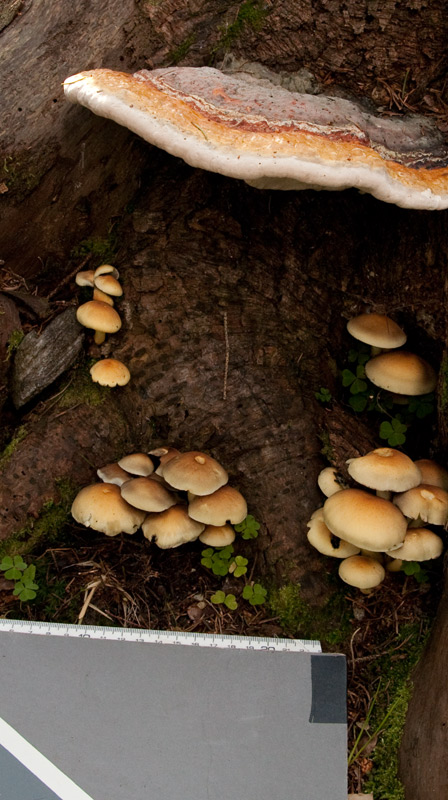 (7) Oben (ganz sicher!) Fomitopsis pinicola (Rotrandiger Baumschwamm) . Und unten (auch ganz sicher!) ein Schwefelkopf (Hypholoma spec.)