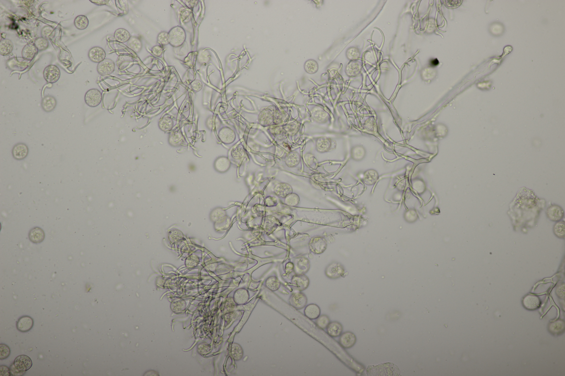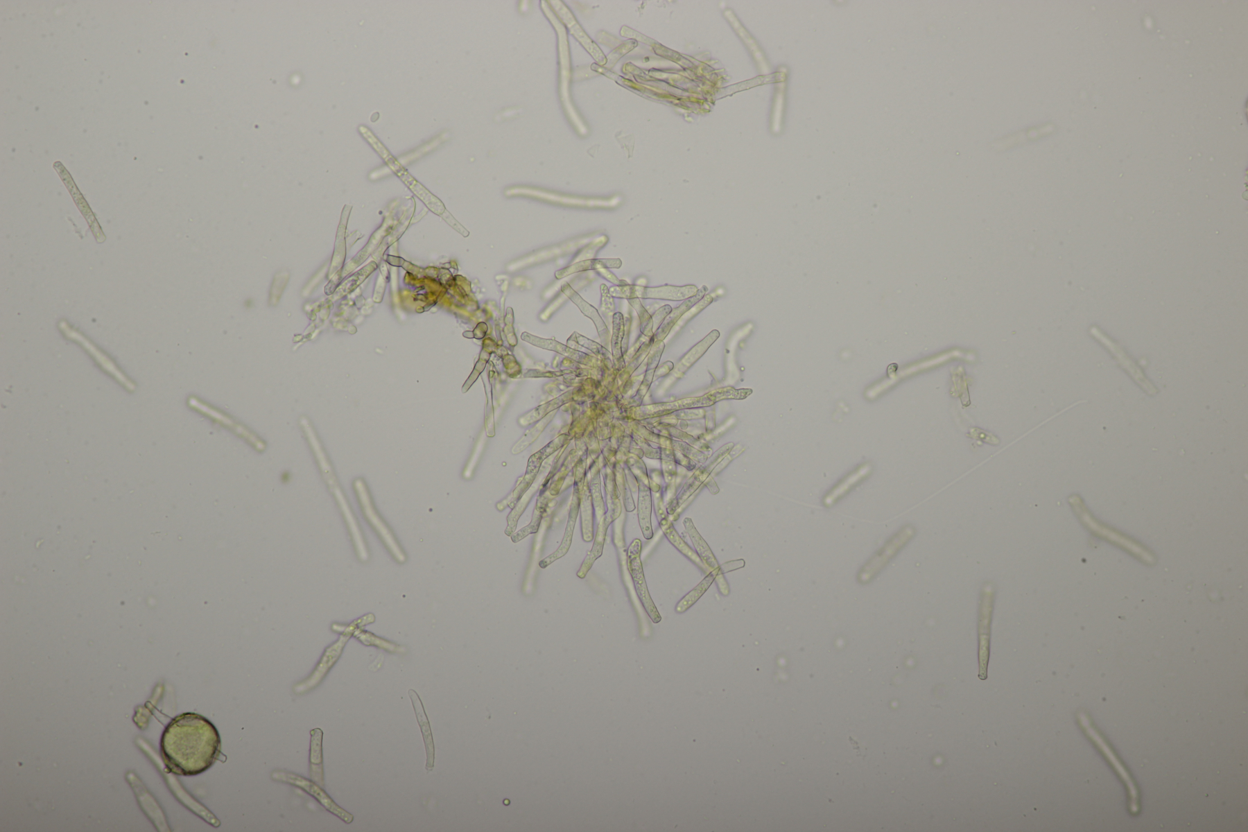 Bei Nr. 13 habe ich auch noch mal reingeschaut. Typische Patellaria-Sporen konnte ich keine entdecken. Stattdessen gab es viele sehr kleine, unseptierte Sporen, bei denen ich aber nicht sicher bin, inwiefern sie zum Pilz gehören. Eventuell handelt es sich hier auch um Konidien, auf den letzten Bildern erkennt man zwischen Asci und Paraphysen nämlich Strukturen, die ein wenig an Konidienträger erinnern. Ansonsten gab es in den Asci etwas größere, unseptierte Sporen.