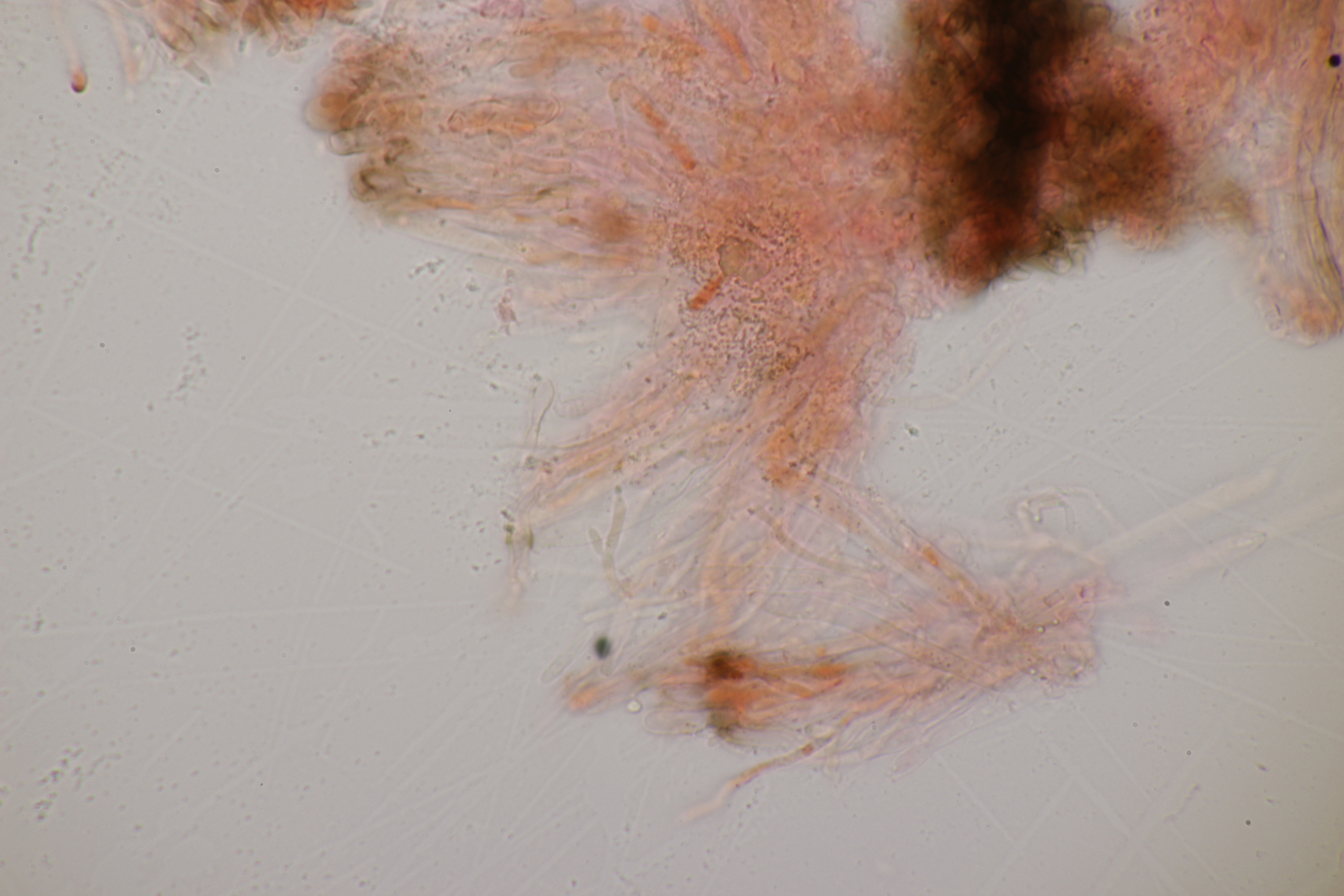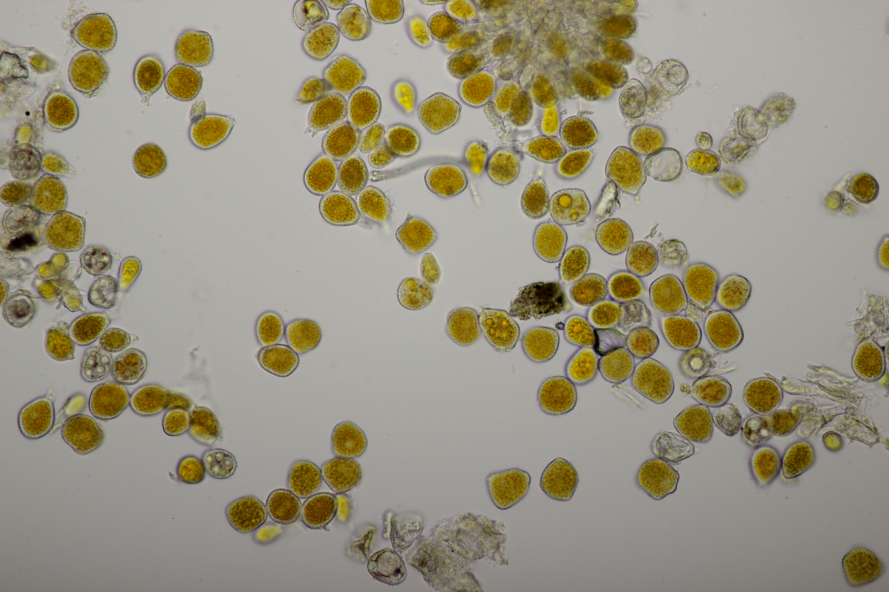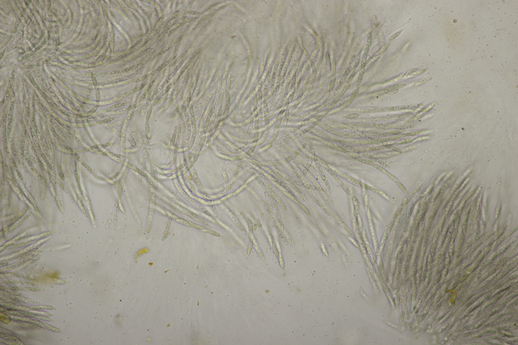 ich habe jetzt noch mal in Nr. 10 reinschaut. Leider waren in diesem Becher nur sehr wenige Sporen vorhanden. Das Problem ist, daß ich beim Abschneiden das erste Stück in die Erdumlaufbahn katapultiert hatte und auf dem zweiten Stück dann eben nur noch die kleineren Becher übrig waren. Wenn ich mir die Sporen so anschaue, kann ich einige wenige entdecken, die in der Mitte septiert sind. Da waren dann keine Öltröpfchen zu sehen. Bei den nicht septierten Sporen gab es einige wenige, wo an jedem Sporenende ein ganz kleiner Öltropfen (deutlich kleiner als der Sporendurchmesser) zu sein scheint, die meisten waren aber auch ohne Tröpfchen. Viele Sporen zum Messen gab es nicht, die wenigen, die taugten waren (11-13) µm x (2-3) µm groß.