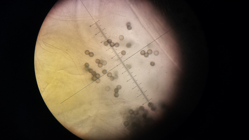 Auf meinem namibischen Schaf bzw. auf dem Zellstoff kommen diese lustigen Gesellen mit langem Hals. Asci waren keine zu sehen, die Sporen sind auffallend hell, rund, ornamentiert und mit 5µm Durchmesser sehr klein.