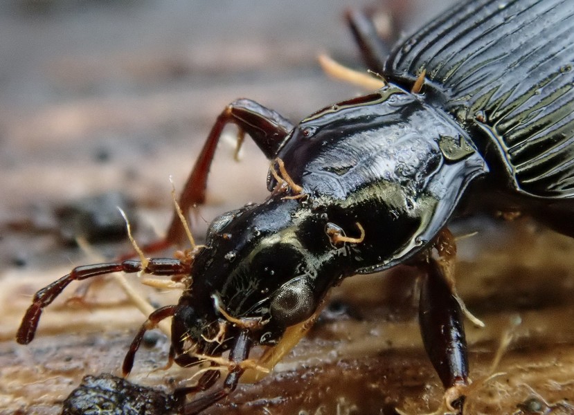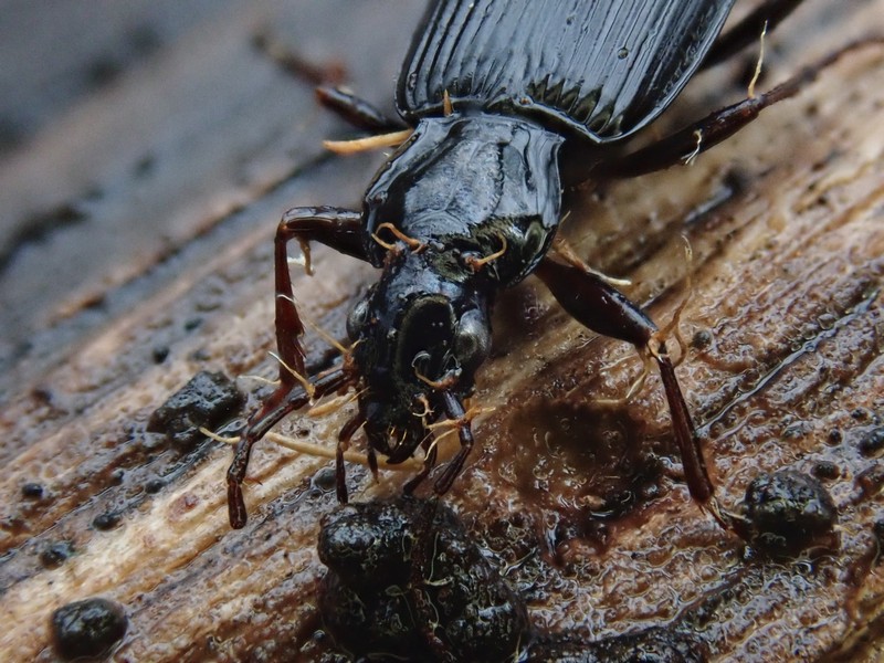 Auf der Suche nach Kleinpilzen fand ich heute in einem Wäldchen in Nordwest-Mecklenburg unter der losen Rinde einer toten Hasel (?) diesen toten Laufkäfer Limodromus assimilis. Aus dem wachsen kleine Keulen heraus.