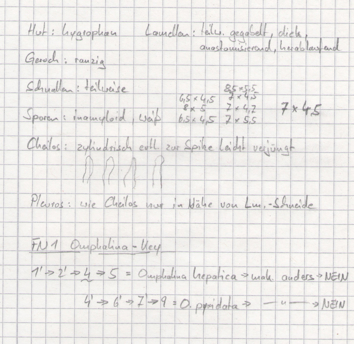 Das sehr feine Sporenornament kann man bei Gamundia auch bei stärkster Vergrößerung kaum sehen, aber beim Spiel mit der Schärfenebene zumindest erahnen. Zur Unterscheidung von Omphalina pyxidata/hepatica reicht die Sporenform. Bei den letztgenannten findet man im Sporenabwurf viele deutlich mandelförmige Sporen, die gibt es bei Gamundia nicht. Wie du selbst festgestellt hast, passen die beiden Omphalina-Arten aber auch schon makroskopisch nicht zu deinem Fund. Die bei deinen Gamundia etwas dunklen Lamellen sind alters- und witterungsbedingt (das Aussehen der Pilze lässt auch einen leichten Frostschaden vermuten).