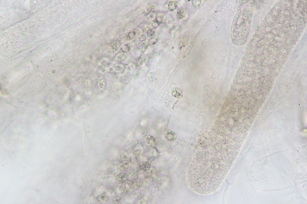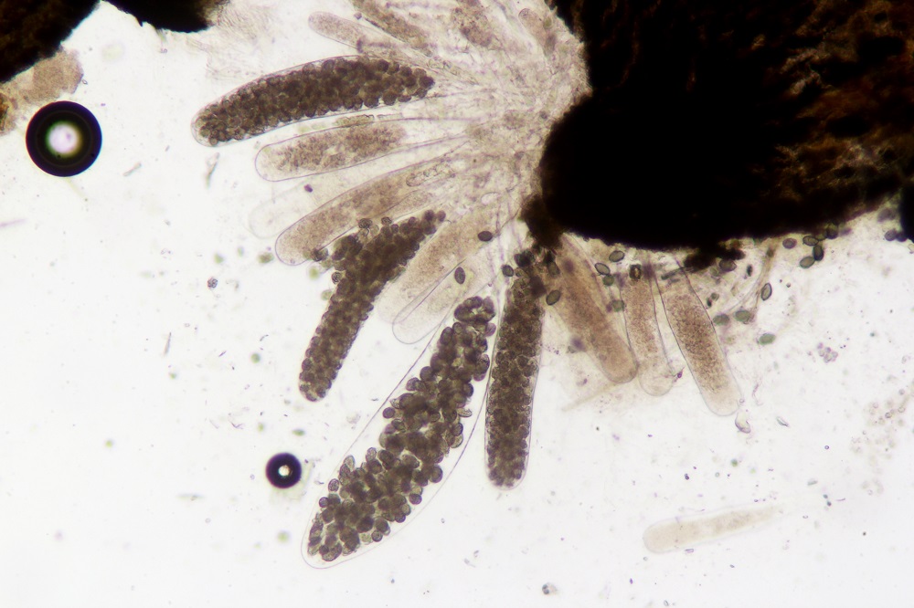 Aufgrund der vielsporigen Asci (vermutlich 128sporig), der Sporengröße und der Ascusform kommt da nur Arnium leporinum infrage.