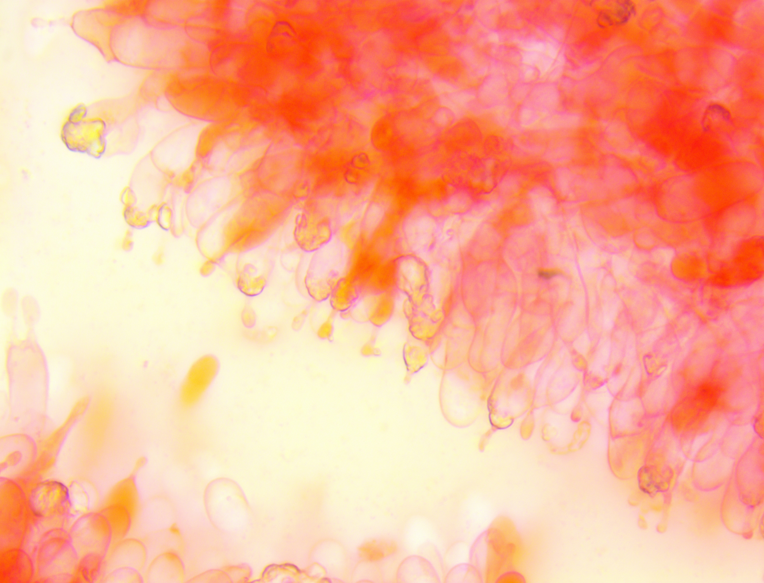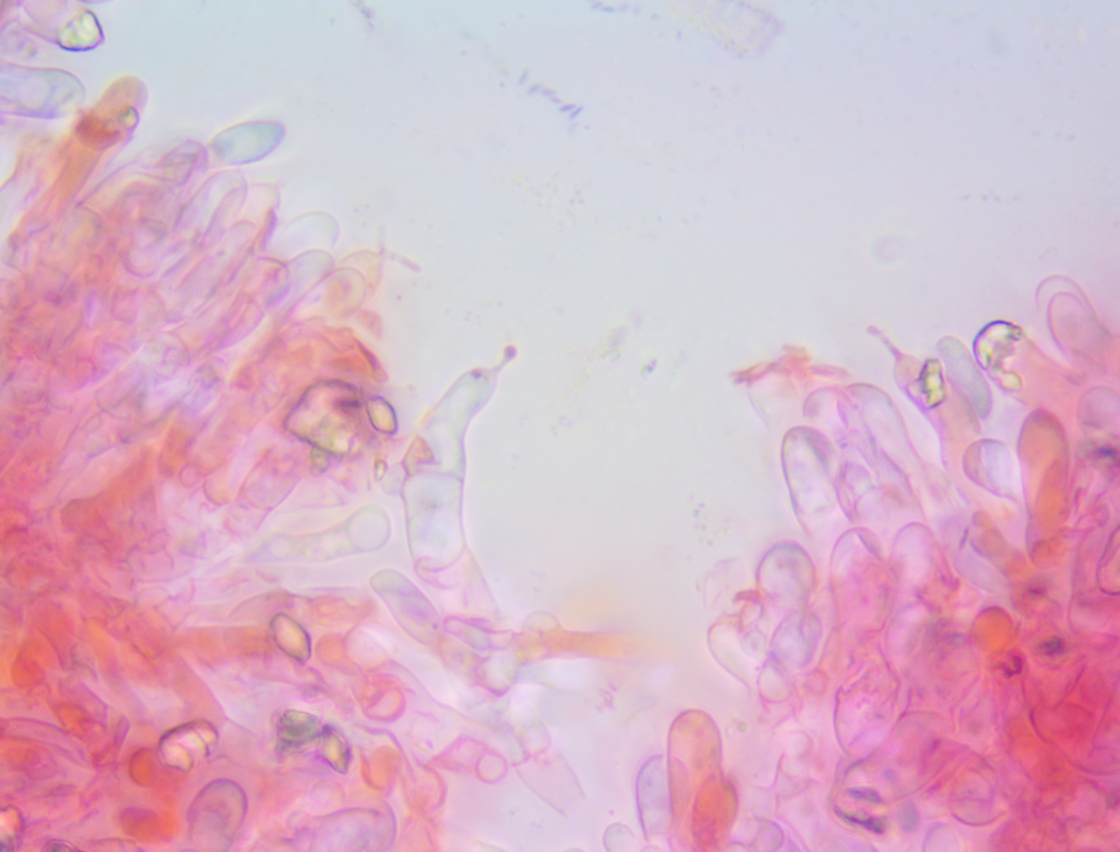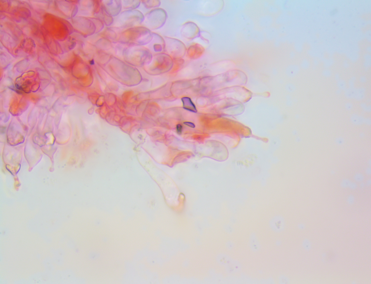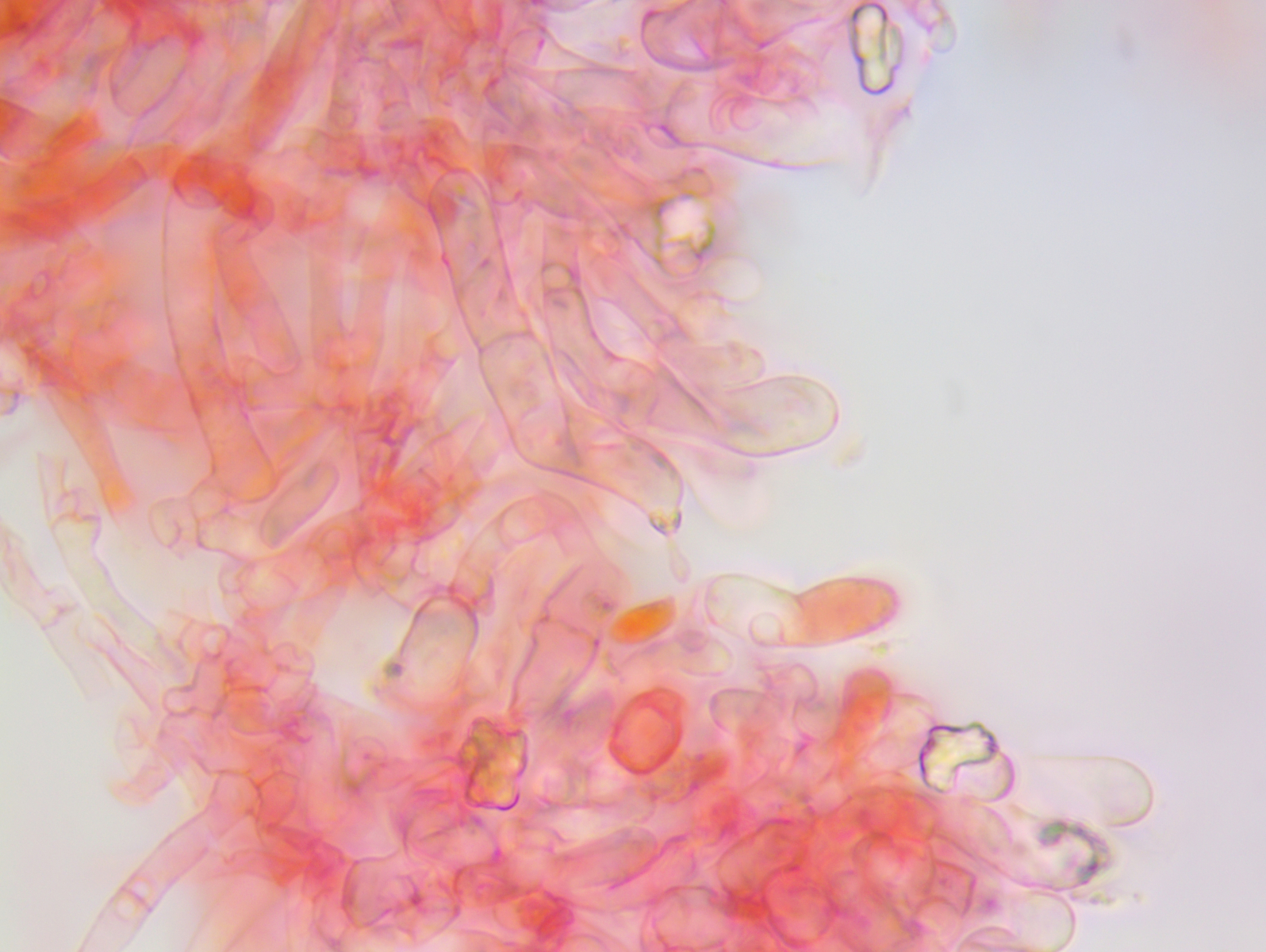 Hallo ich habe in einem Kalksteinbruch einen Pilz gefunden mit +- Trichterlingshabitus, er hat sehr auffallende tibiiforme Cheilos, die zudem septiert sind.