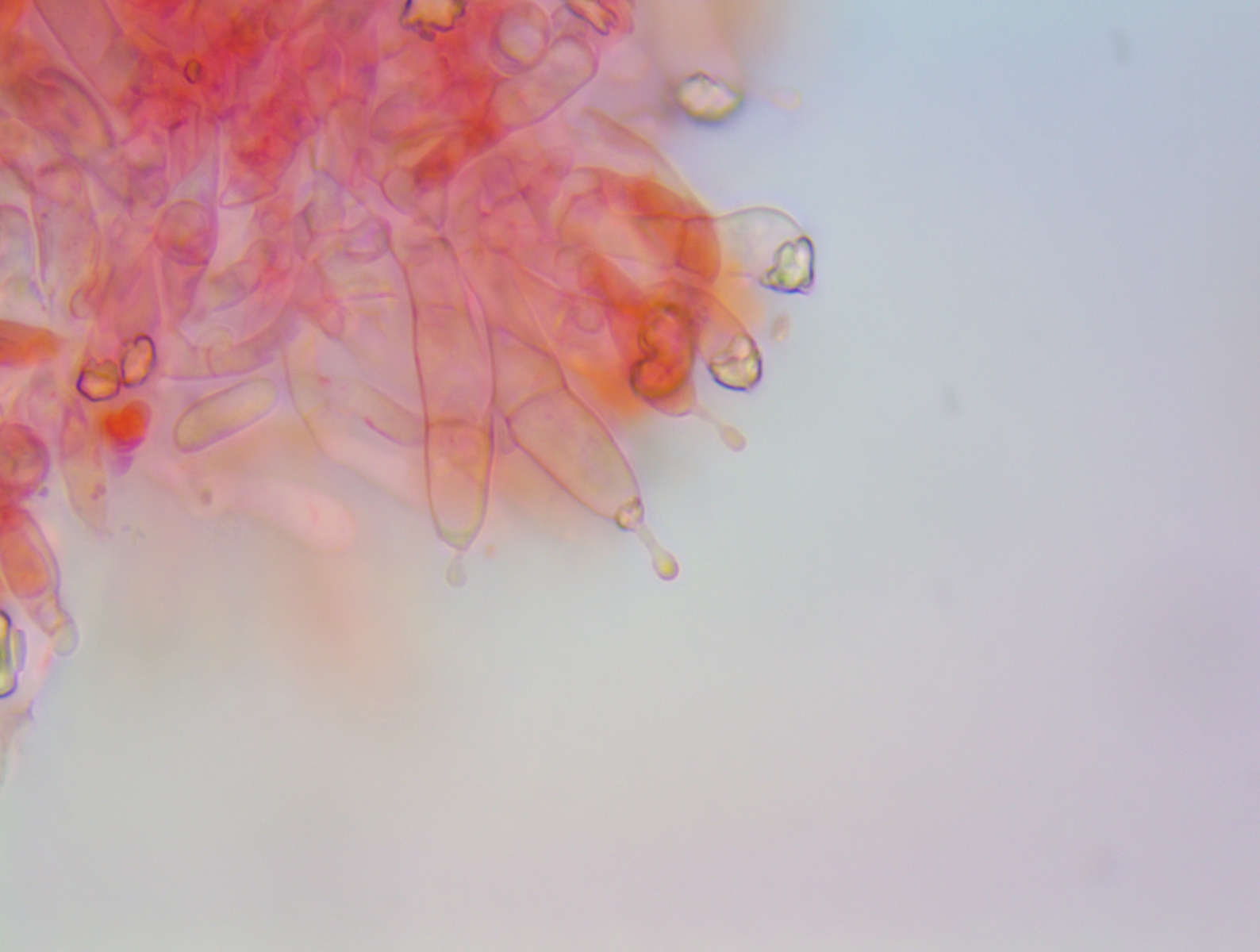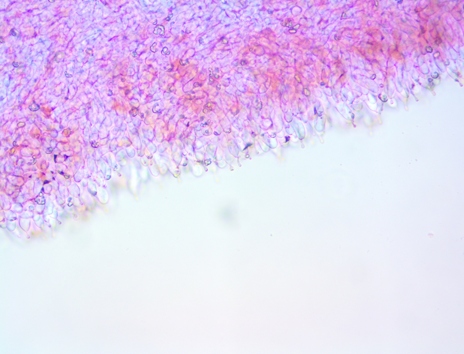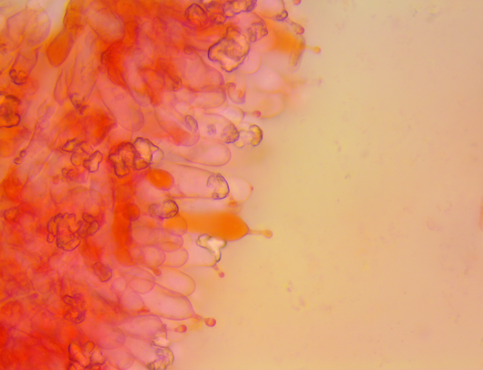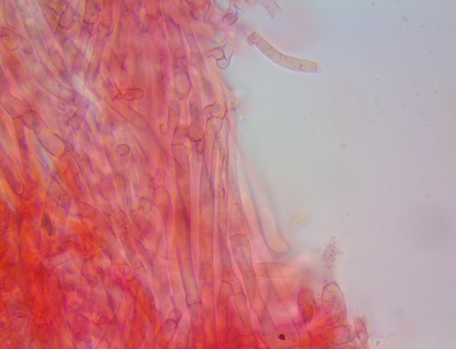 Hallo ich habe in einem Kalksteinbruch einen Pilz gefunden mit +- Trichterlingshabitus, er hat sehr auffallende tibiiforme Cheilos, die zudem septiert sind.