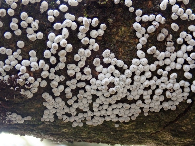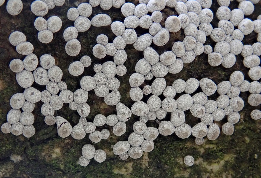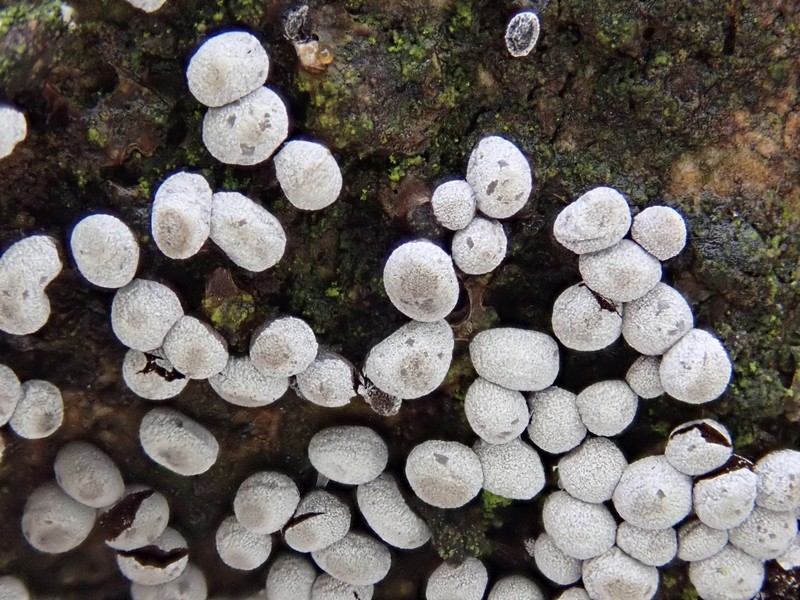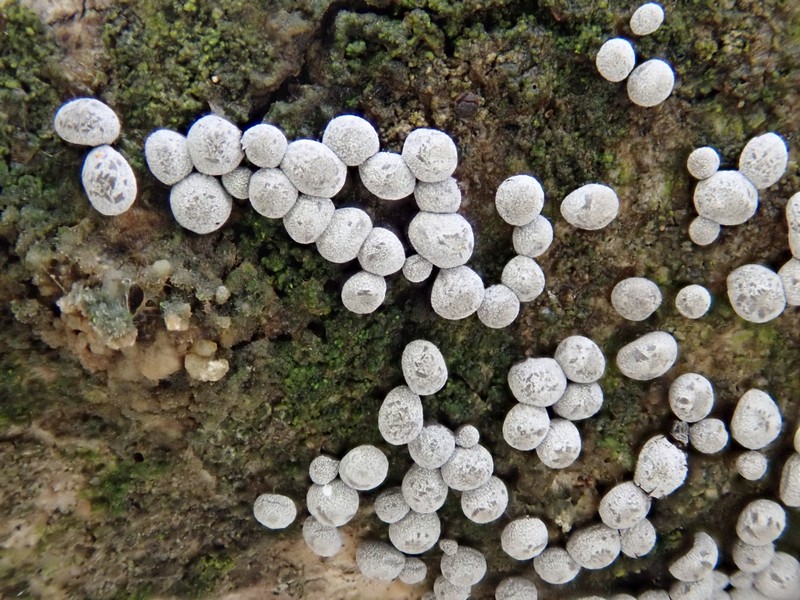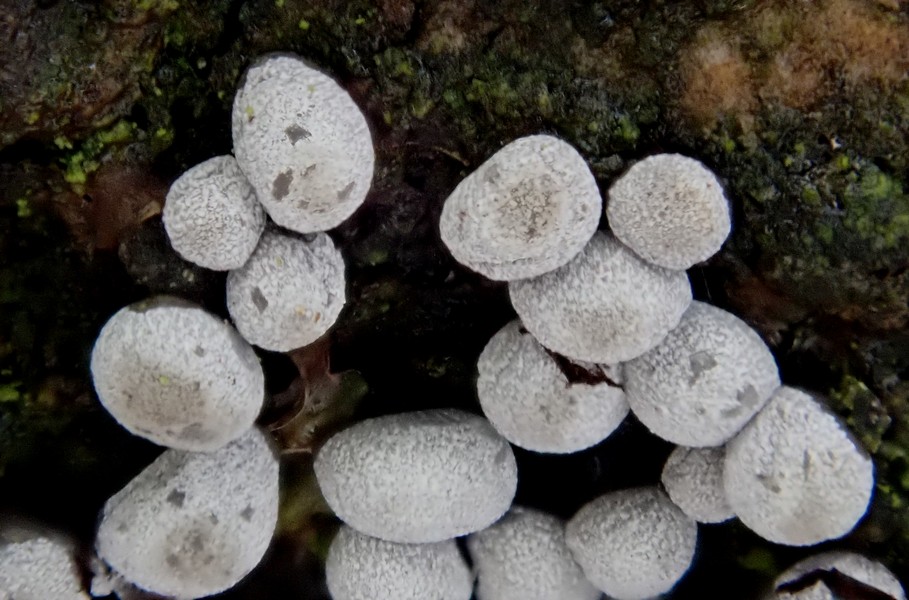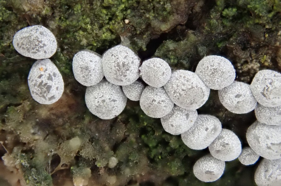 Auf dem letzten Foto bilde ich mir ein kalkhaltige Strukturen im Innern der Fruchtkörper zu sehen, da könnte es ein Physarum sein.