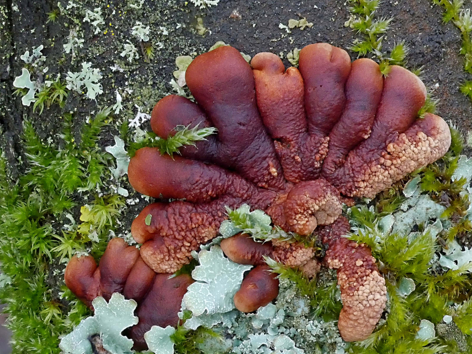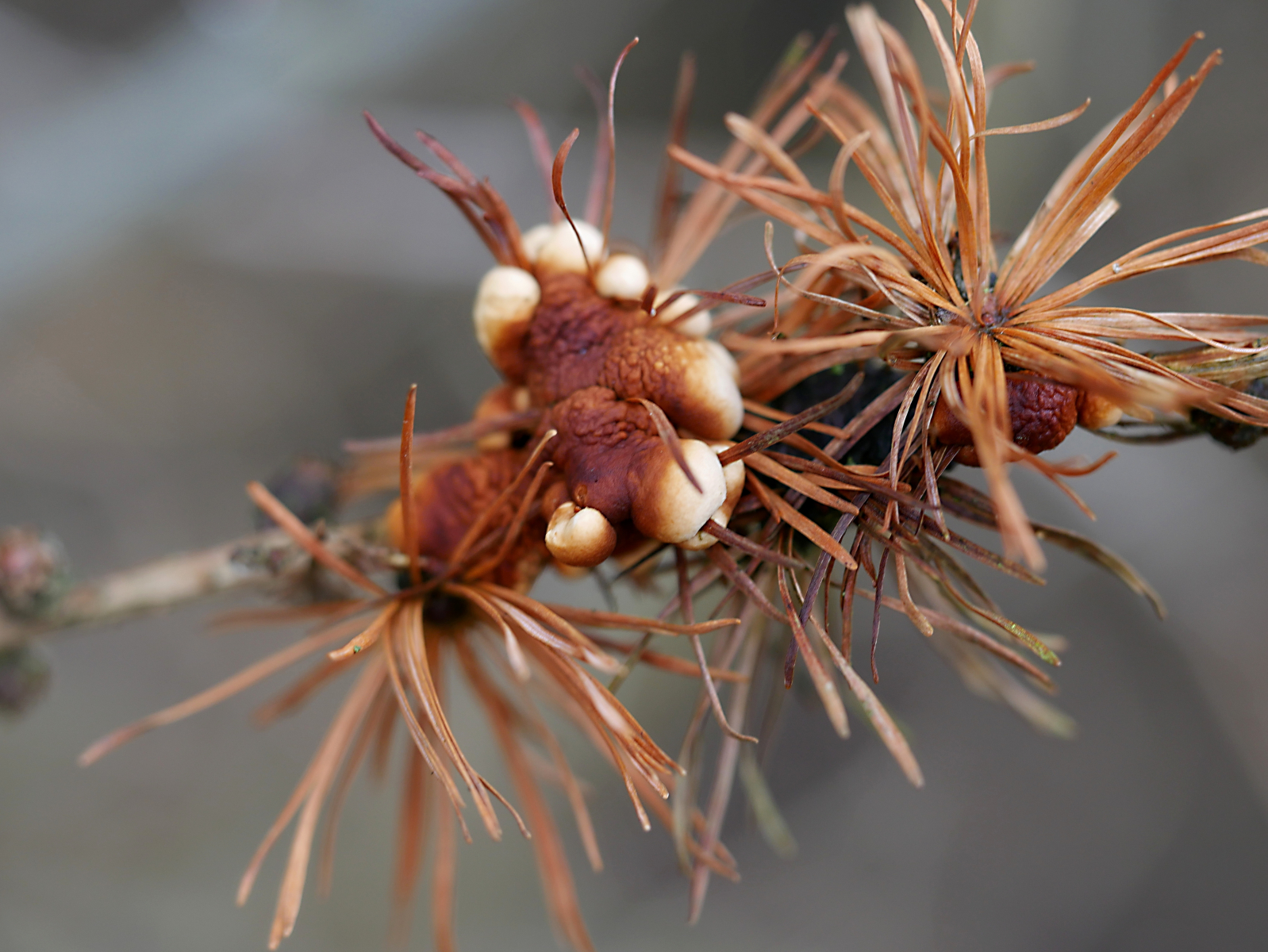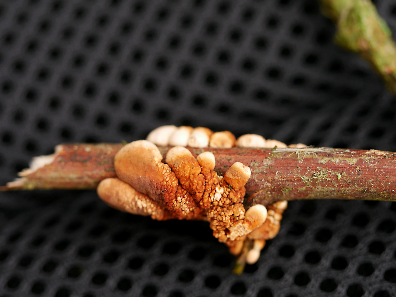 Eine große Überraschung bot uns die Trollhand. Gleich drei neue Fundplätze konnten wir entdecken. Ist sie wirklich so selten, oder wird in den entsprechenden Biotopen nicht genug gesucht? Ortshäufig kann man aber ohne Übertreibung feststellen. Ganz außerordentlich war jedoch der Fund jeweils eine Exemplares auf einem Lärchenzweig, und eines weiteren auf einem senkrecht im Boden steckenden, toten Himbeertrieb. Letzterer war wegen des sumpfigen Untergrundes nur auf der Fototasche zu fotografieren. Irrläufer? Oder doch nicht so richtig Substratgebunden? Es würde mich interessieren, wenn weitere Funde an ungewöhnlichen Substraten gemacht werden.