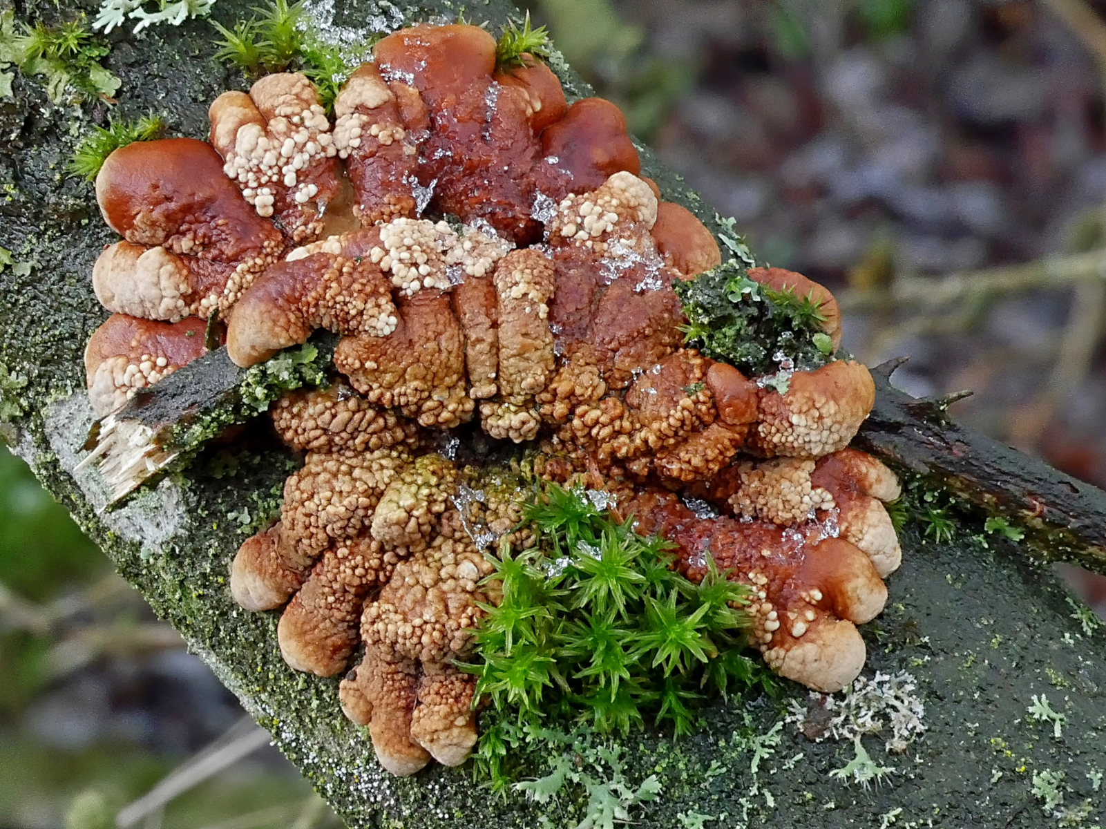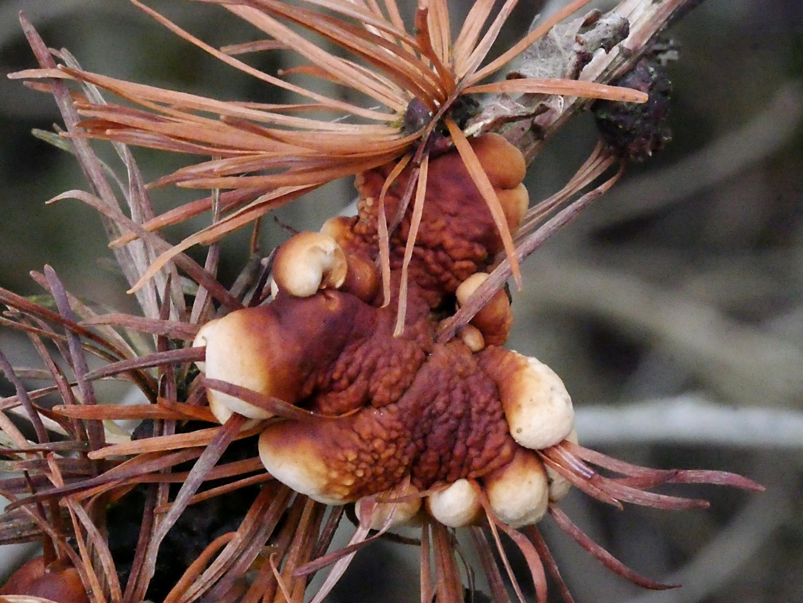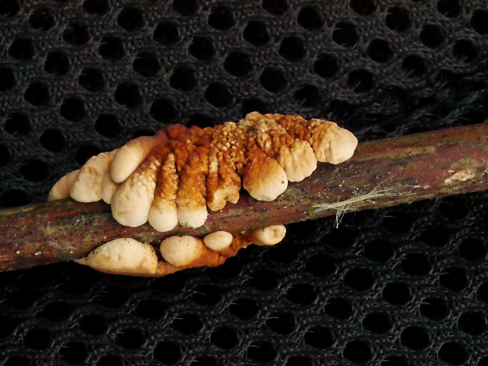 In einem kleinen, aber alten Bestand von Küstentannen hatte eine der letzten stürmischen Damen ein mächtiges Exemplar zu Boden gebracht. Gelegenheit mal die abgestorbenen Äste im Kronenbereich anzuschauen, an denen ja z.B. Cyphella digitalis wachsen soll. Nun, die gab es nicht. Aber es gab jede Menge Orangefarbene Mehlscheiben (Aleurodiscus amorphus) und darauf den parasitischen Mehlscheiben-Zitterling (Tremella mycophaga). Sieht man auch nicht alle Tage.