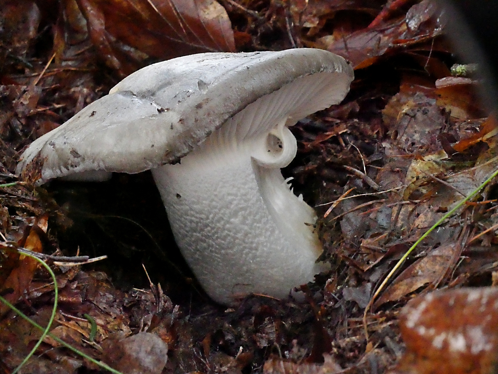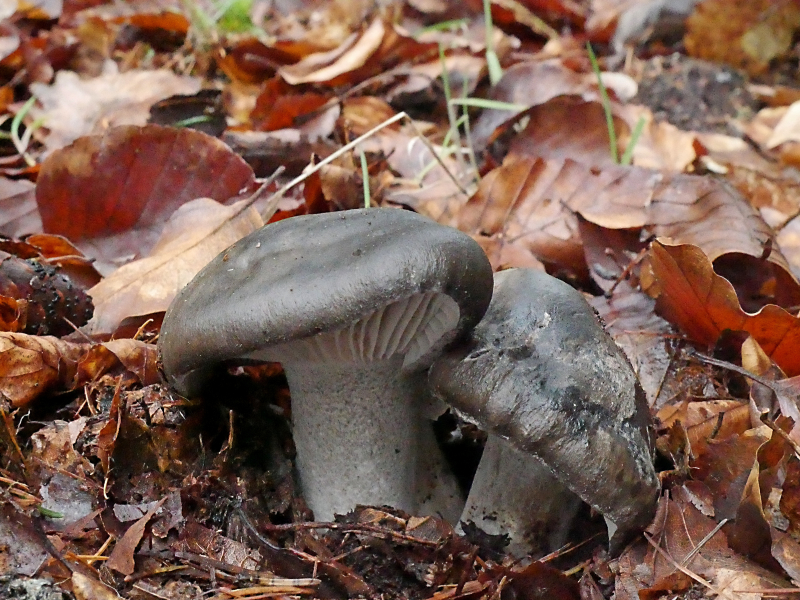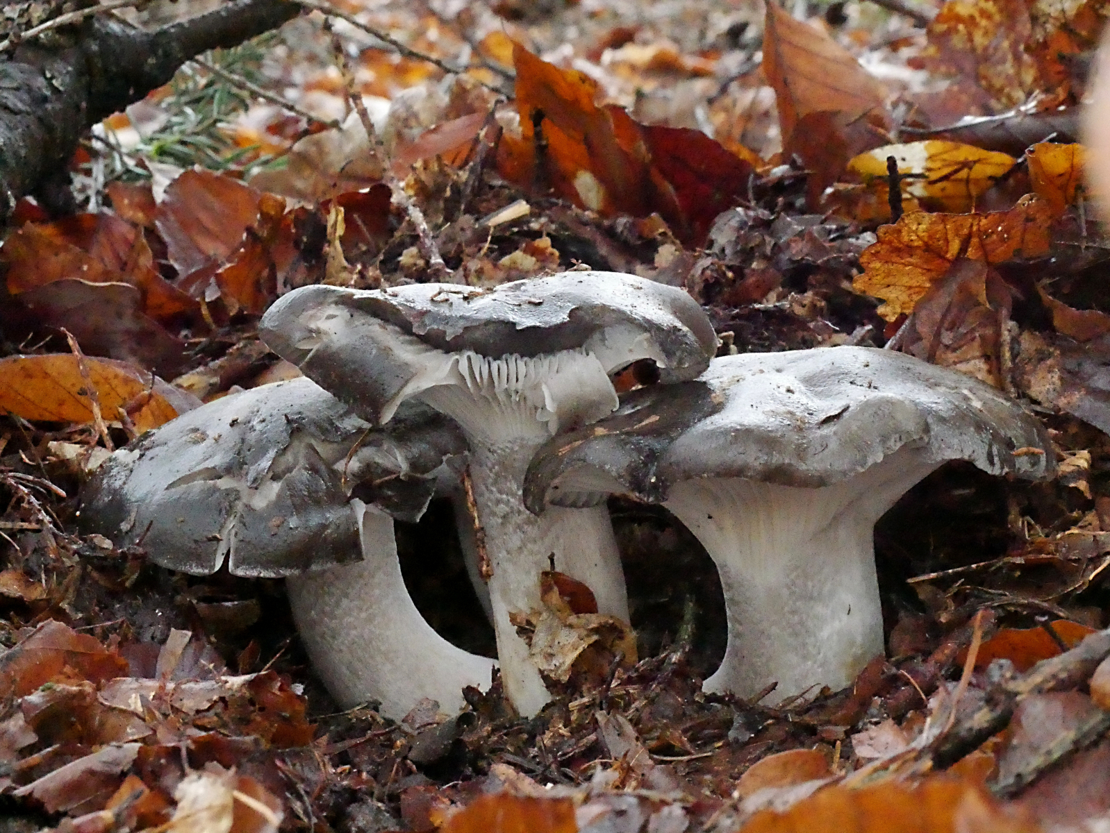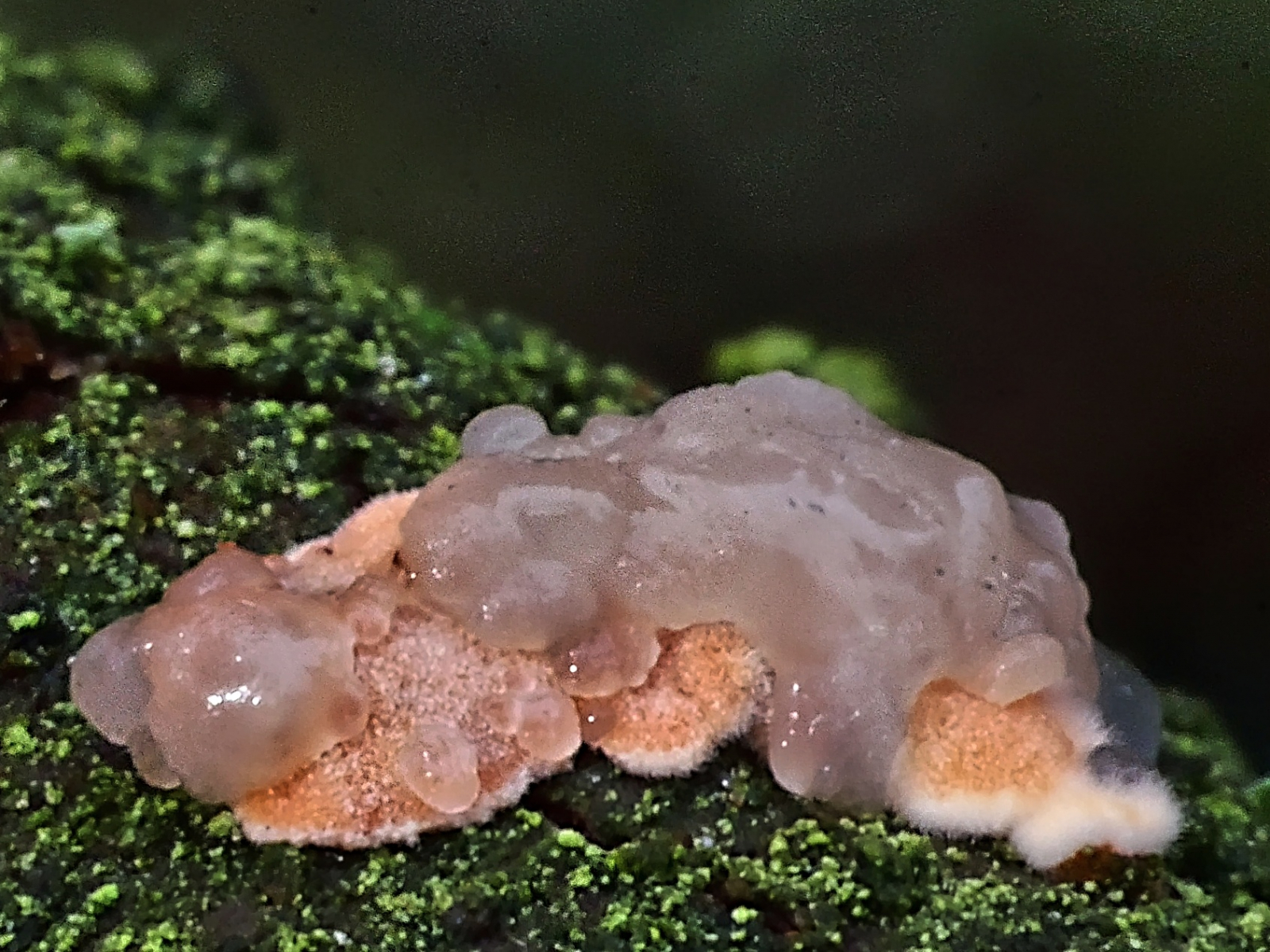 In einem kleinen, aber alten Bestand von Küstentannen hatte eine der letzten stürmischen Damen ein mächtiges Exemplar zu Boden gebracht. Gelegenheit mal die abgestorbenen Äste im Kronenbereich anzuschauen, an denen ja z.B. Cyphella digitalis wachsen soll. Nun, die gab es nicht. Aber es gab jede Menge Orangefarbene Mehlscheiben (Aleurodiscus amorphus) und darauf den parasitischen Mehlscheiben-Zitterling (Tremella mycophaga). Sieht man auch nicht alle Tage.