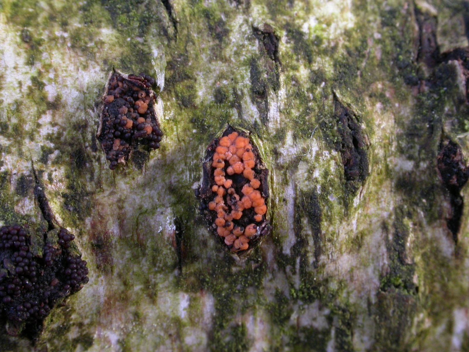 ich machte den Fehler letzten Samstag im Rahmen einer Kartierungsexkursion der MAMU des VfP München eine "Nectria" an Diatrypella favacea mitzunehmen, weil sich auf dem Stroma der Diatrypella auch diese schönen orangefarbenen Teile befanden.