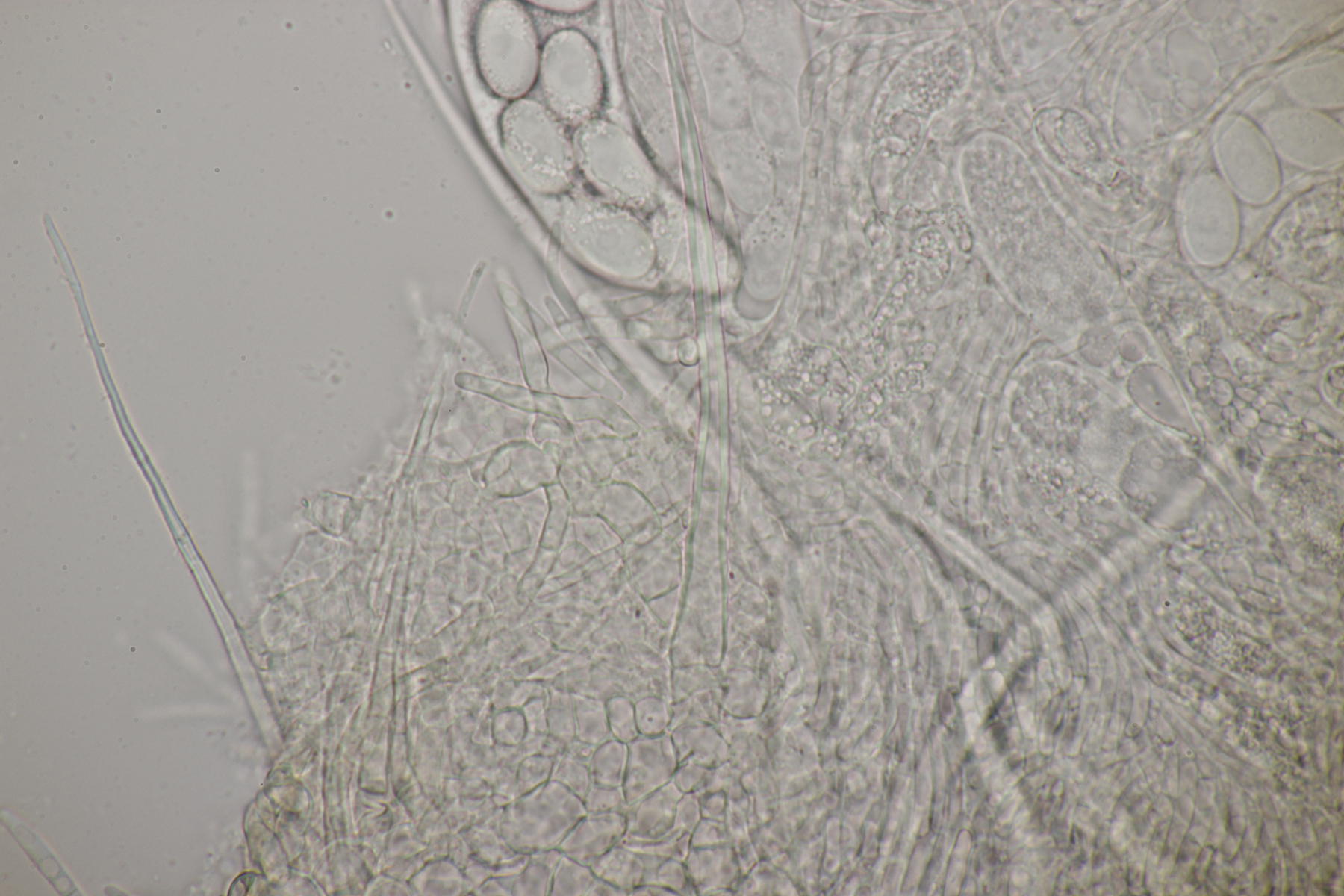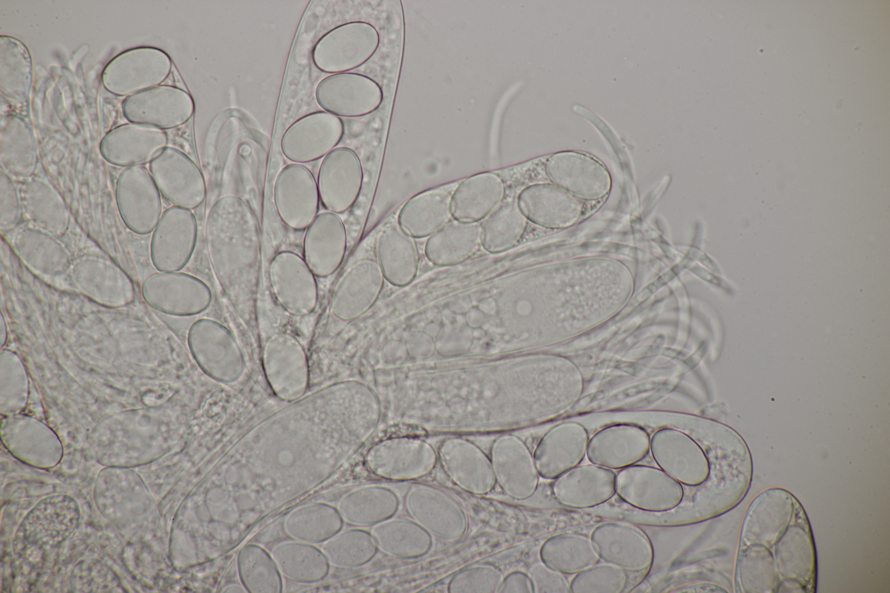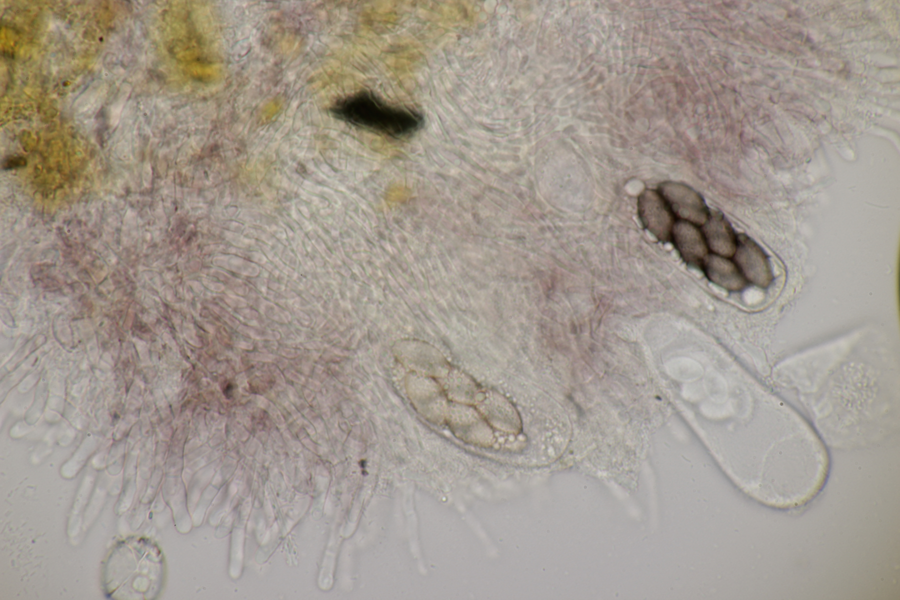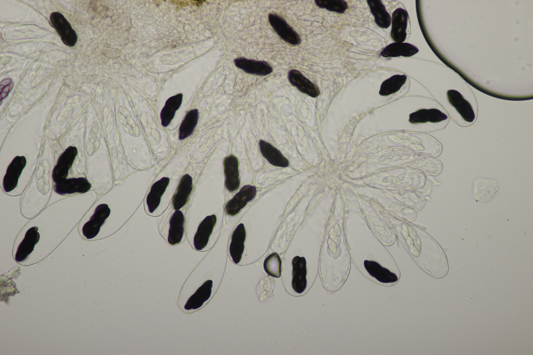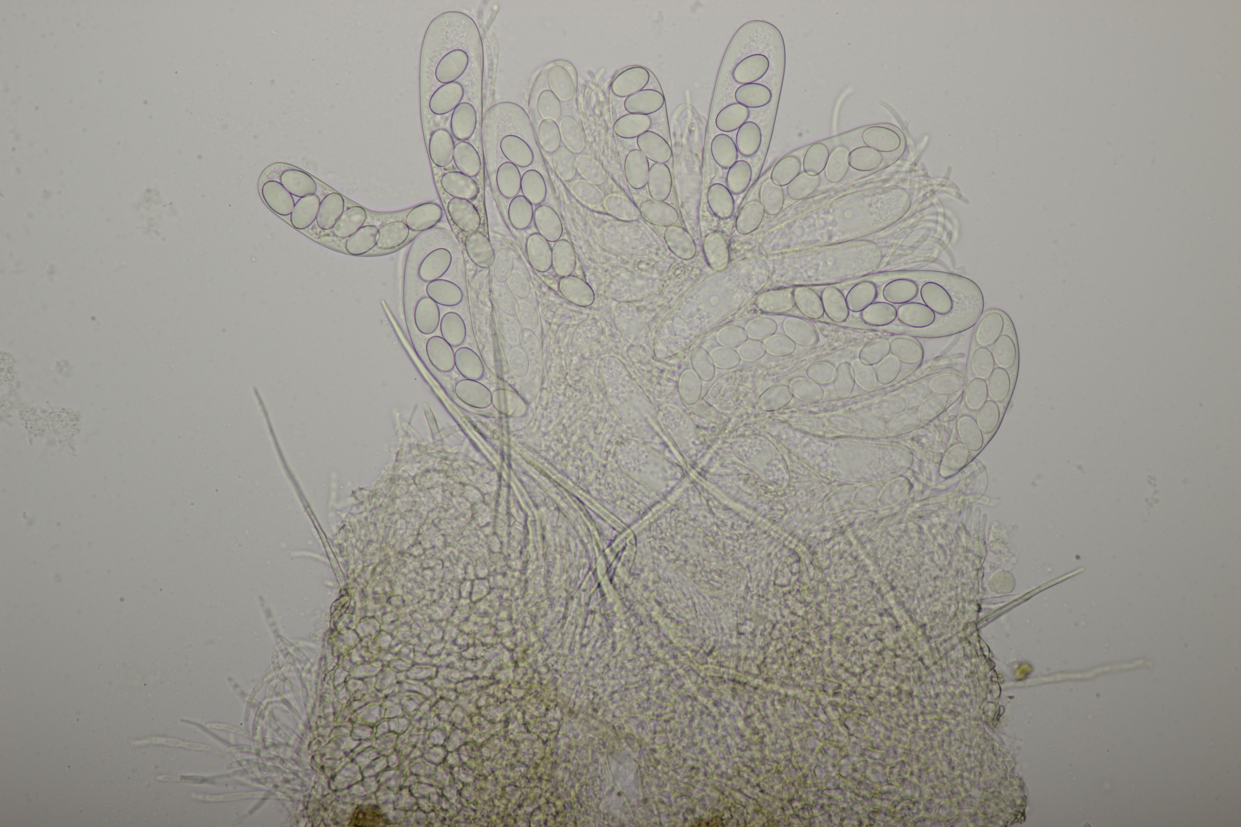 1. Ein Saccobolus. Die Sporen sind im 3-3-2-Schema angeordnet. Sporengröße ca. 15x6 µm. Paraphysen ohne gelbe Pigmente, also Section Eriobolus. Bei der Beurteilung des Episporiums tue ich mich schwer, würde aber vorsichtig zu glatt bis warzig-granuliert tendieren. Mit dem sehr kleinen Fruchtkörper lande ich dann bei Saccobolus depauperatus. Andererseits sind die Asci 110 µm lang und 30-40 µm breit, was dann eher zu S. versicolor passen würde.