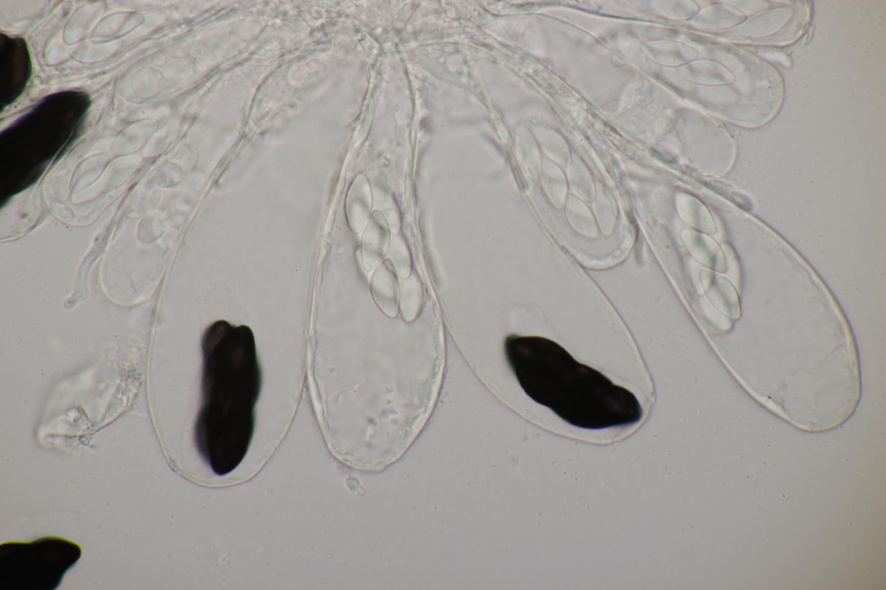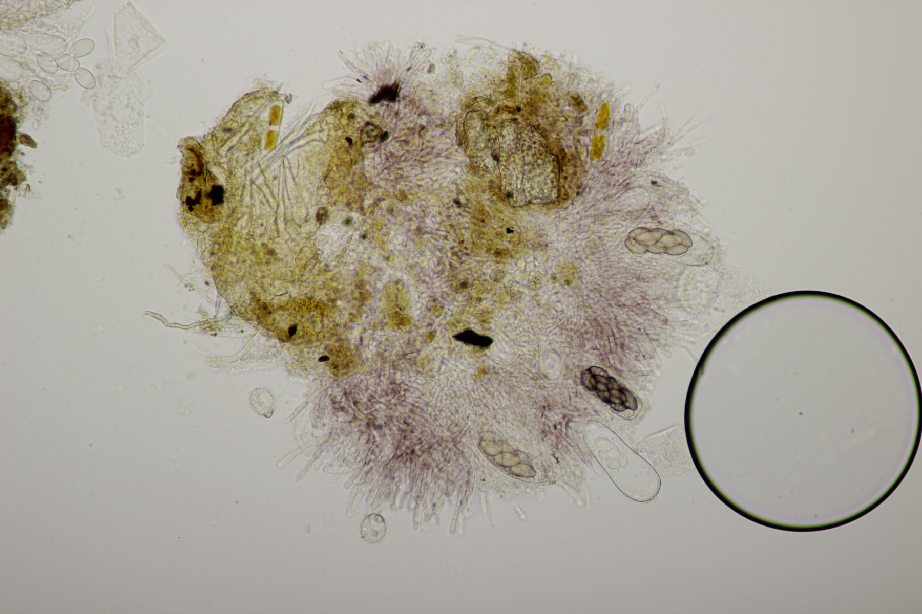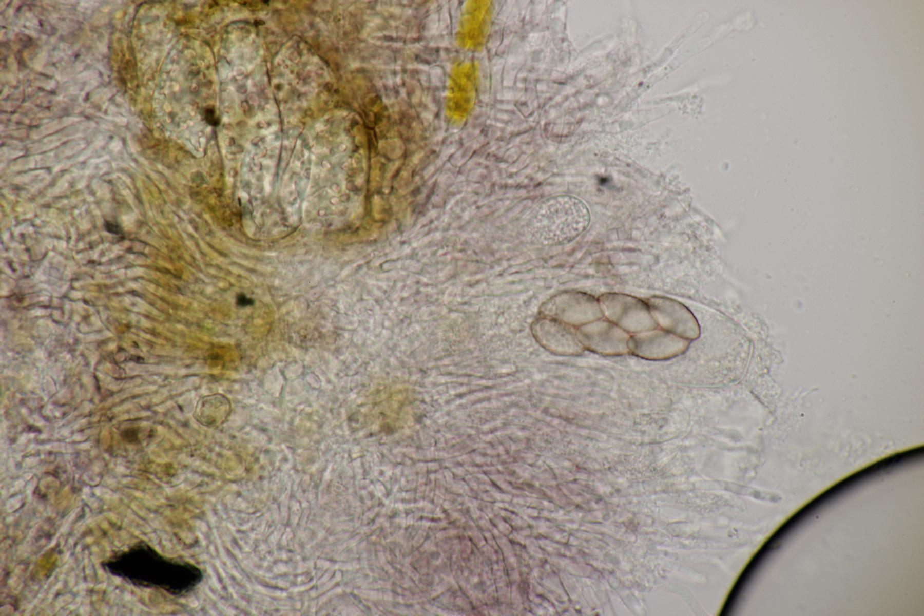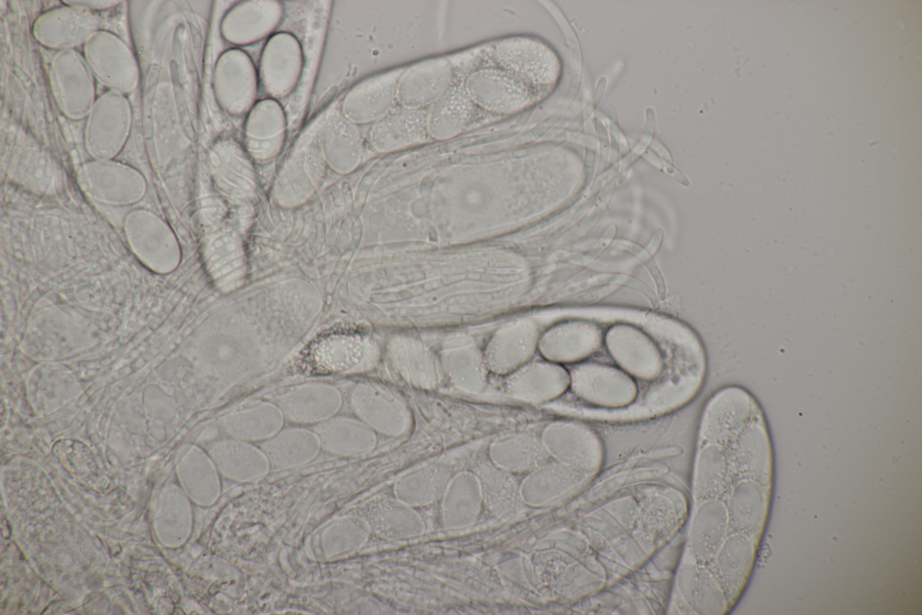 1. Ein Saccobolus. Die Sporen sind im 3-3-2-Schema angeordnet. Sporengröße ca. 15x6 µm. Paraphysen ohne gelbe Pigmente, also Section Eriobolus. Bei der Beurteilung des Episporiums tue ich mich schwer, würde aber vorsichtig zu glatt bis warzig-granuliert tendieren. Mit dem sehr kleinen Fruchtkörper lande ich dann bei Saccobolus depauperatus. Andererseits sind die Asci 110 µm lang und 30-40 µm breit, was dann eher zu S. versicolor passen würde.