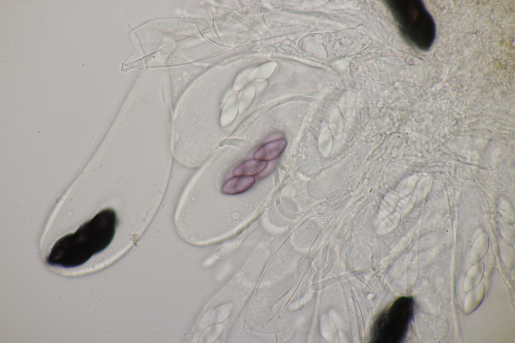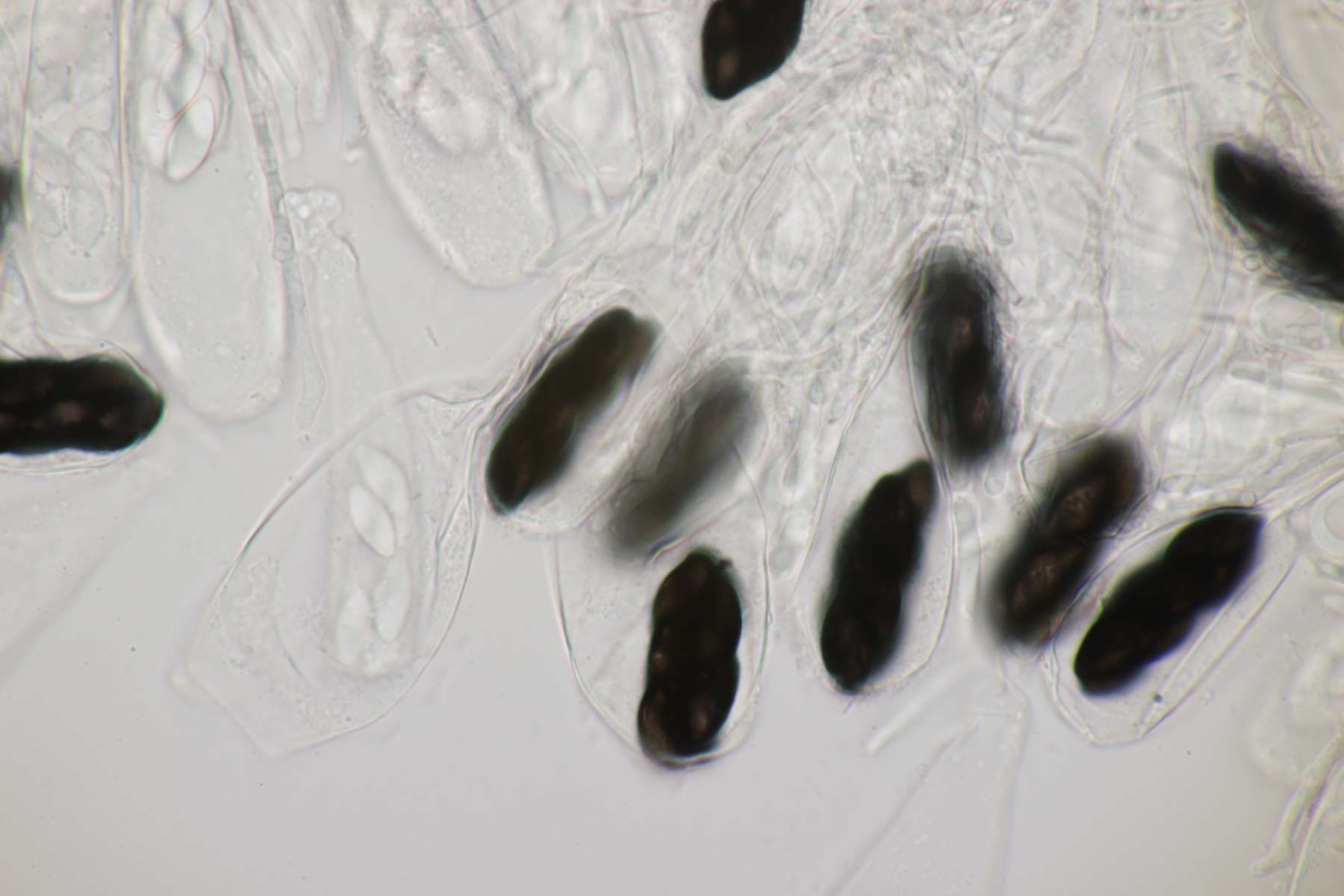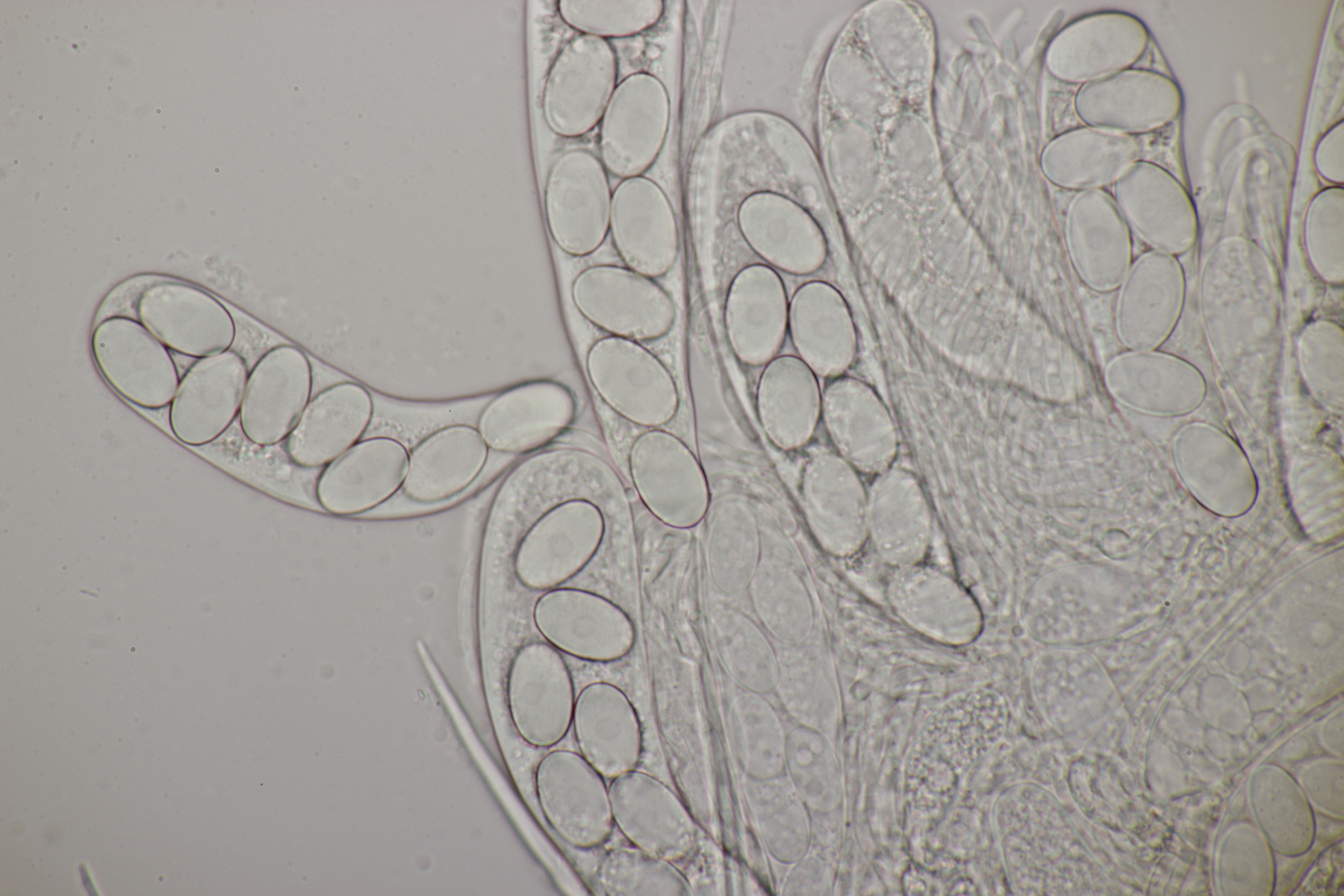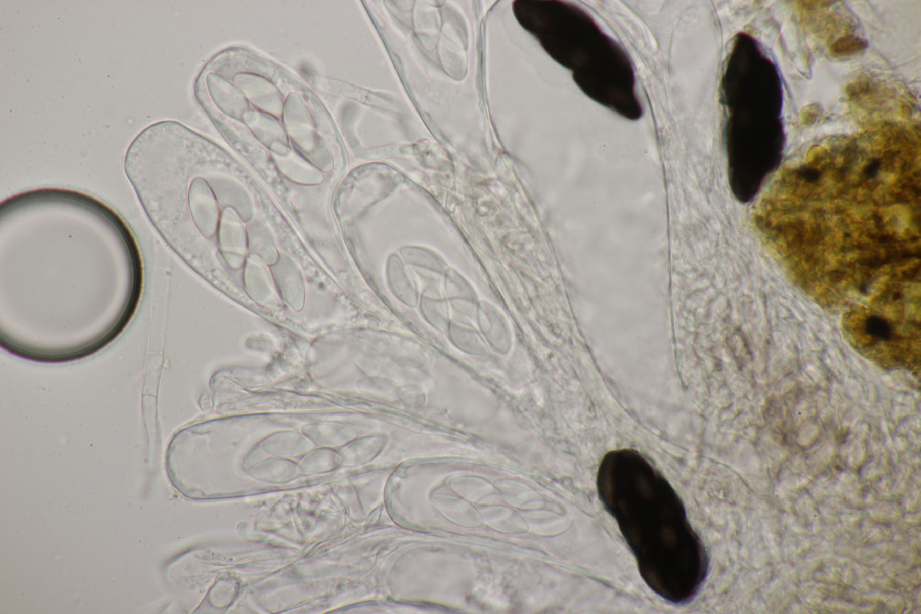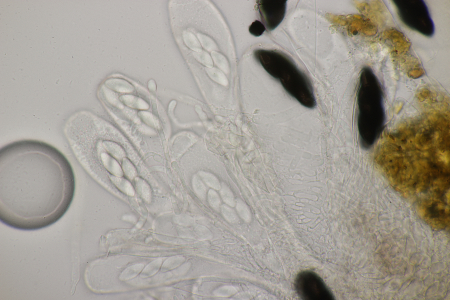 1. Ein Saccobolus. Die Sporen sind im 3-3-2-Schema angeordnet. Sporengröße ca. 15x6 µm. Paraphysen ohne gelbe Pigmente, also Section Eriobolus. Bei der Beurteilung des Episporiums tue ich mich schwer, würde aber vorsichtig zu glatt bis warzig-granuliert tendieren. Mit dem sehr kleinen Fruchtkörper lande ich dann bei Saccobolus depauperatus. Andererseits sind die Asci 110 µm lang und 30-40 µm breit, was dann eher zu S. versicolor passen würde.