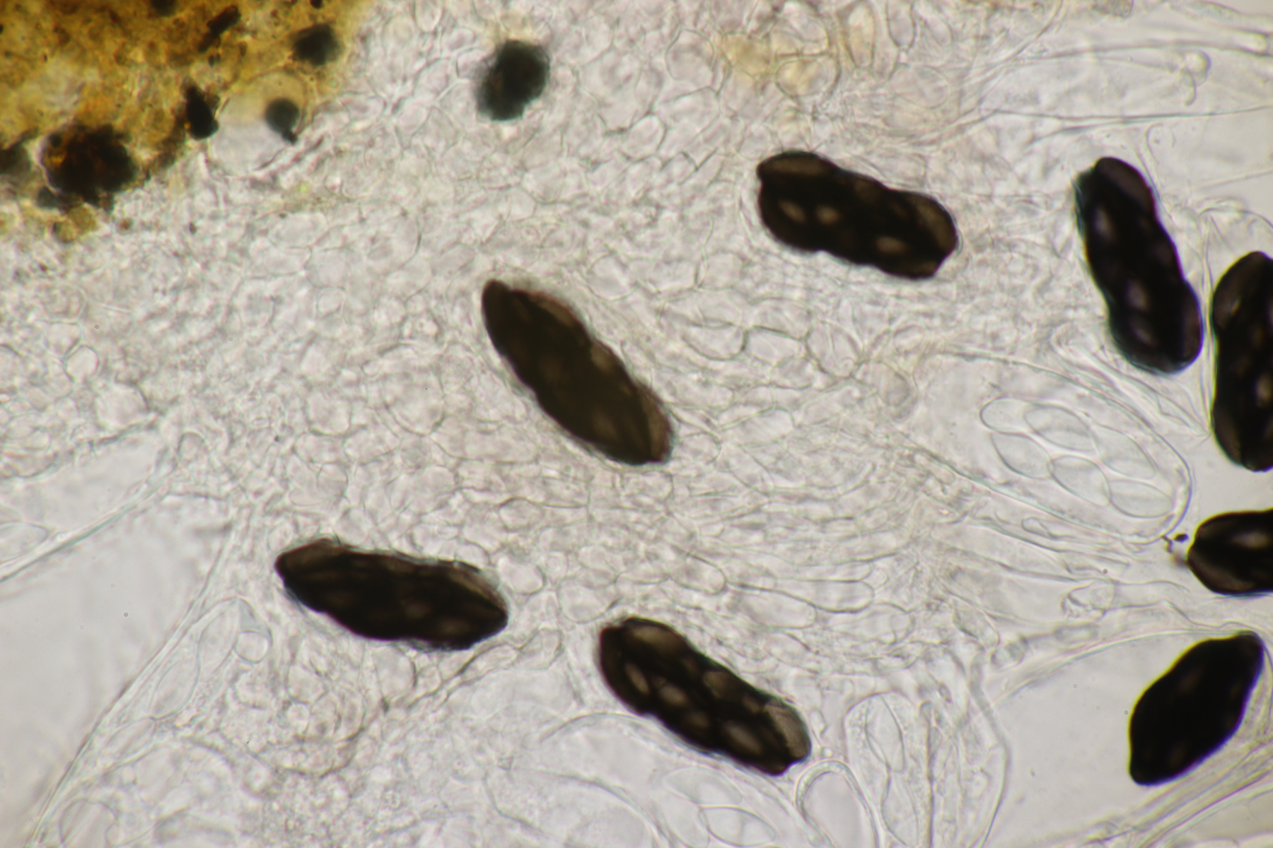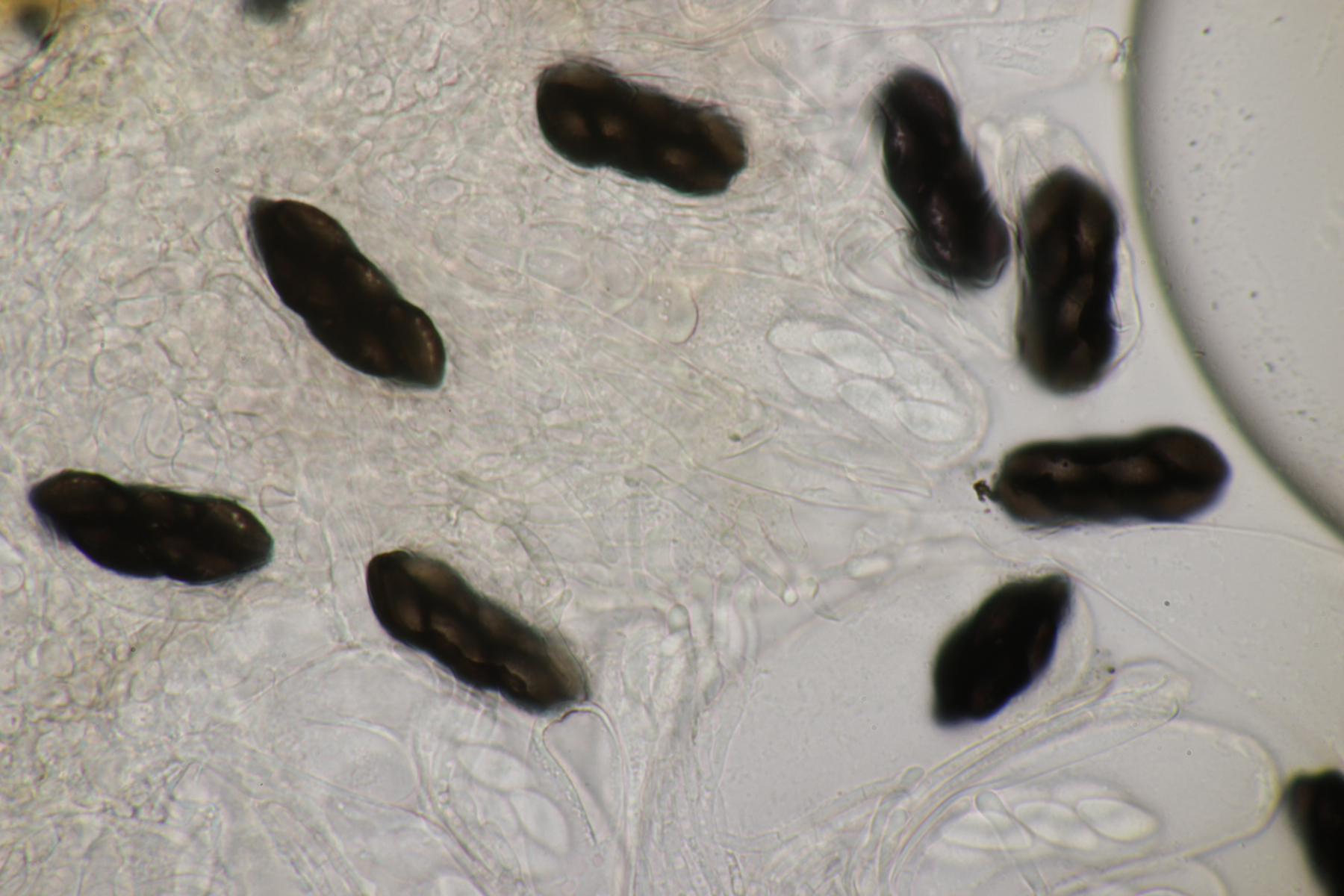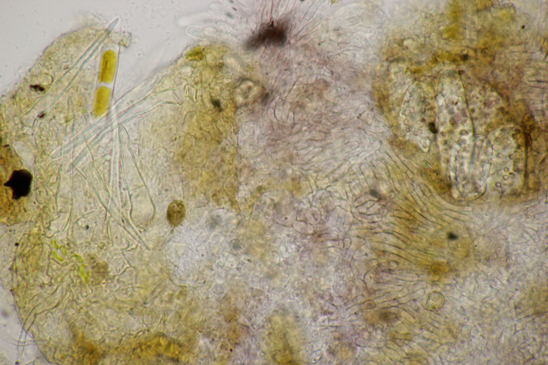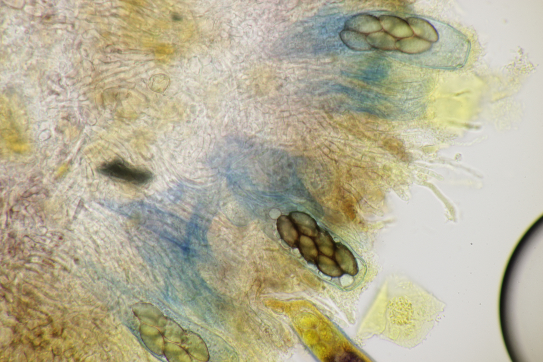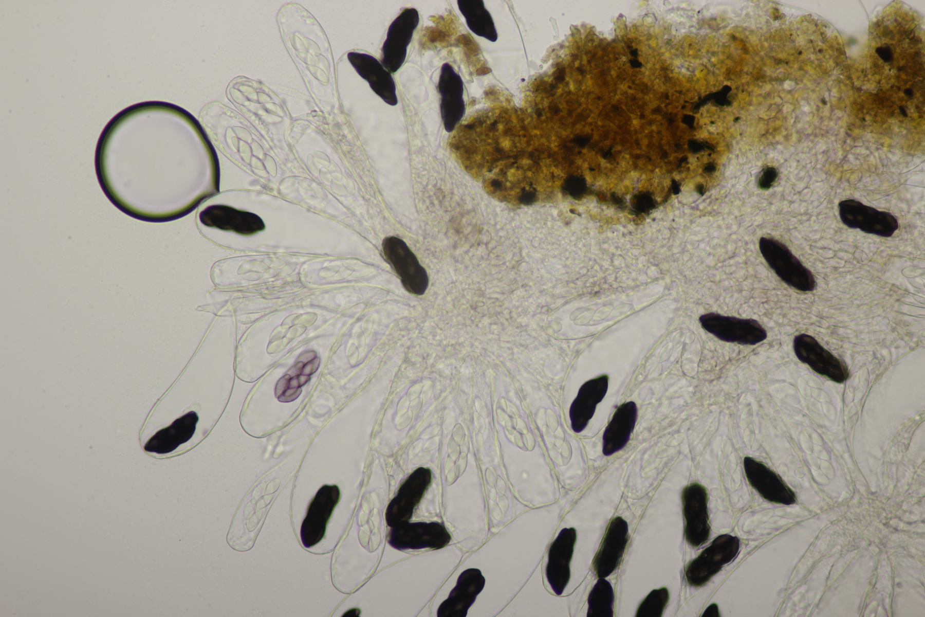 1. Ein Saccobolus. Die Sporen sind im 3-3-2-Schema angeordnet. Sporengröße ca. 15x6 µm. Paraphysen ohne gelbe Pigmente, also Section Eriobolus. Bei der Beurteilung des Episporiums tue ich mich schwer, würde aber vorsichtig zu glatt bis warzig-granuliert tendieren. Mit dem sehr kleinen Fruchtkörper lande ich dann bei Saccobolus depauperatus. Andererseits sind die Asci 110 µm lang und 30-40 µm breit, was dann eher zu S. versicolor passen würde.