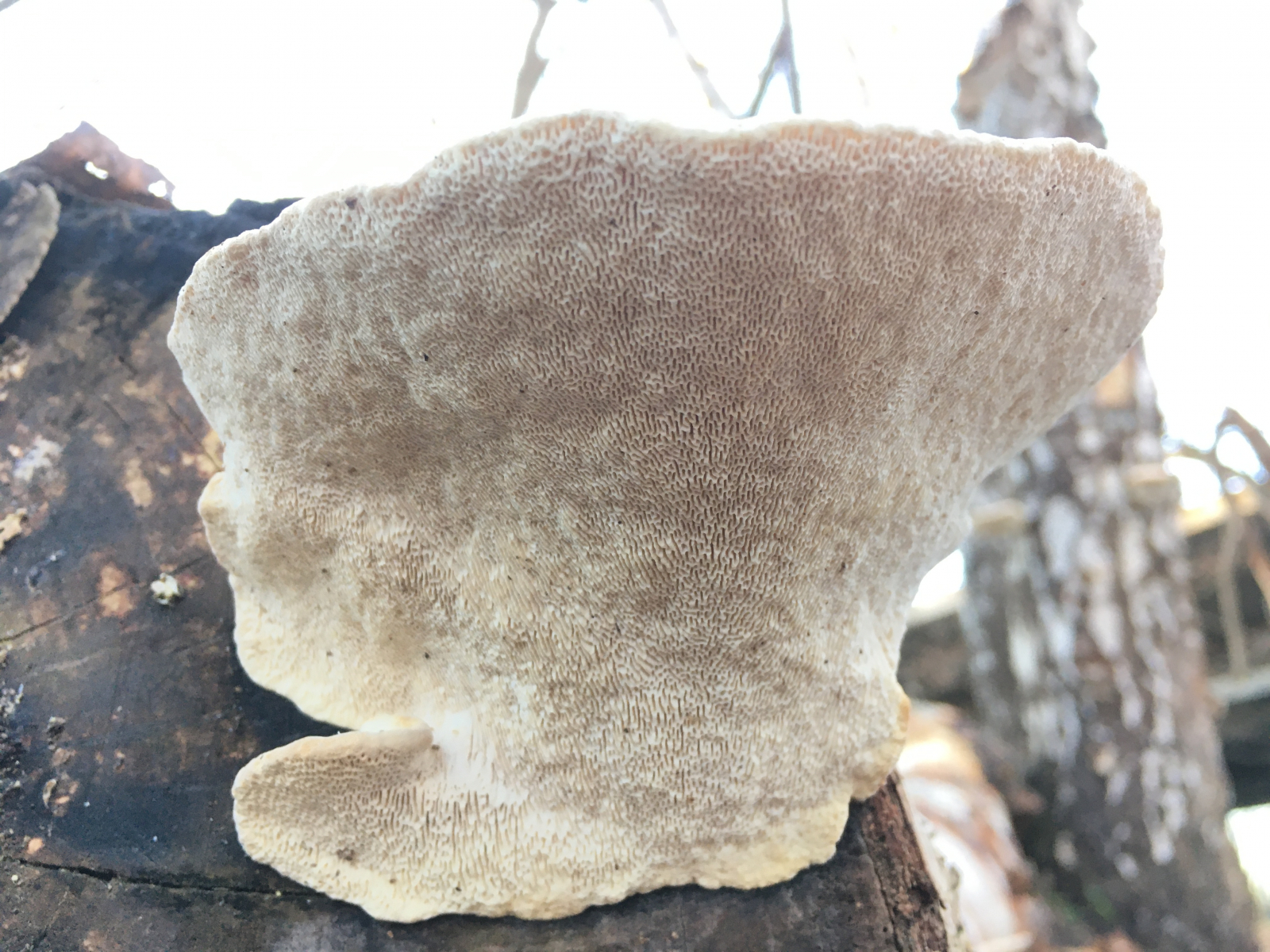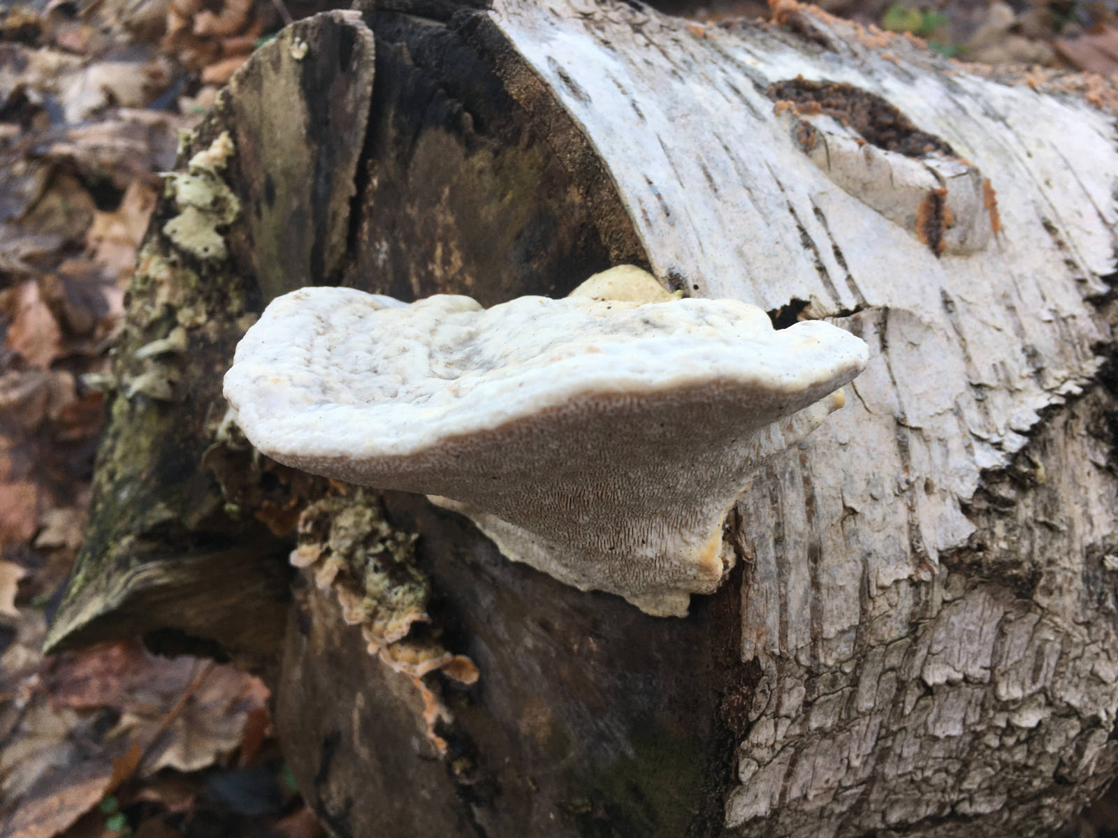 #1 an liegendem Laubholzstamm, zB Birke: Trametes gibbosa