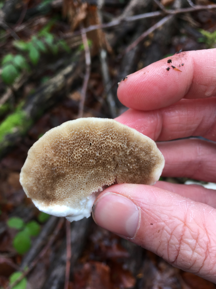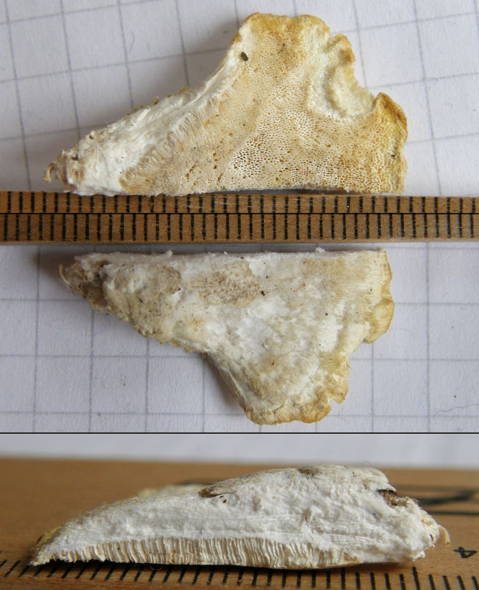 #2 Lauholz, zB Birke, teilentrindet. FK nicht ganz fest, jedoch zäh. Kein Geruch. Für Tr. gibbosa sind mir die Poren allerdings nicht länglich genug- evtl eine geruchlose Tr. suaveolens?