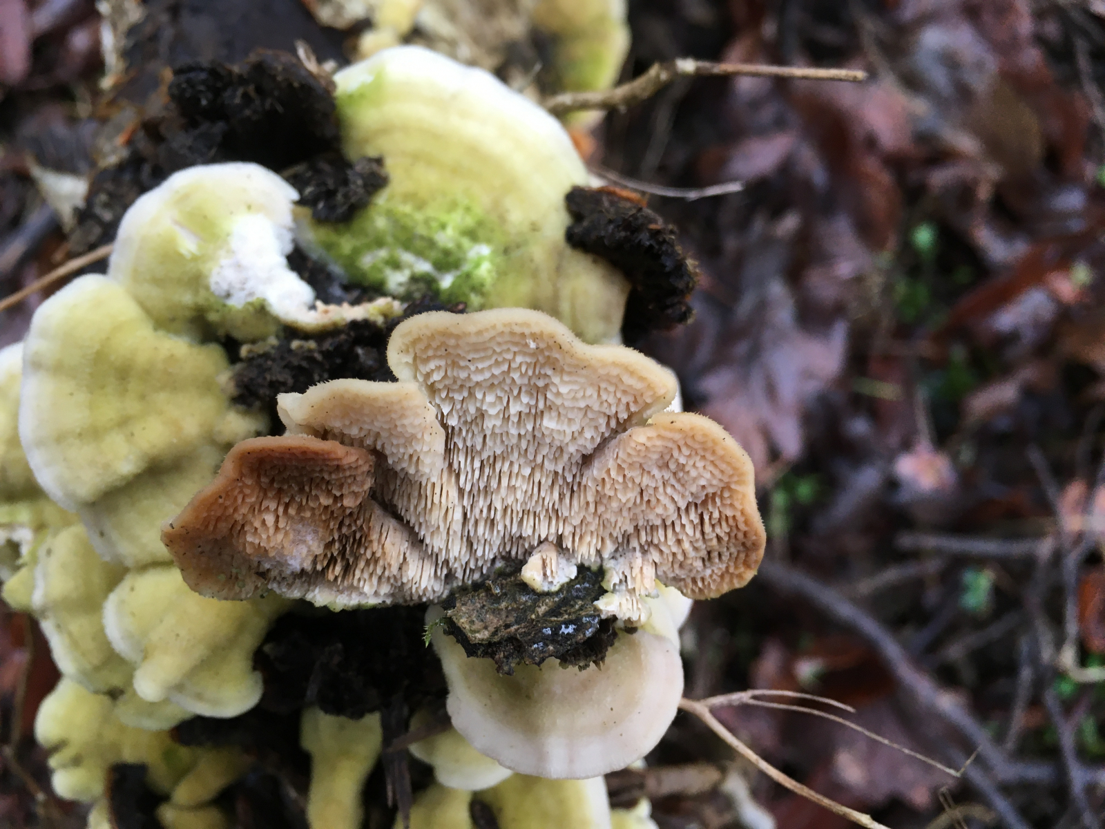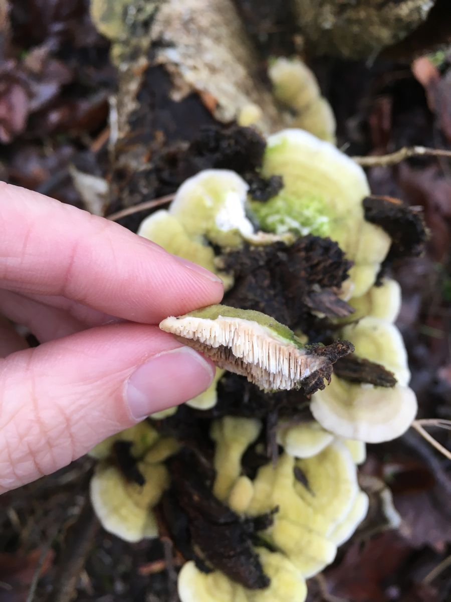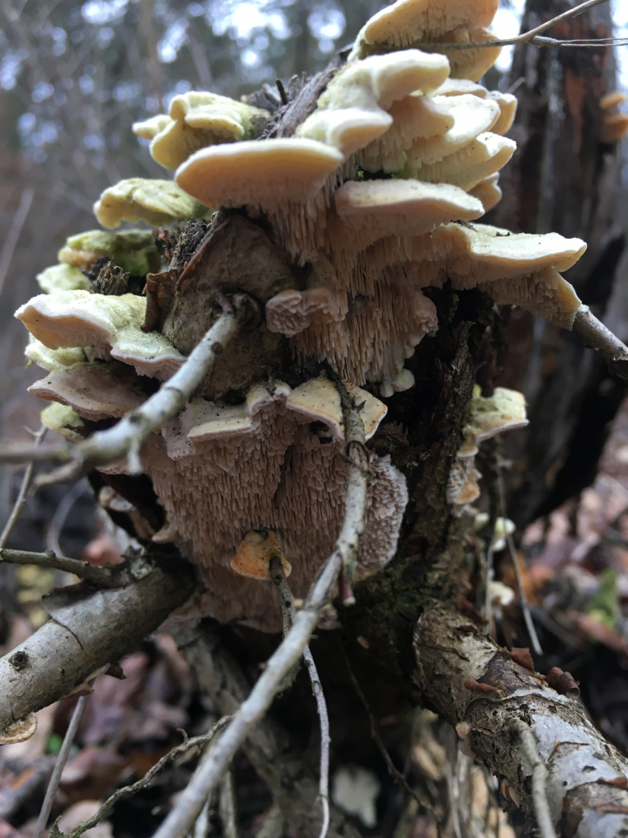 #4 an Laubholz im Gebüsch eines Industriegeländes. Den fand ich recht interessant. FK ca max. 6-8cm abgeschirmt. Ich würde ihn a.e.für Irpex lacteum den Milchweissen Eggenpilz halten. (Spongipellis pachyodon scheint weniger weit "abzuschirmen" bzw Stecch. oreophilum ist wohl insgesamt eher kleiner?)