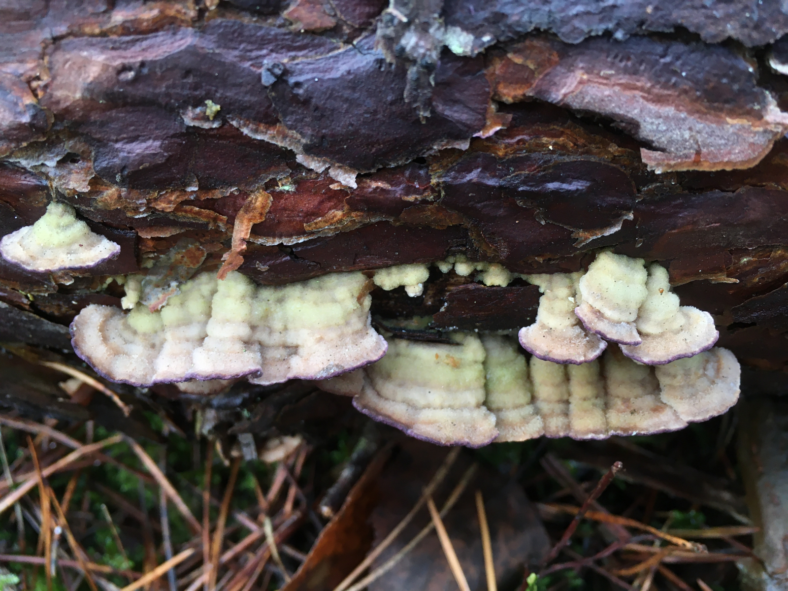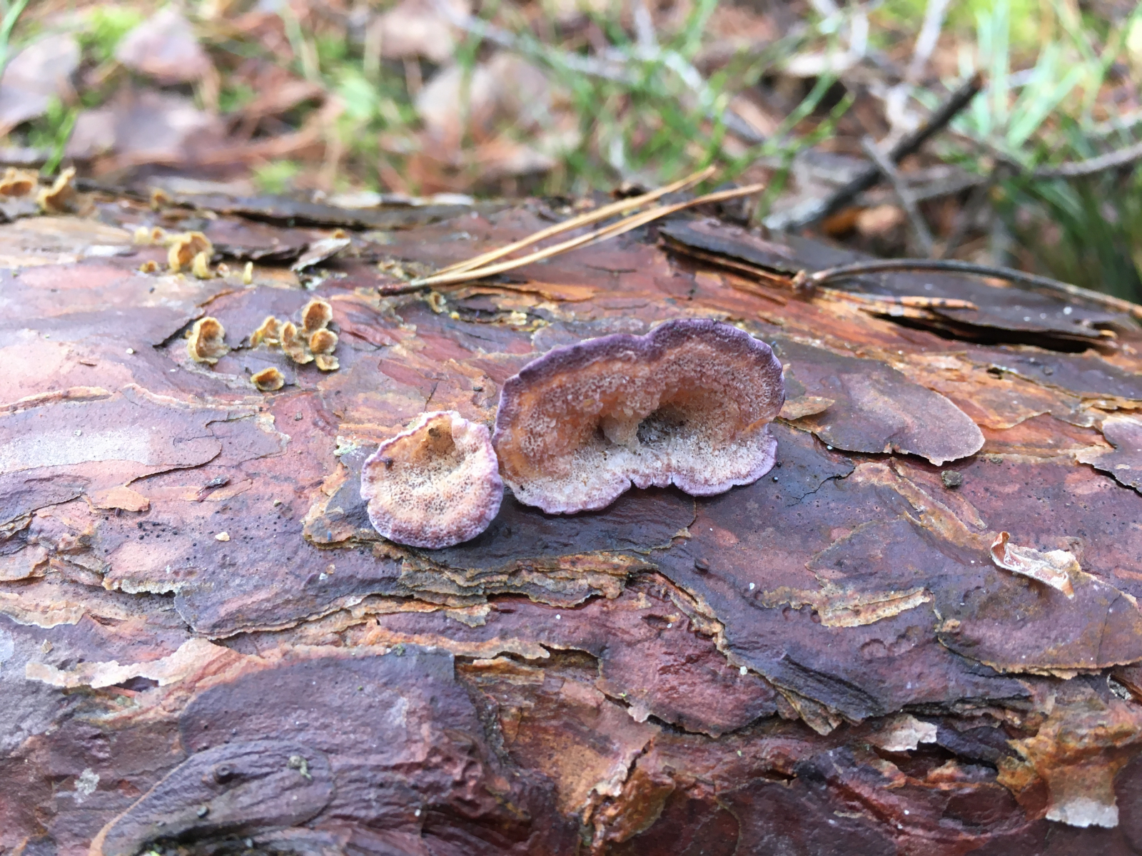 #5 an Föhre, liegend. FK ca 1,5-2 cm "abschirmend", dünn (schichtpilzartig), fest, weissfilzig, Rand deutlich violett, Poren fein, polygonal. zB Violetter Lederporling