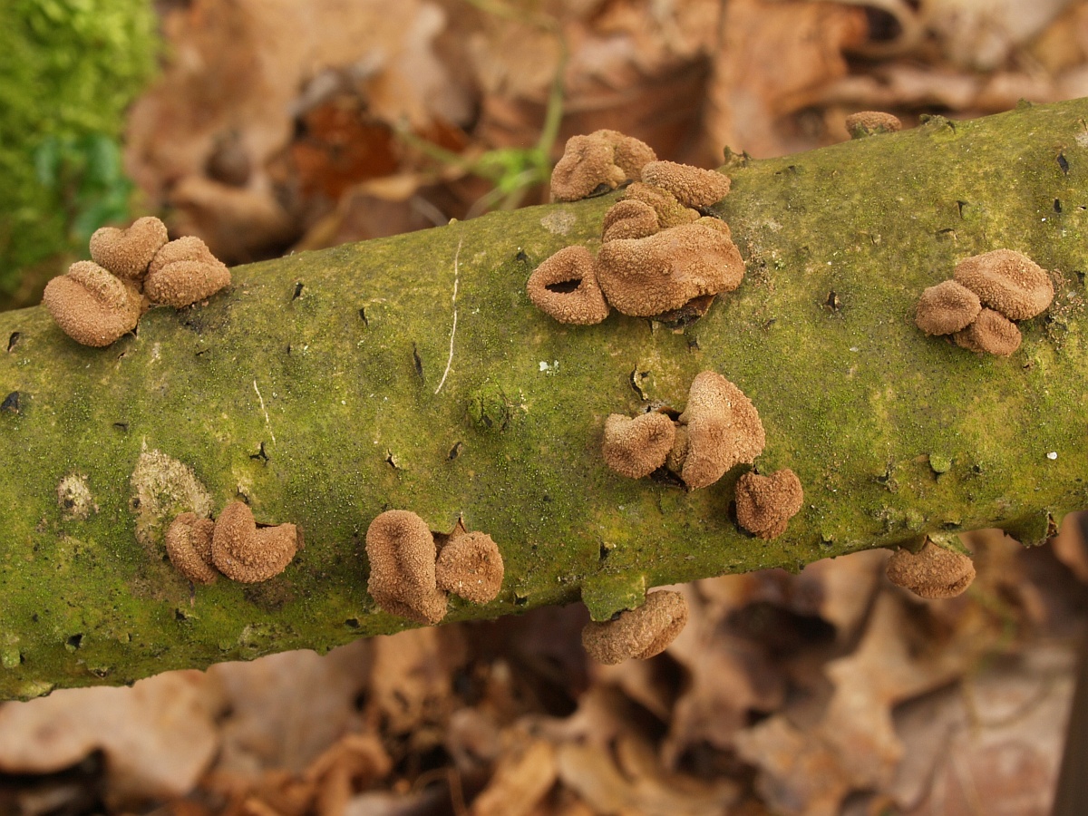 Obwohl in meinem Hauswald hunderte Haselsträucher stehen erst zum zweiten Mal gefunden Kleiiger Haselbecherling (Encoelia furfuracea)
