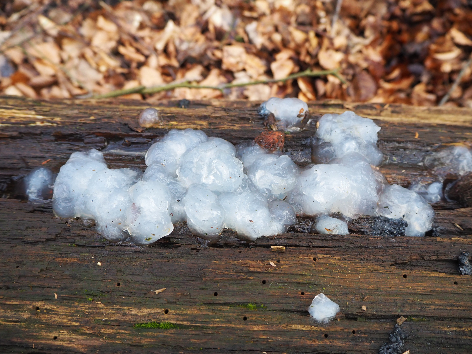 Ich bin deshalb davon ausgegangen, dass es sich um einen Pilz handeln muss, weil zwar fast an der gesamten umgestürzten Buche die Rinde ab war, jedoch nur an der einen Stelle, an dem sich das Glibberdingens befand, das Holz bereits so weit zersetzt war, dass man eine kleine Mulde sah. An keiner anderen Stelle war das der Fall. Für mich sah es deshalb so aus, also ob das Glibberdingens eine Zersetzungsfunktion hat. Vielleicht aber auch reiner Zufall... 😉