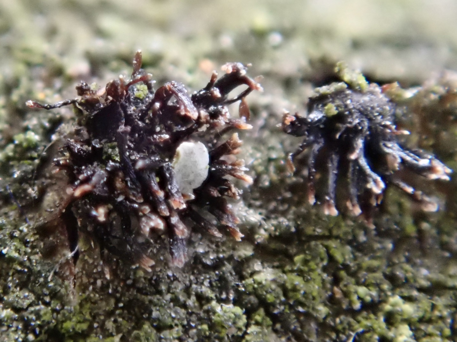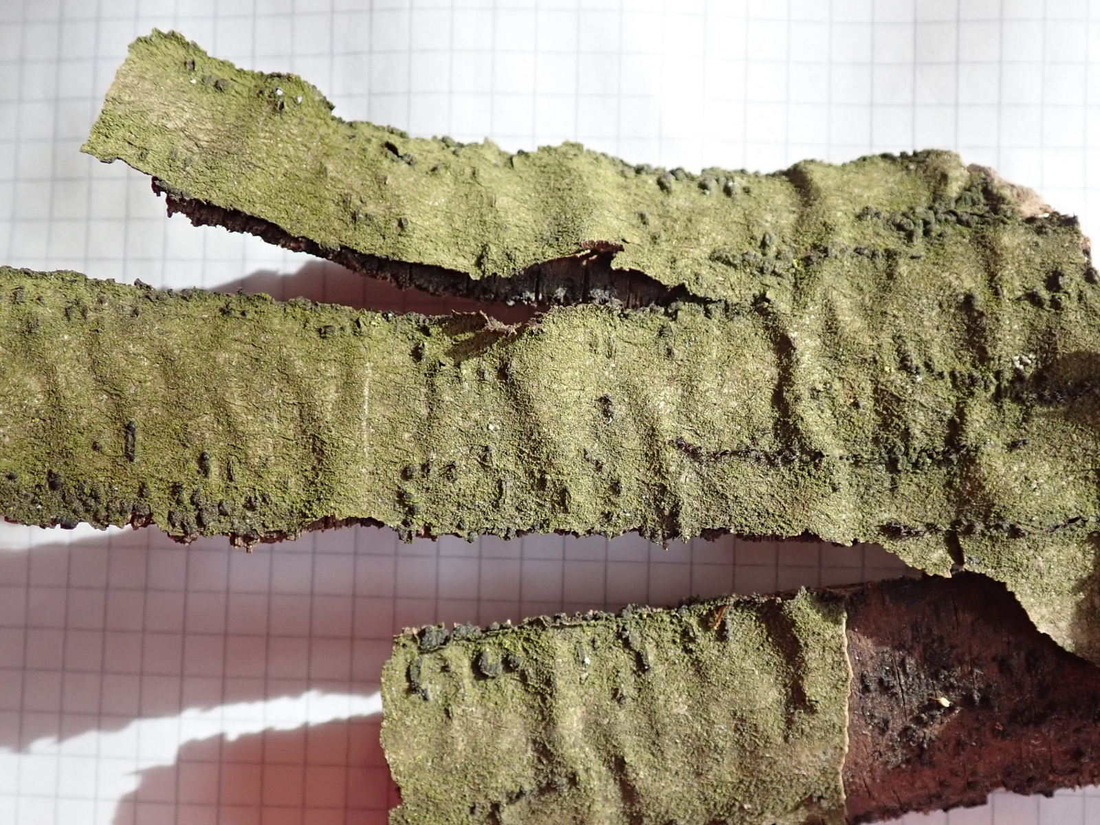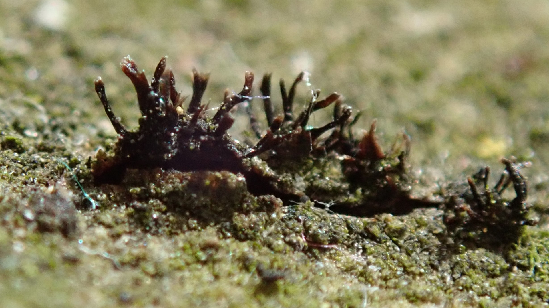 heute habe ich beim Aufräumen dieses Stück Buchenrinde mit dunklen spitzigen Pilzchen wiedergefunden.