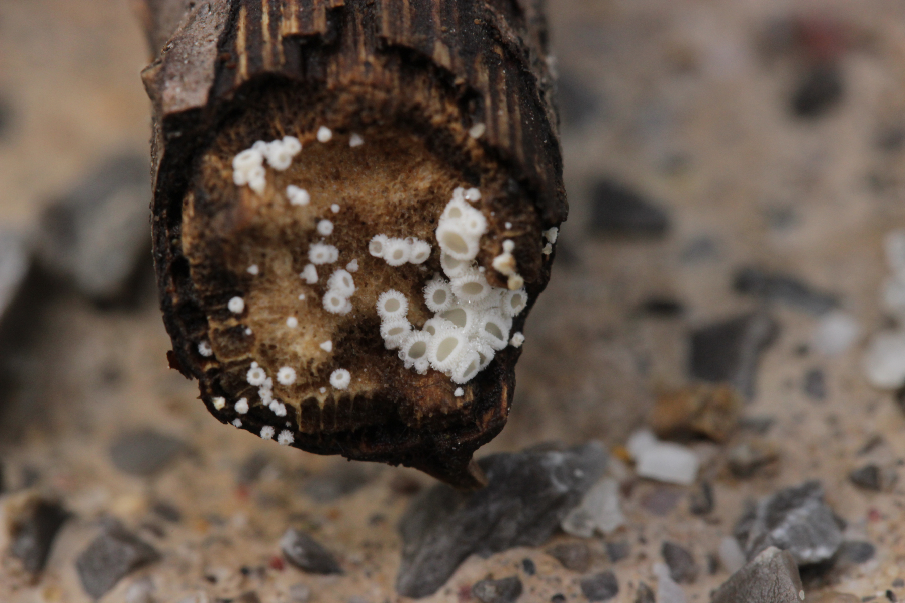 1. An totem Rubus fruticosus agg. fanden sich hübsche weiße Becherchen. Leider kann ich gerade nicht alle Mikrobilder eindeutig meinen Funden zuordnen, deshalb zunächst mal nur die Bilder, die sicher zu diesem Becher gehören