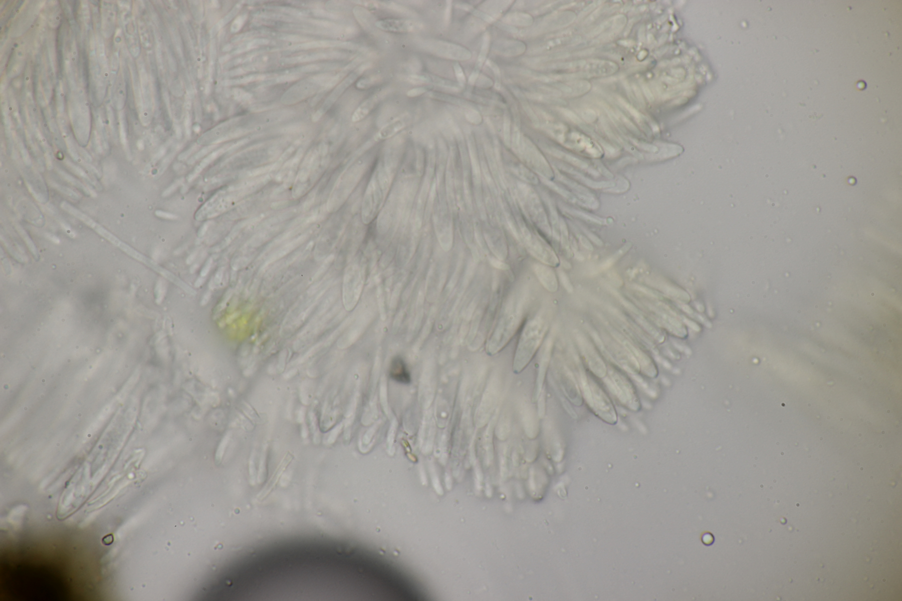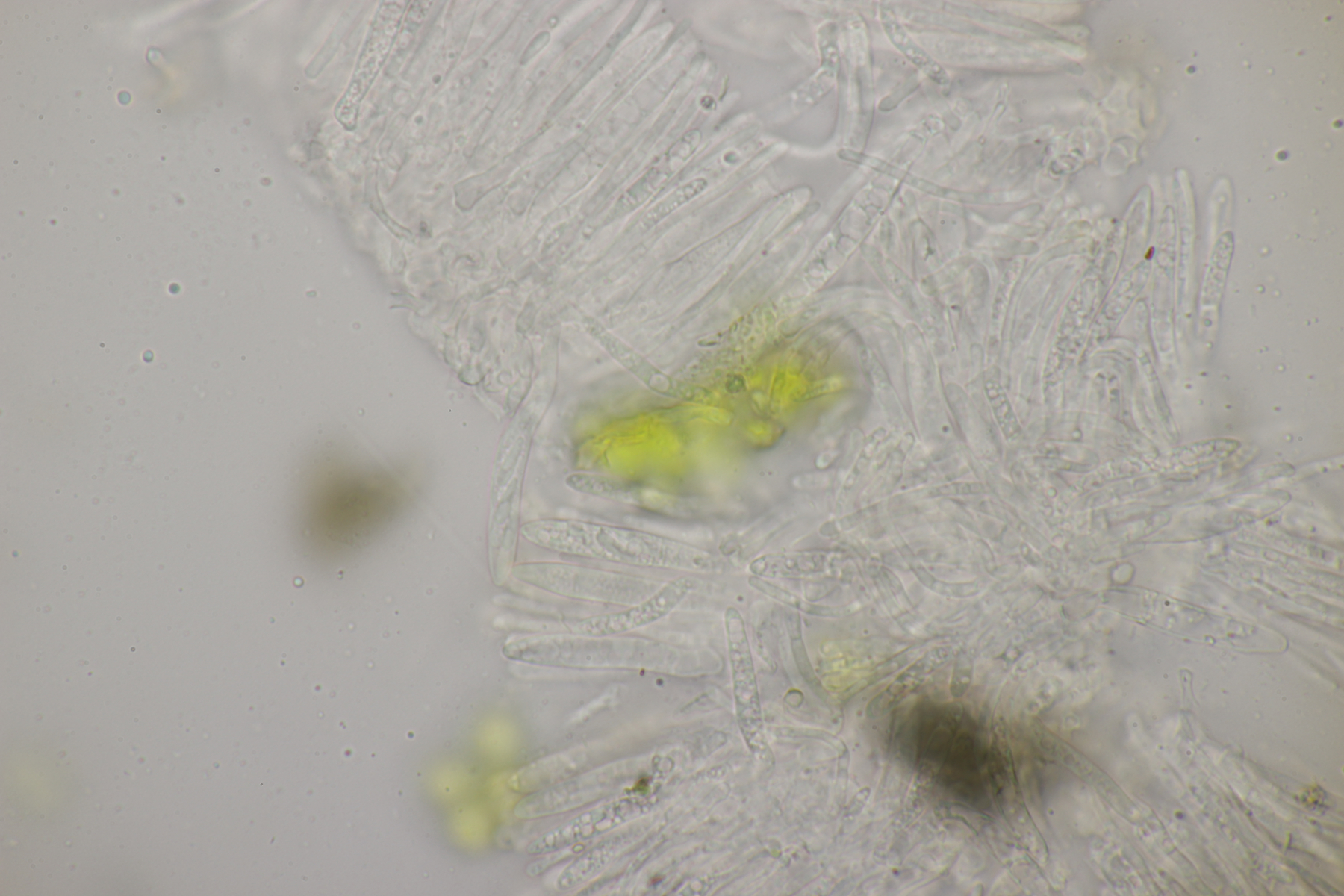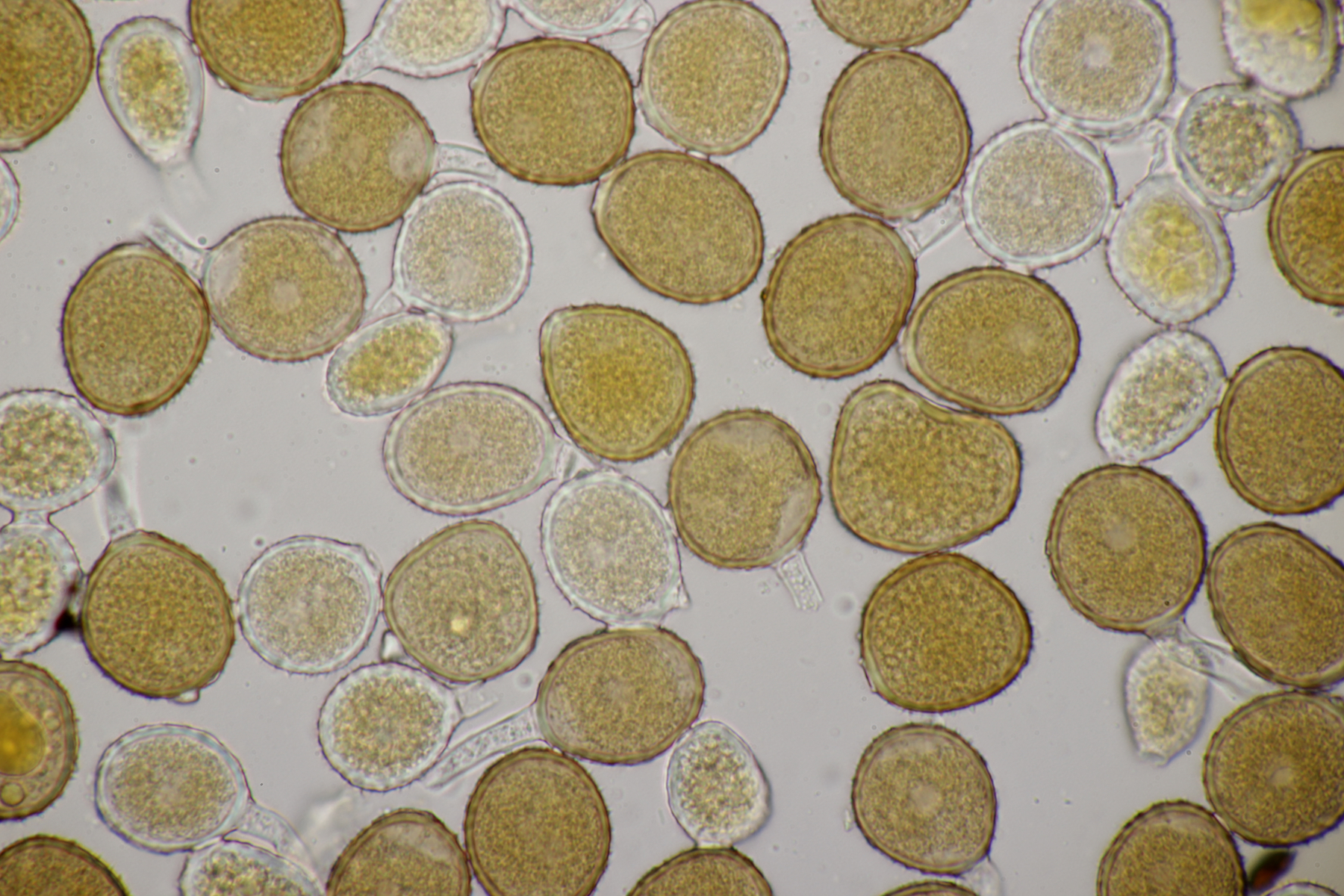 ich hatte eine Probe mitgenommen, bei der mittlerweile auch einige wenige Fruchtkörper reif geworden sind. Mikroskopisch sieht das ganze dann folgendermaßen aus: