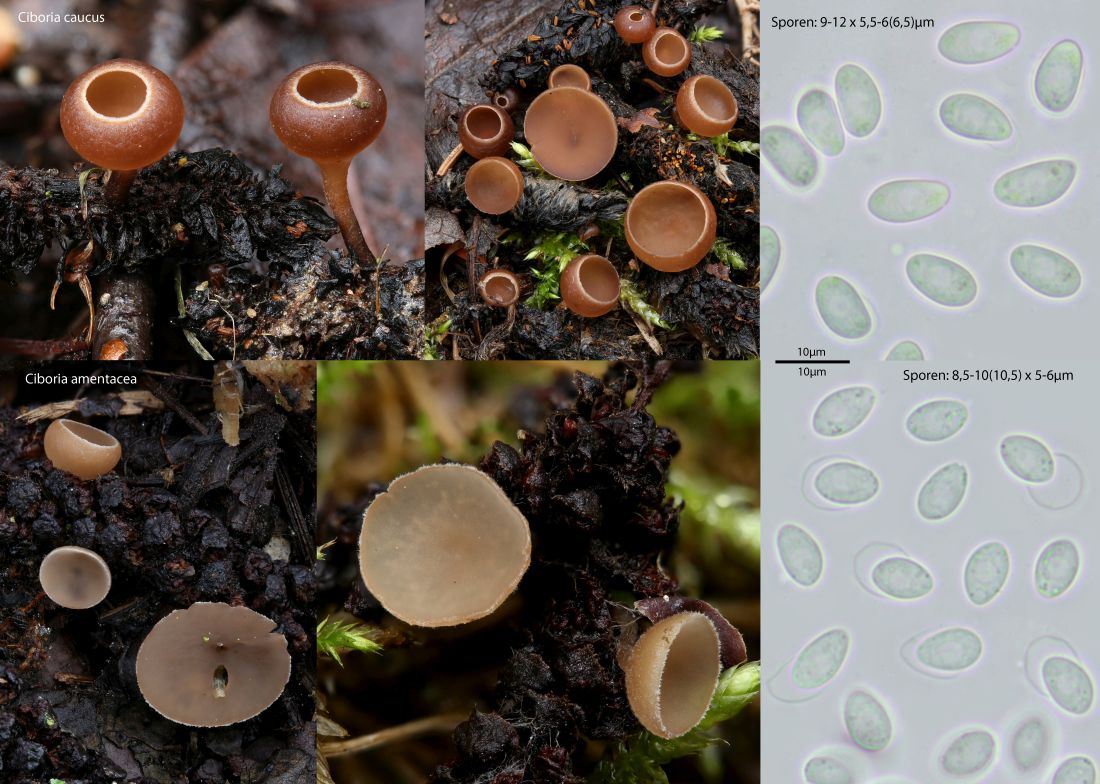 Noch keinen endgültigen Artnamen kann ich diesem Stromabecherling geben. Sicher ausschließen kann ich Ciboria coryli, da kein Hasel in der Nähe und die Sporen im Schnitt nur 10,2 mµ lang waren. Als Wirt kommt wohl Weide und Birke in Frage und auch Erle kann ich nicht ausschließen.