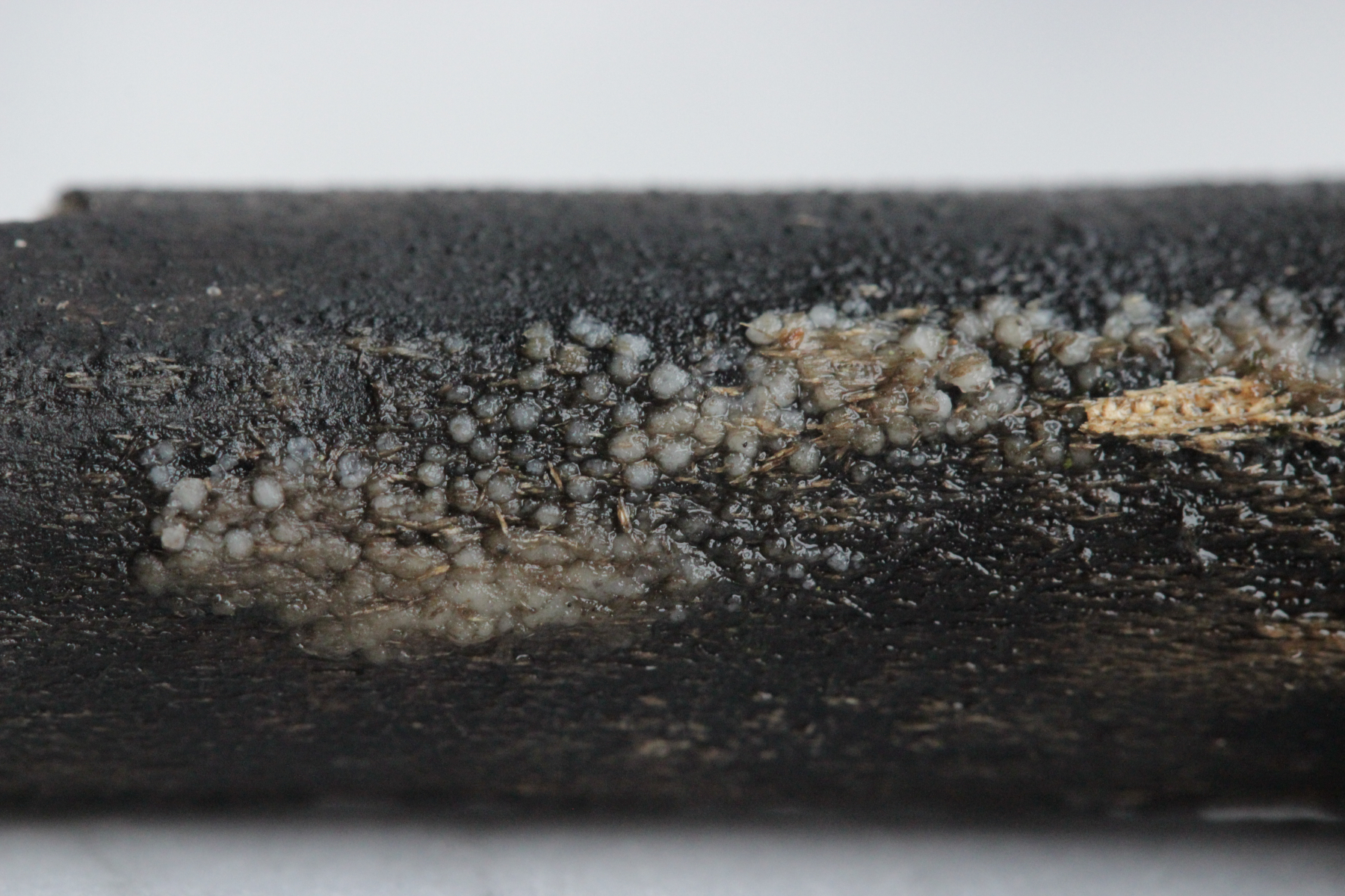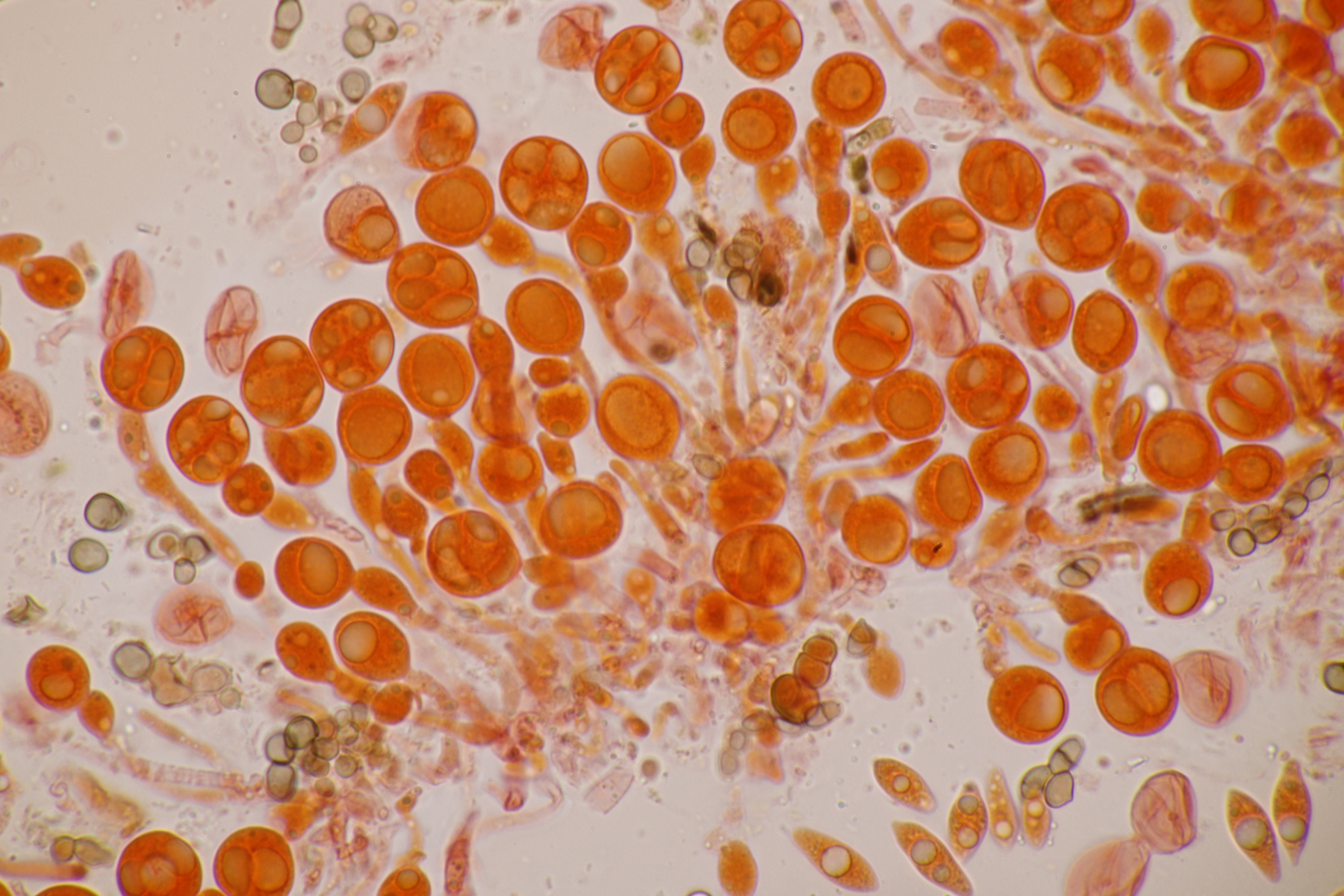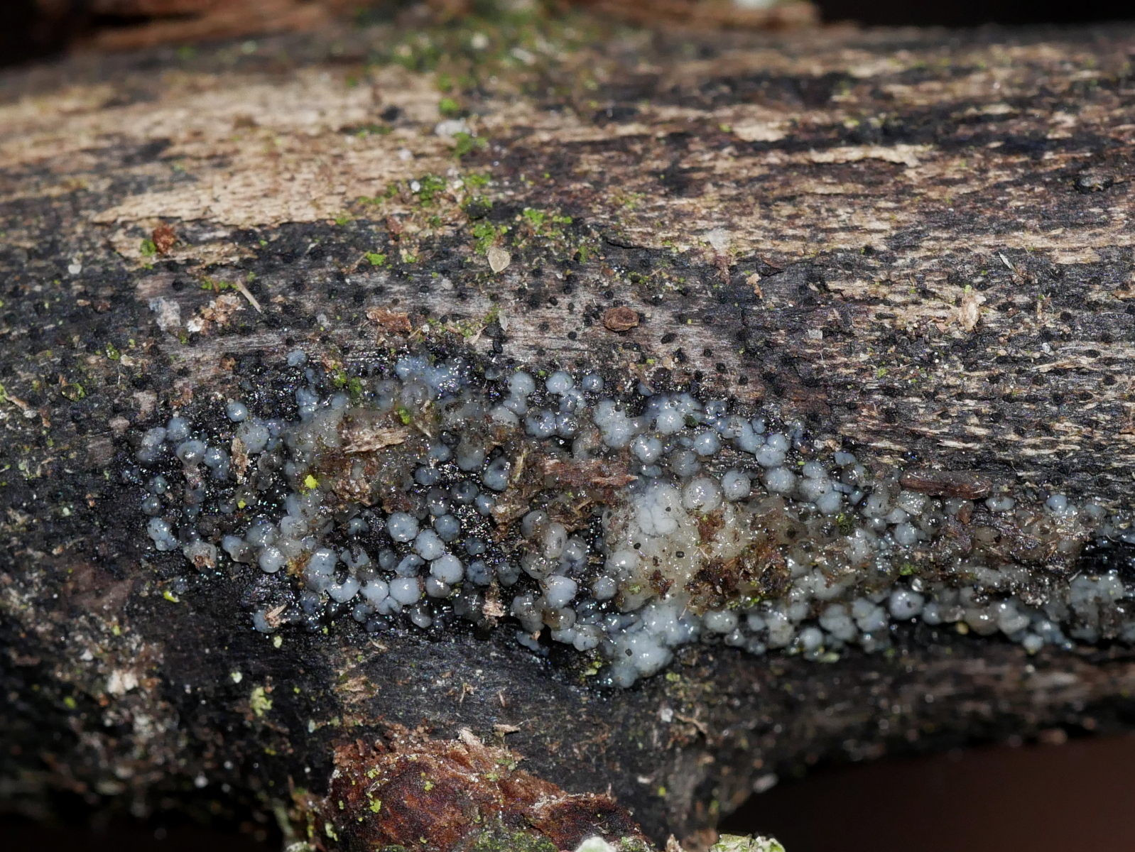 vor ein paar Tagen hatte Ralf G. auf Facebook kleine, weiße Glibberpunkte auf einem Holzstückchen präsentiert, die er in Viersen auf der Süchtelner Höhe gefunden hatte und bei denen er im Mikroskop nur Sporen über Sporen gesehen hat. Ich hatte ihm angeboten, daß er mir das gute Stück gerne mal übergeben kann, was er dann auch bei der gemeinsamen Exkursion in Mönchengladbach am Sonntag tat. Mit dem Mikroskop zeigte sich dann schnell, daß er hier (mal wieder) einen absoluten Glücksgriff getätigt hat, denn es handelt sich um Sirobasidium albidum, einen Heterobasidiomyceten, bei dem die runden Basidien in Ketten gebildet werden, was unterm Mikro sehr hübsch aussieht. Dazu kommt noch, daß der Pilz bis jetzt in Deutschland erst dreimal nachgewiesen wurde. Das ist aber nicht verwunderlich, weil so kleine Pilze, die bei Trockenheit bis zu Unkenntlichkeit zusammenschrumpeln natürlich schnell übersehen sind.