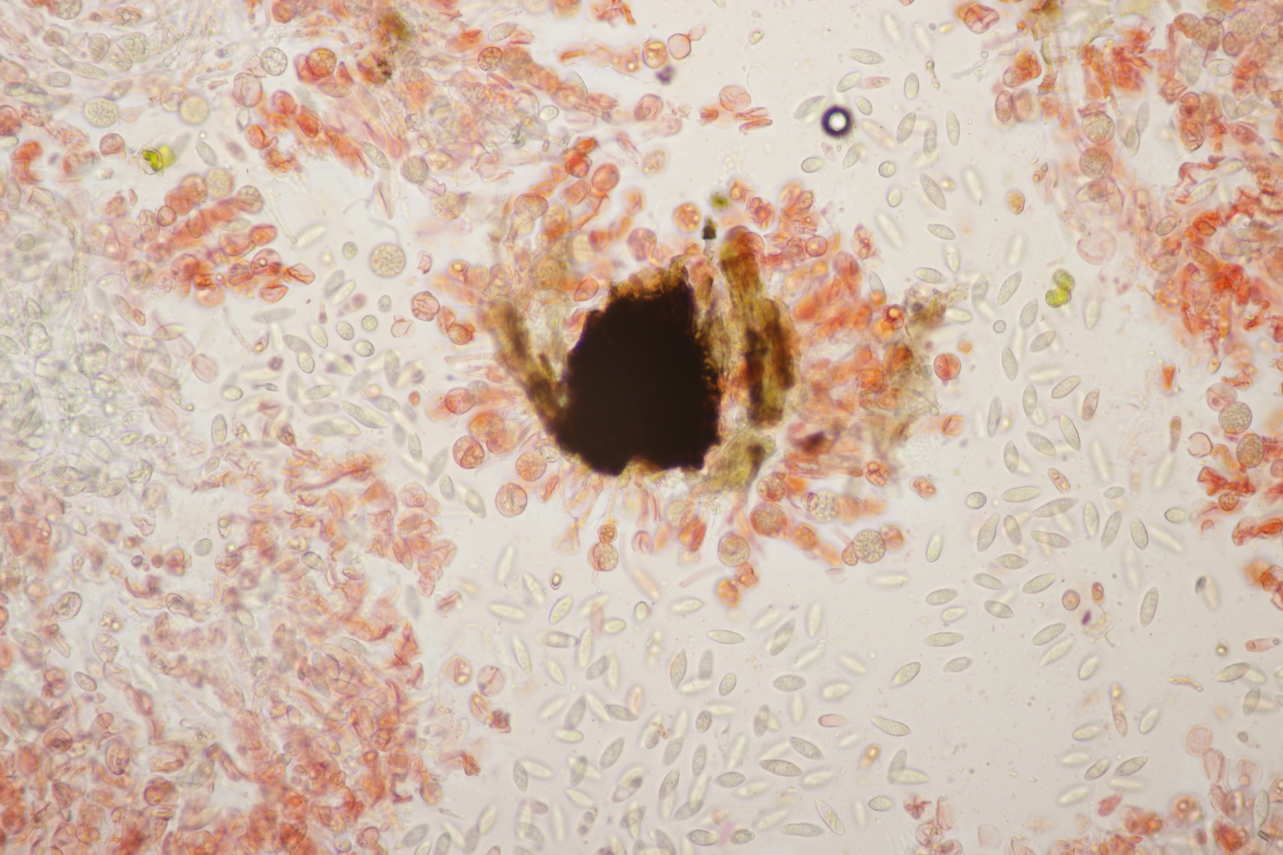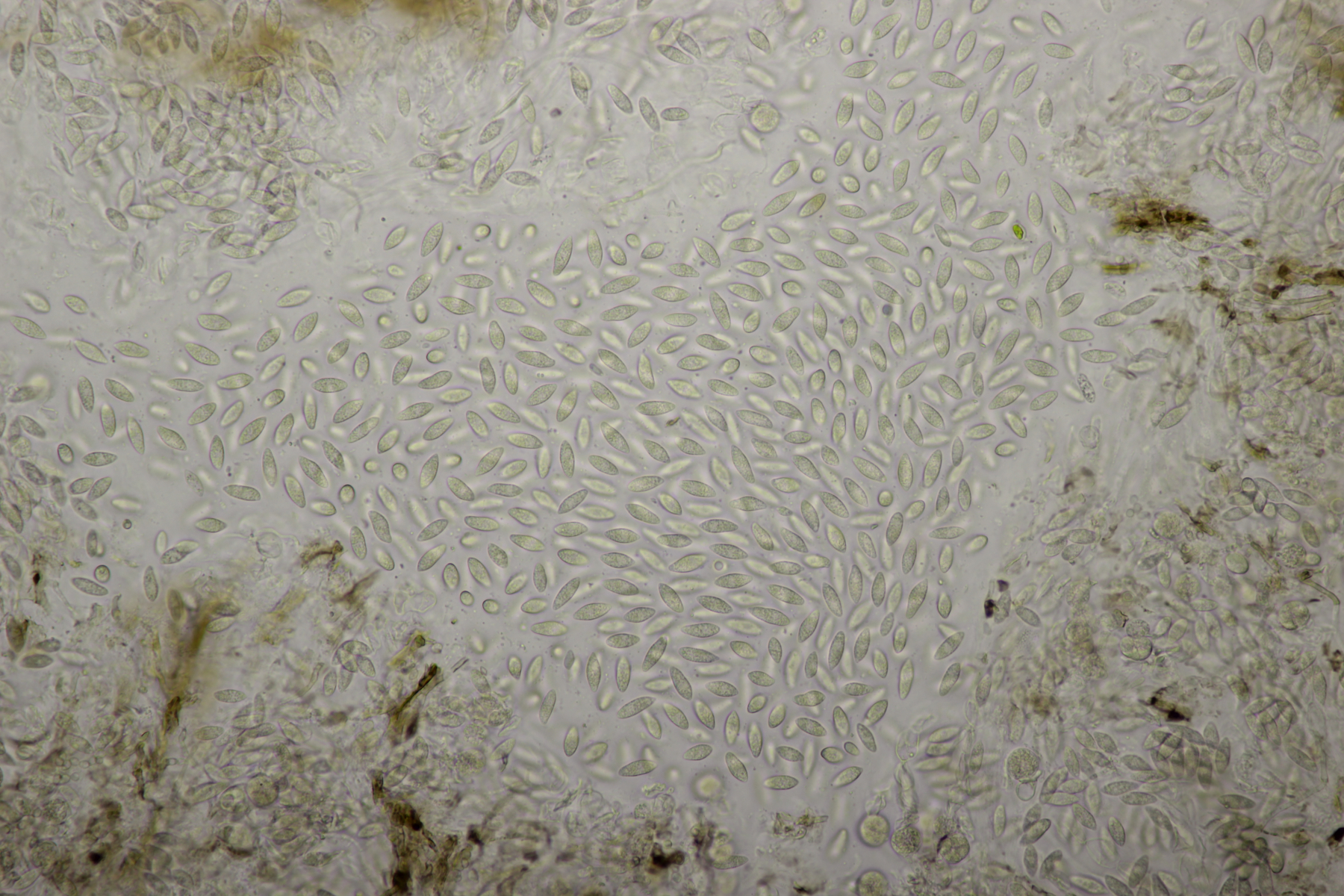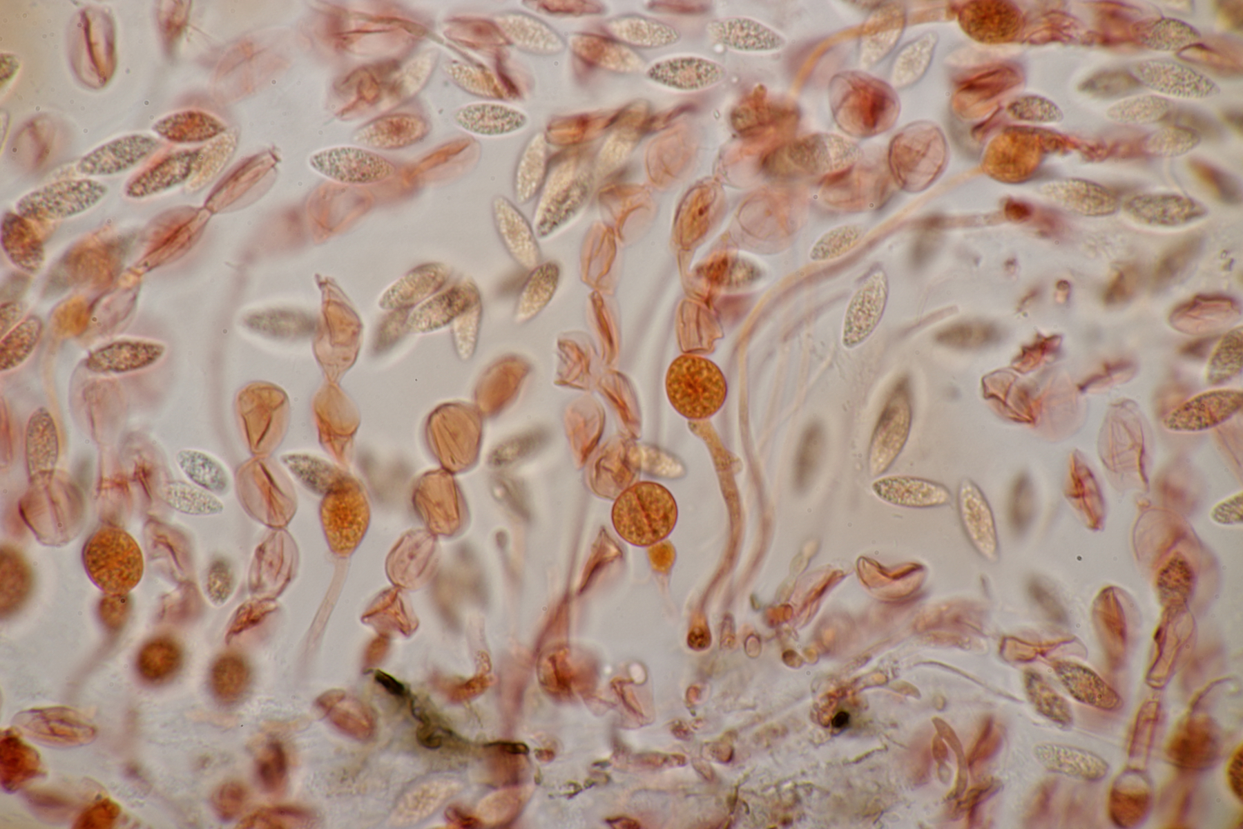 da Ralf und ich uns seit seinem letzten Sirobasidium-Fund immer noch nicht wieder bei Exkursionen getroffen haben, hat er mir den Ast jetzt einfach per Post zugeschickt. Der Fund ist dann natürlich auch direkt unters Mikroskop gewandert und ich denke, daß ich diesmal Bilder machen konnte, die etwas zufriedenstellender als die von 2020 sind.