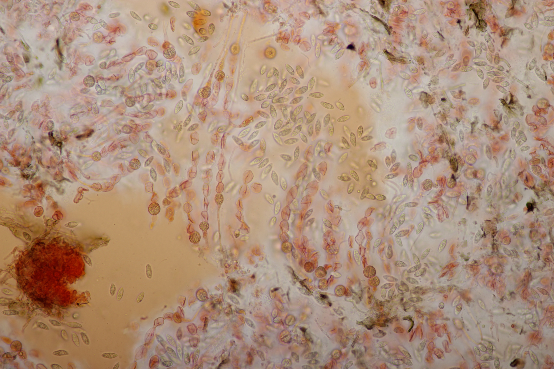 vor ein paar Tagen hatte Ralf G. auf Facebook kleine, weiße Glibberpunkte auf einem Holzstückchen präsentiert, die er in Viersen auf der Süchtelner Höhe gefunden hatte und bei denen er im Mikroskop nur Sporen über Sporen gesehen hat. Ich hatte ihm angeboten, daß er mir das gute Stück gerne mal übergeben kann, was er dann auch bei der gemeinsamen Exkursion in Mönchengladbach am Sonntag tat. Mit dem Mikroskop zeigte sich dann schnell, daß er hier (mal wieder) einen absoluten Glücksgriff getätigt hat, denn es handelt sich um Sirobasidium albidum, einen Heterobasidiomyceten, bei dem die runden Basidien in Ketten gebildet werden, was unterm Mikro sehr hübsch aussieht. Dazu kommt noch, daß der Pilz bis jetzt in Deutschland erst dreimal nachgewiesen wurde. Das ist aber nicht verwunderlich, weil so kleine Pilze, die bei Trockenheit bis zu Unkenntlichkeit zusammenschrumpeln natürlich schnell übersehen sind.
