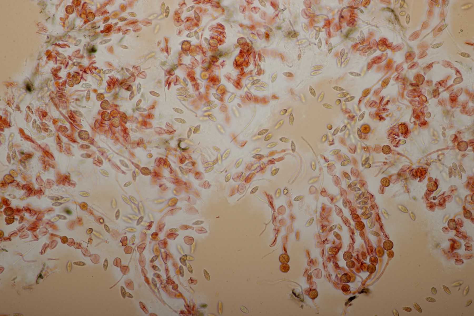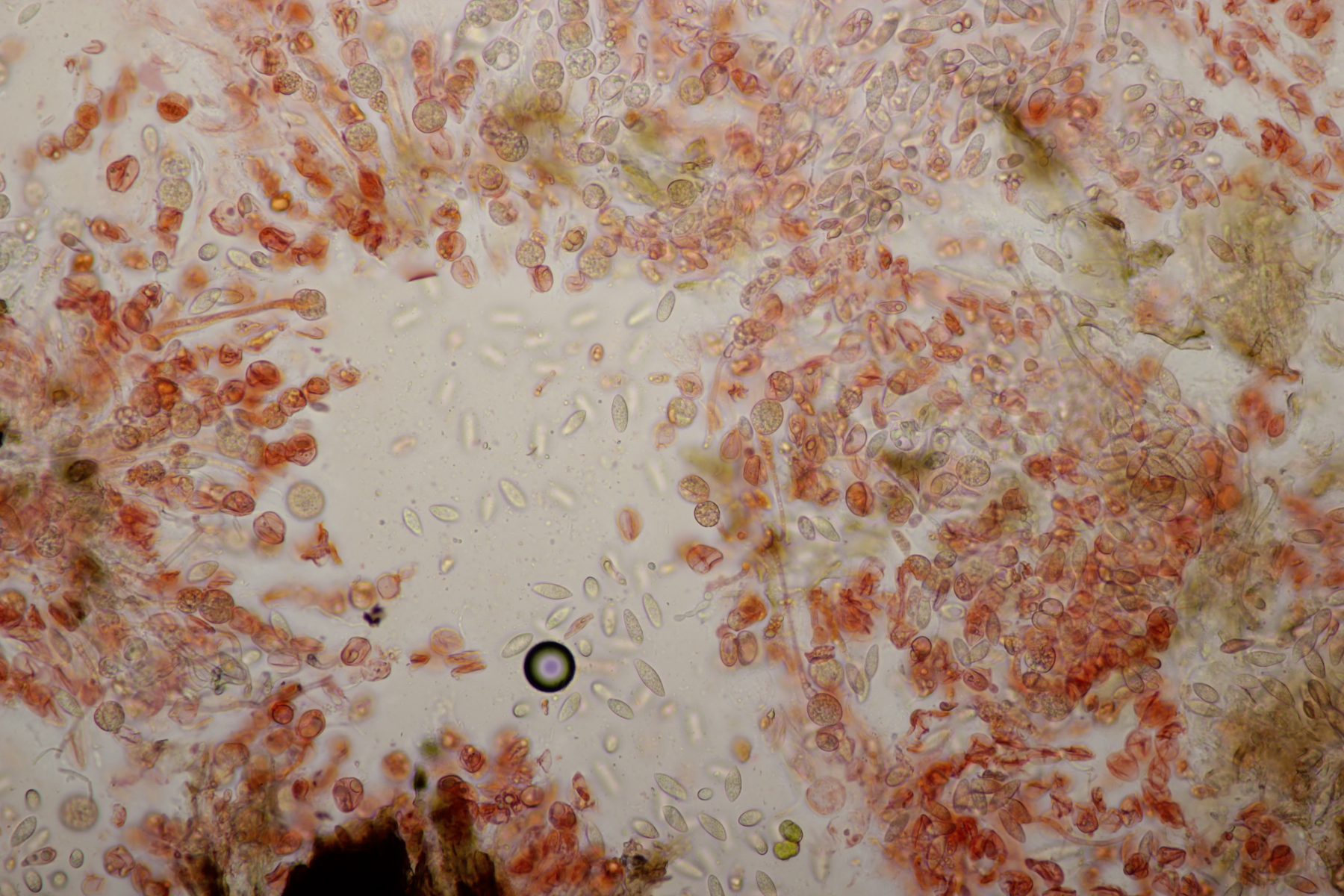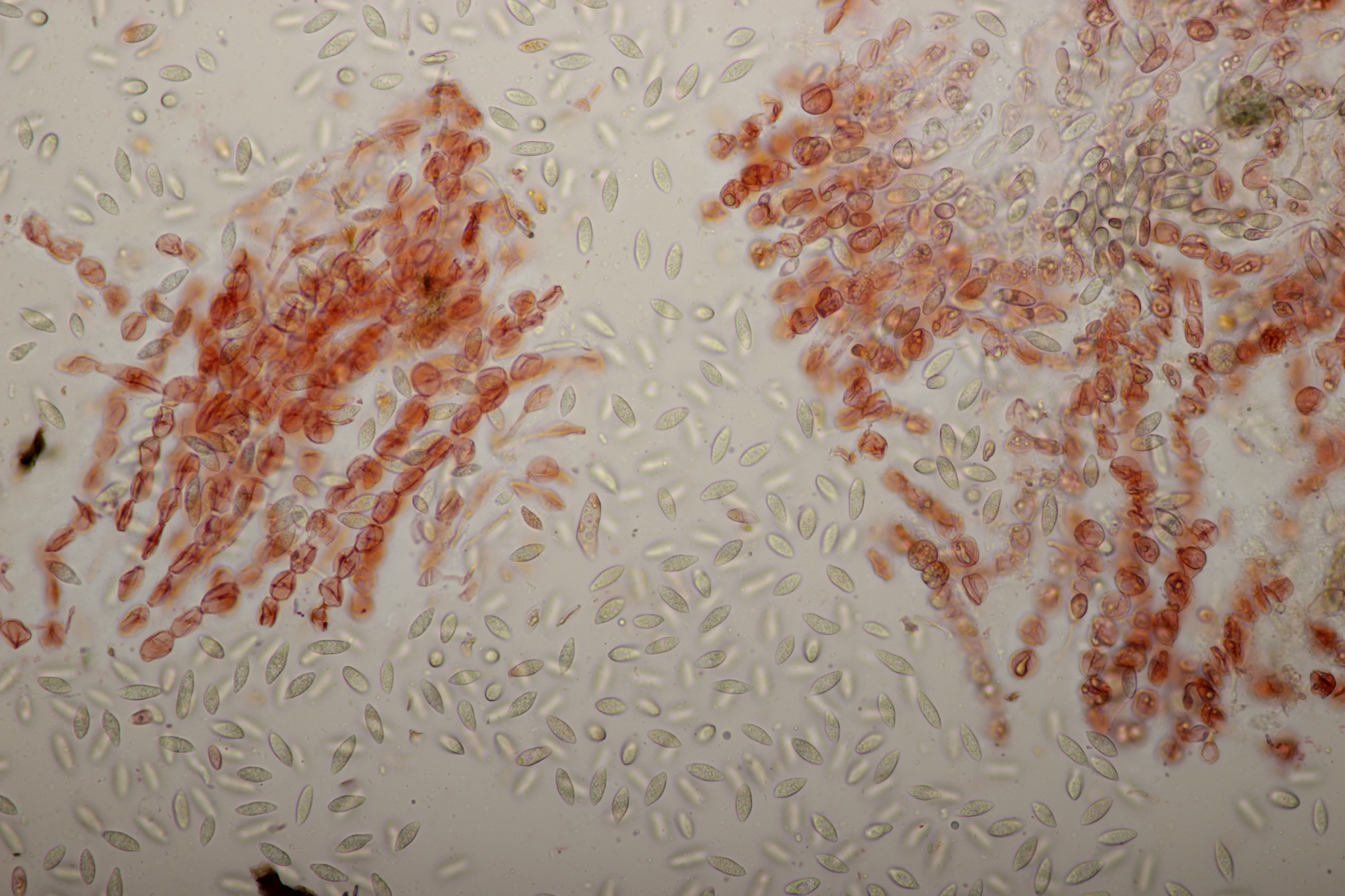 da Ralf und ich uns seit seinem letzten Sirobasidium-Fund immer noch nicht wieder bei Exkursionen getroffen haben, hat er mir den Ast jetzt einfach per Post zugeschickt. Der Fund ist dann natürlich auch direkt unters Mikroskop gewandert und ich denke, daß ich diesmal Bilder machen konnte, die etwas zufriedenstellender als die von 2020 sind.