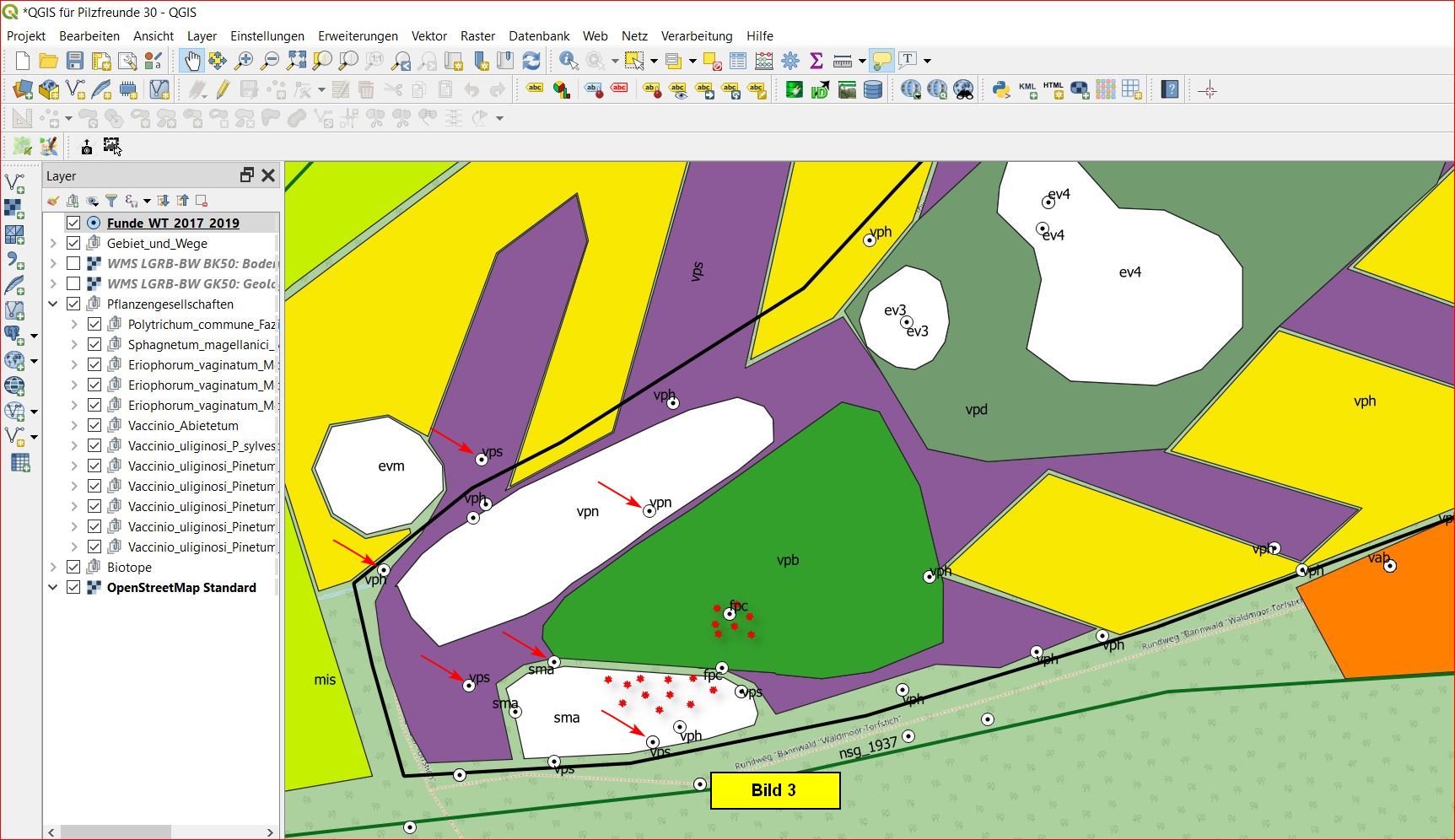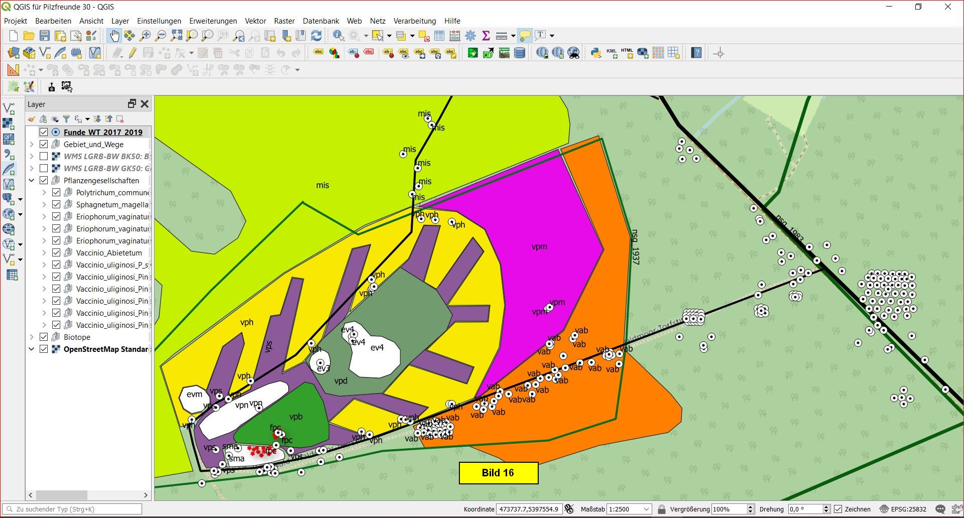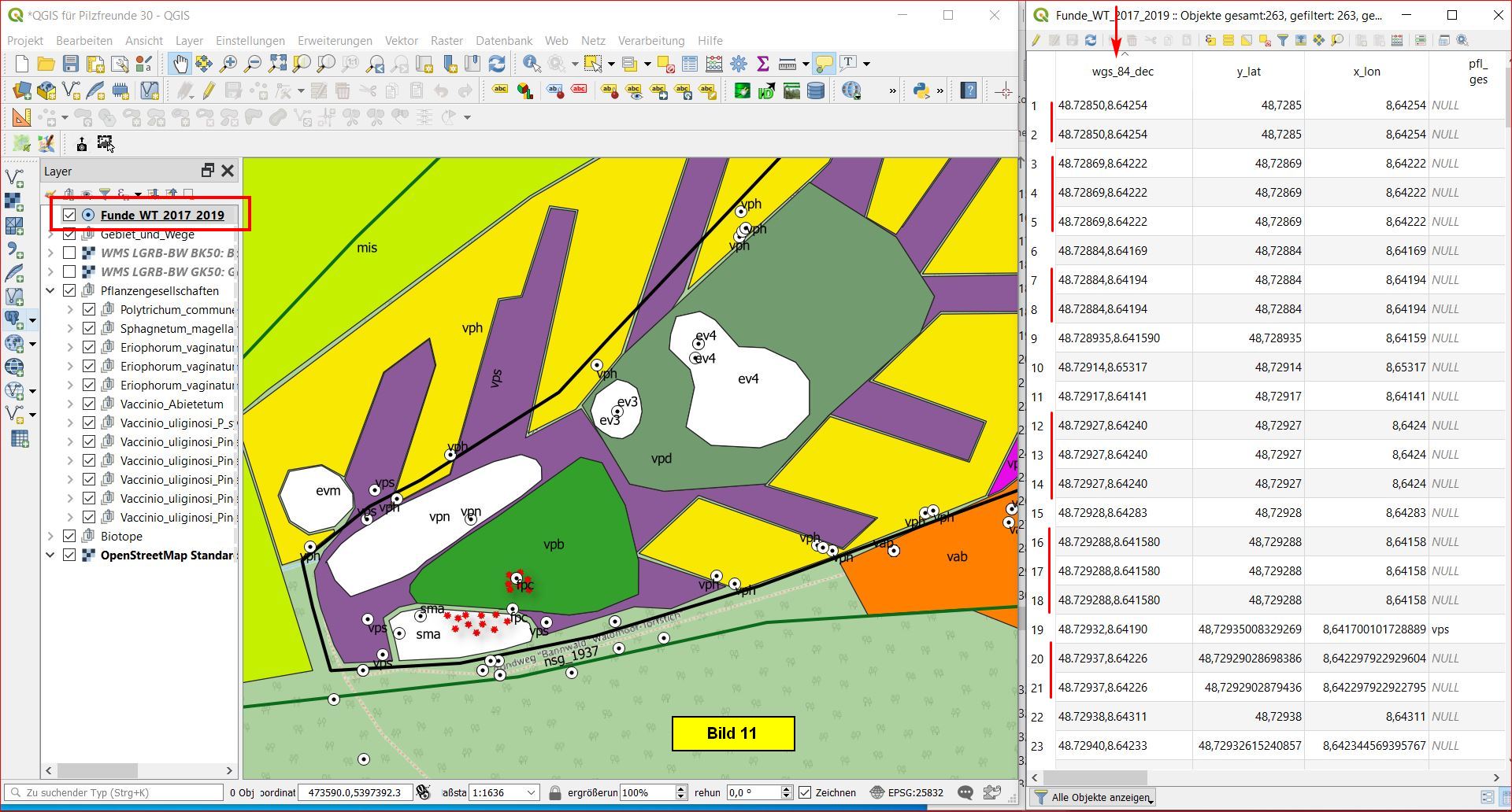 Die Beschriftung der Funde kann man auf Wunsch jetzt natürlich via Eigenschaftentabelle auf den Pilznamen umstellen: