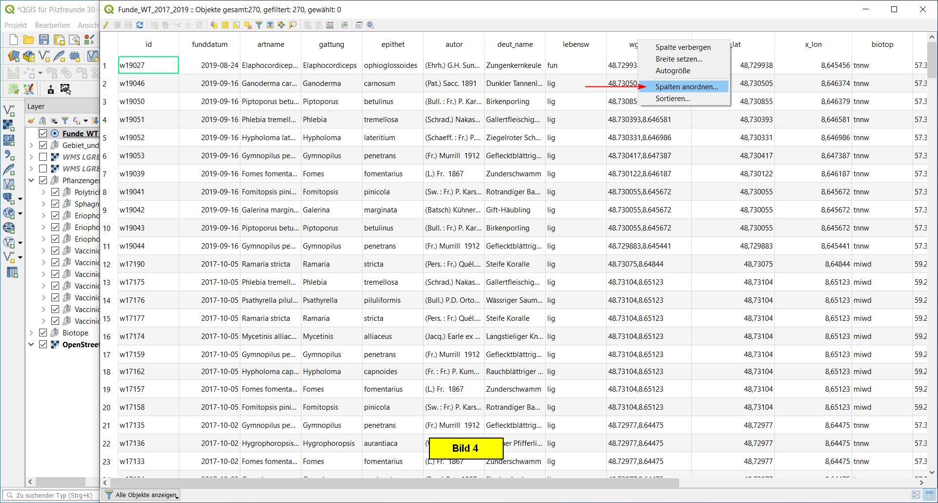 Zur Vorbereitung sollen in der Attributtabelle des Layers Funde_WT_2017_2019 die Spalten wgs_84_dec, y_lat, x_lon, pfl_ges ganz nach links verschoben werden.